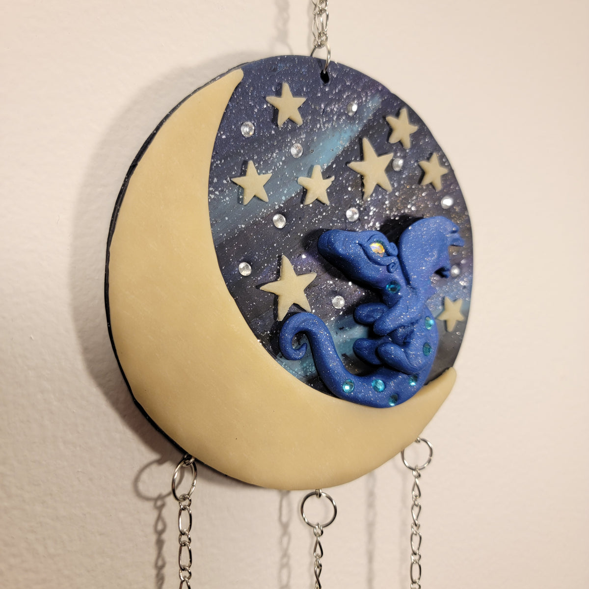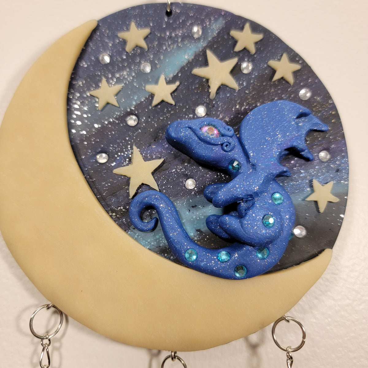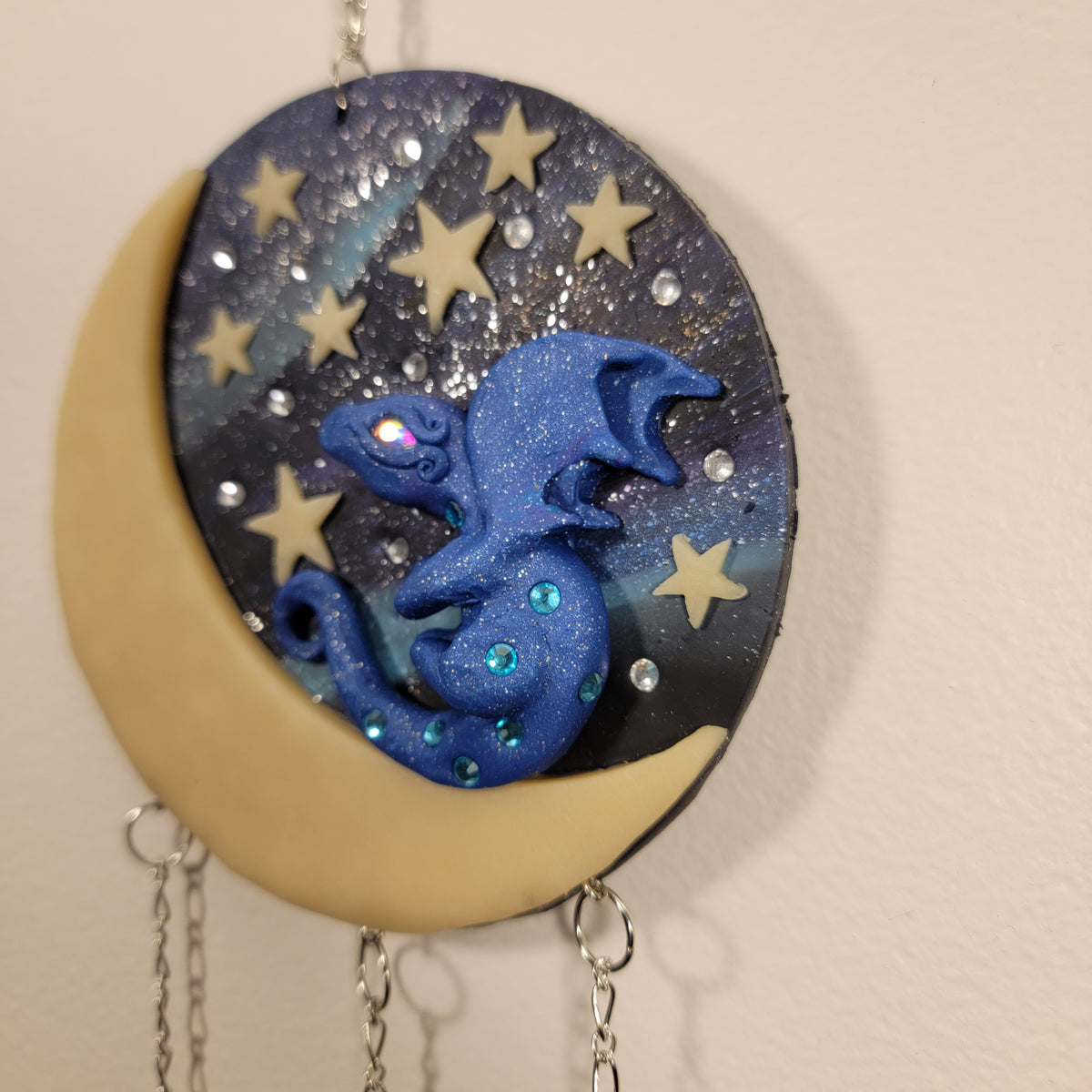 A unique wall hanging made out of polymer clay. This wall hanging features a glittery blue dragon with rhinestone accents sitting on the moon. It is set against a dark background with streaks blue and turquoise that let off a faint glow, giving this wall hanging a bit of extra magic. The dragon is surrounded by stars and rhinestones. There are circles and stars hanging below. The moon and stars glow in the dark! The dragon will glow faintly, but the moon and stars will glow for much longer.