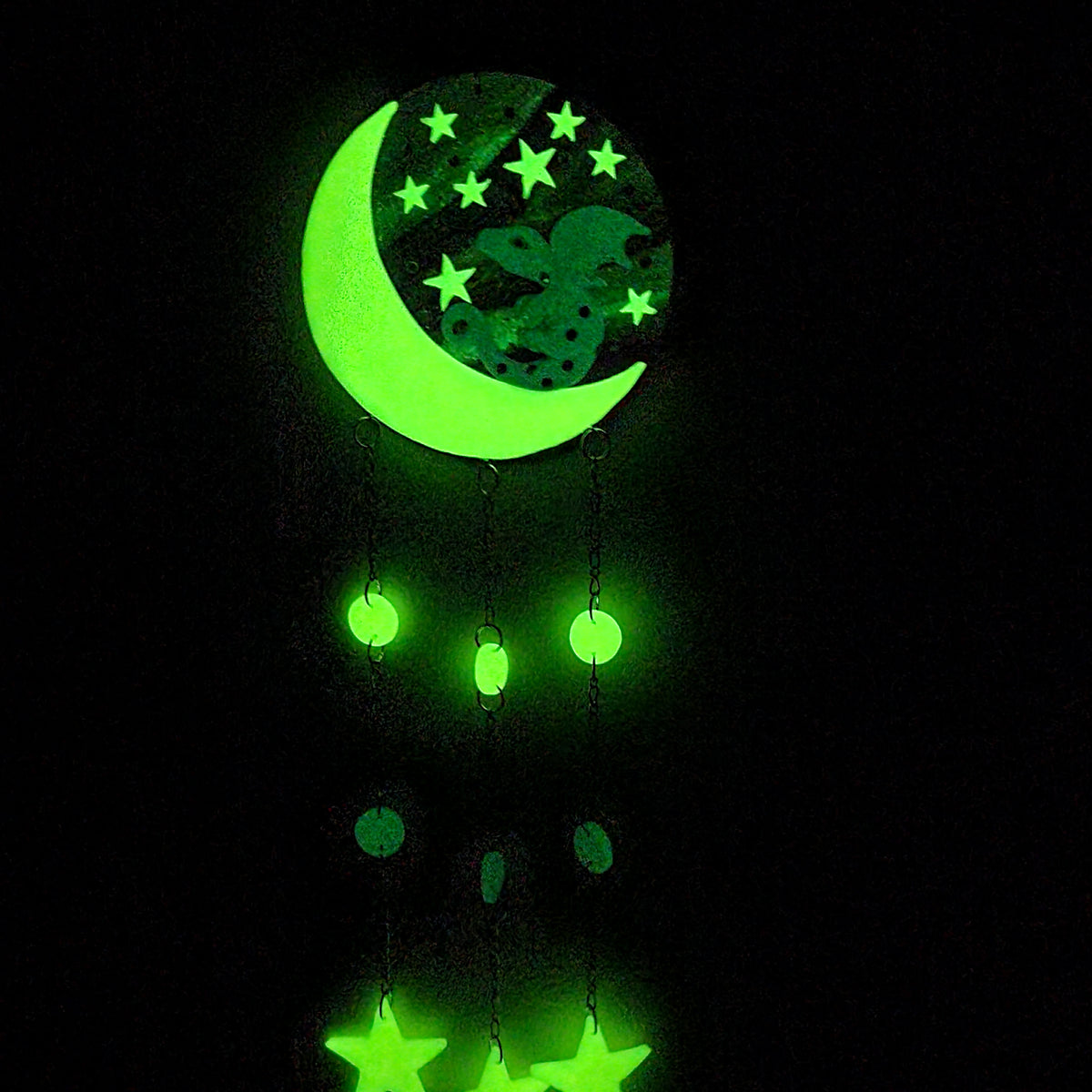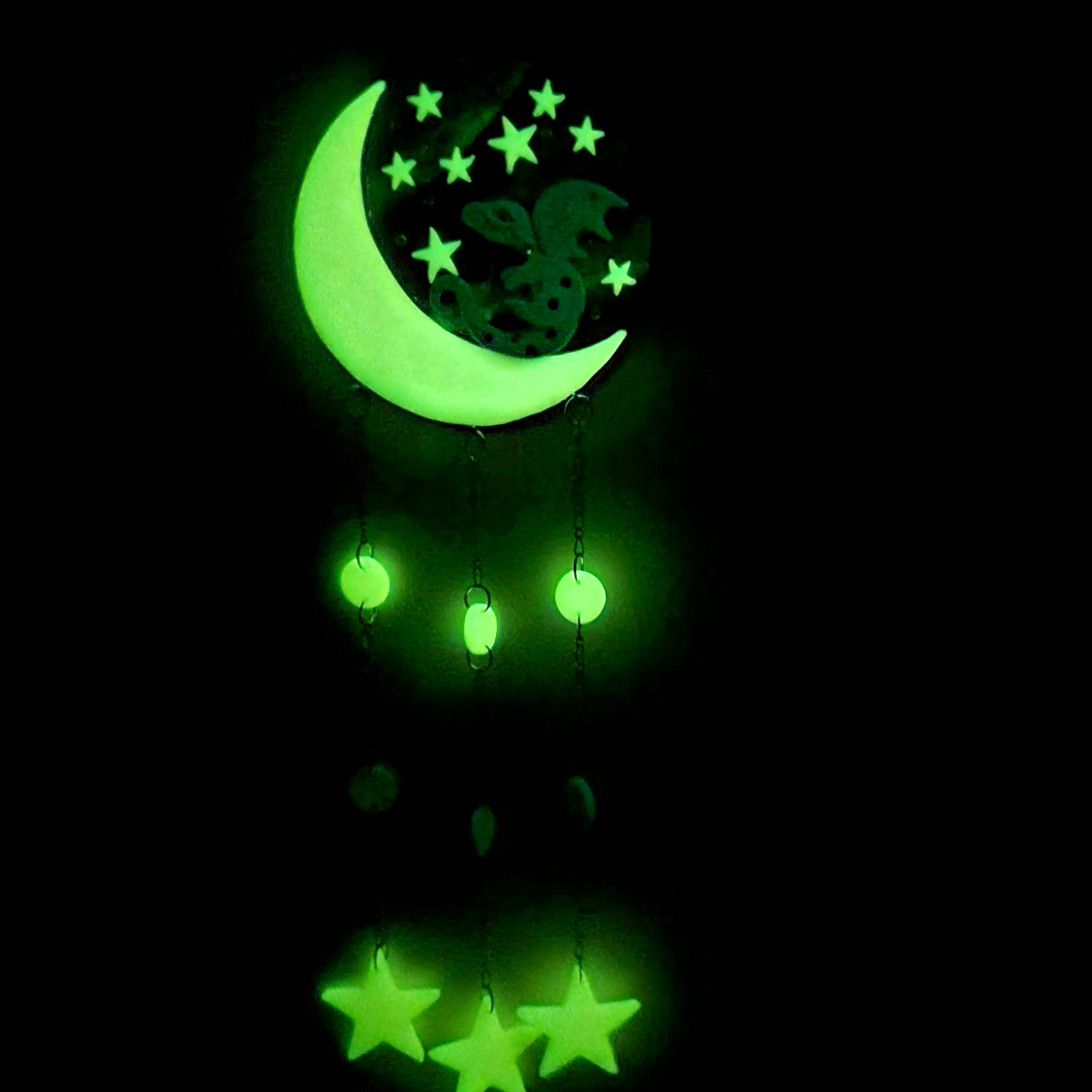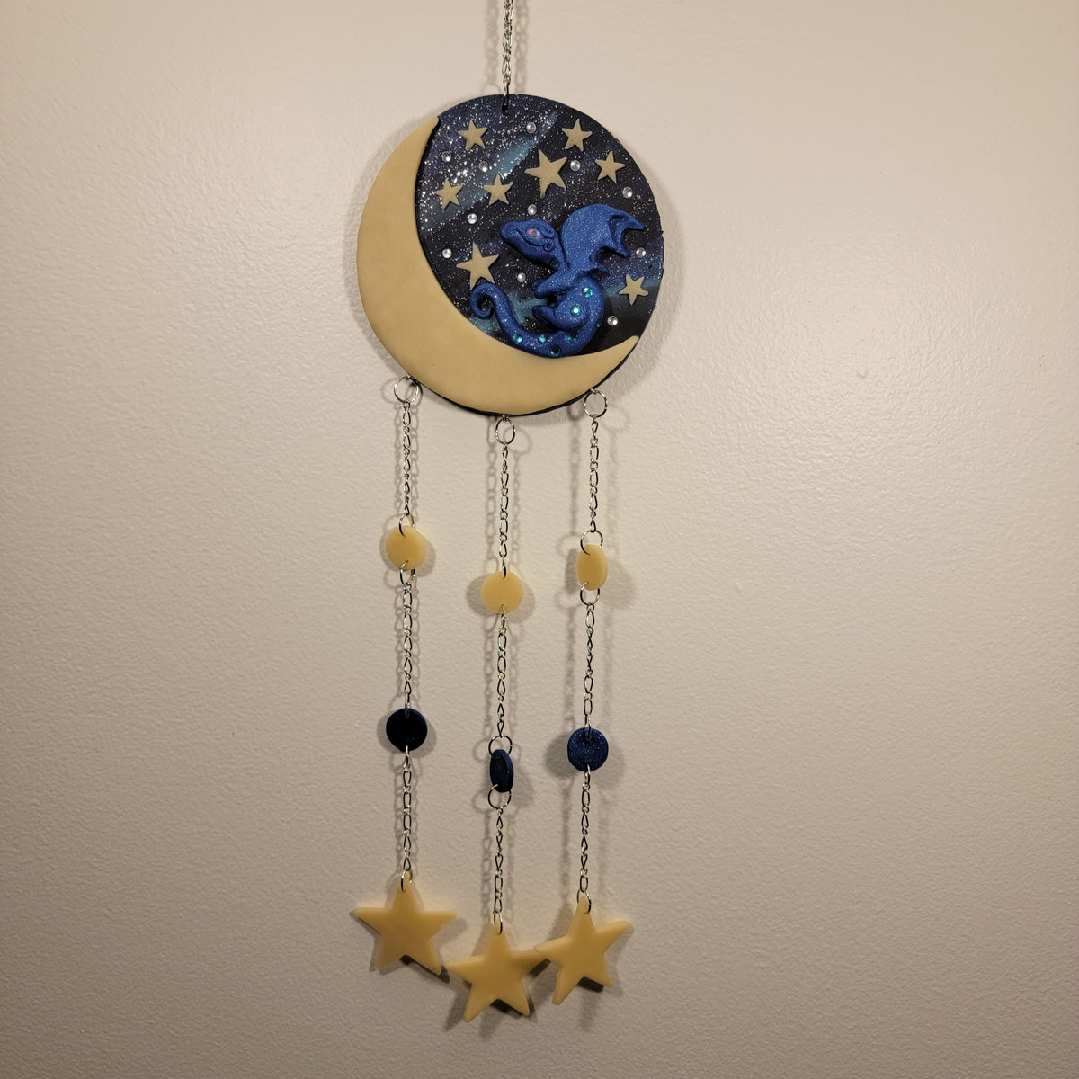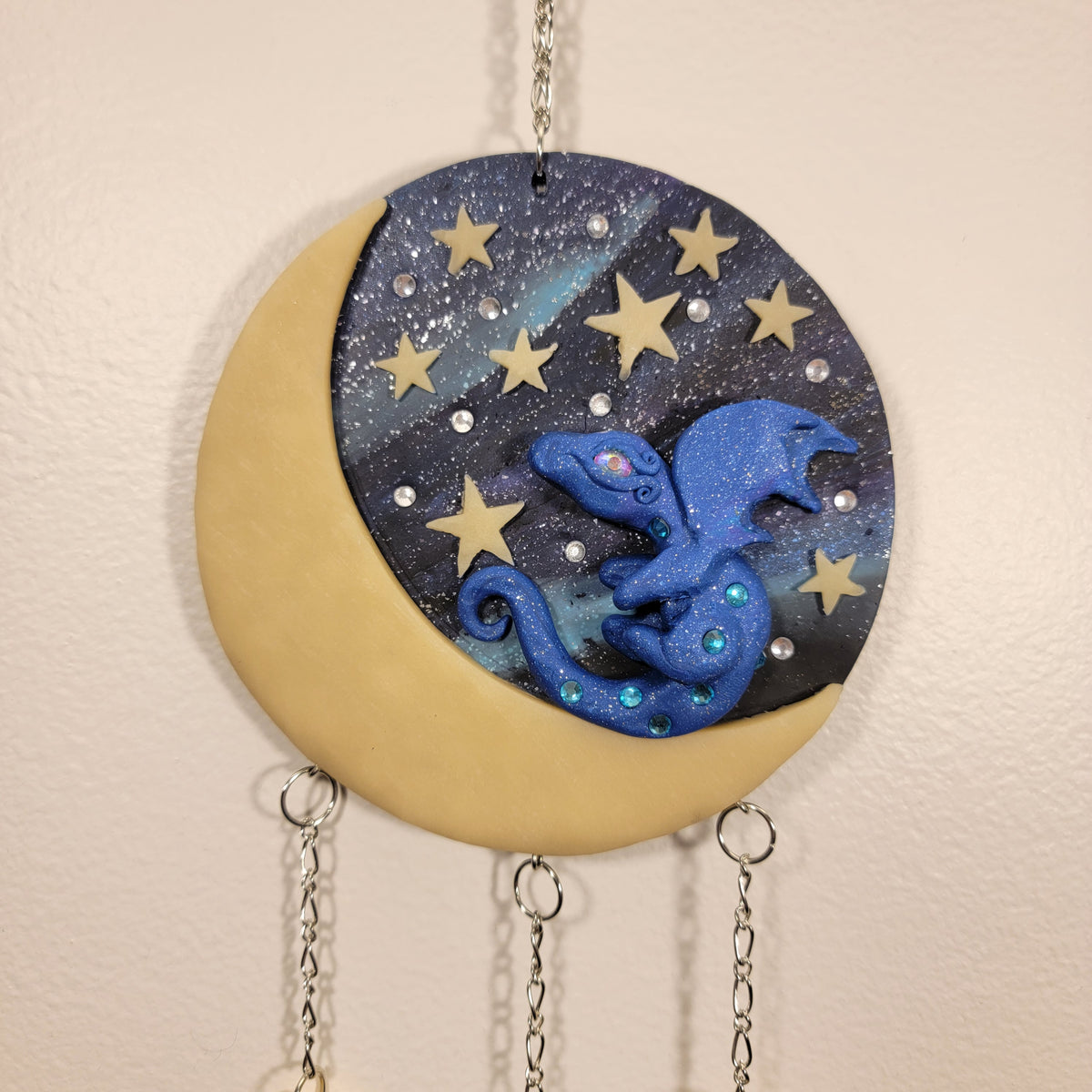 A unique wall hanging made out of polymer clay. This wall hanging features a glittery blue dragon with rhinestone accents sitting on the moon. It is set against a dark background with streaks blue and turquoise that let off a faint glow, giving this wall hanging a bit of extra magic. The dragon is surrounded by stars and rhinestones. There are circles and stars hanging below. The moon and stars glow in the dark! The dragon will glow faintly, but the moon and stars will glow for much longer.