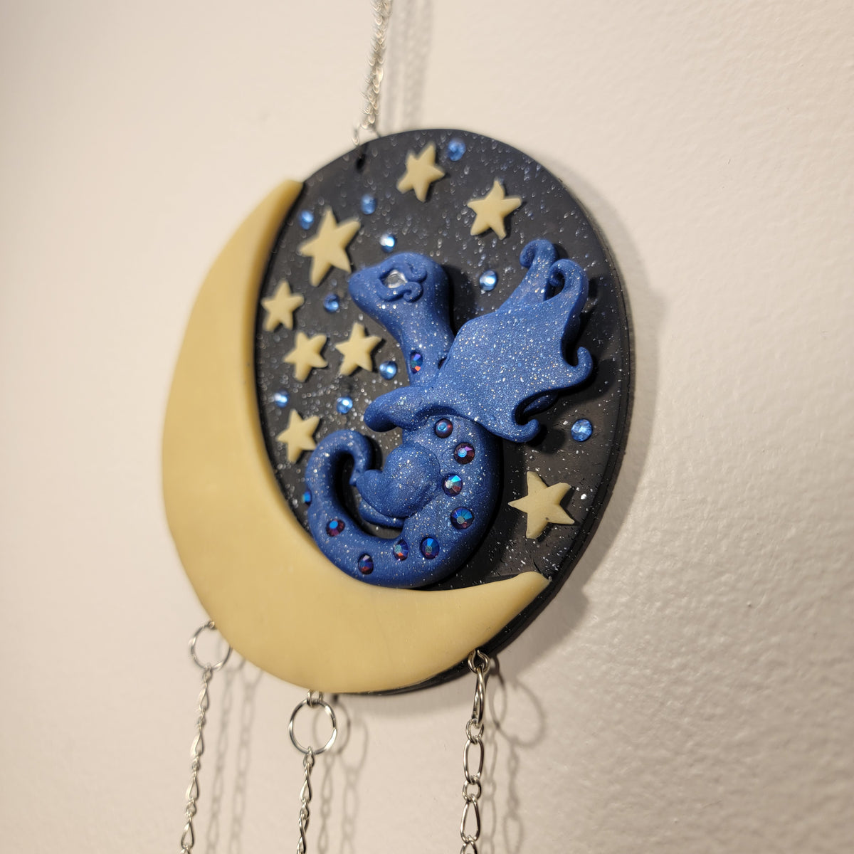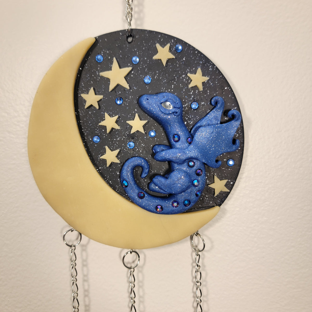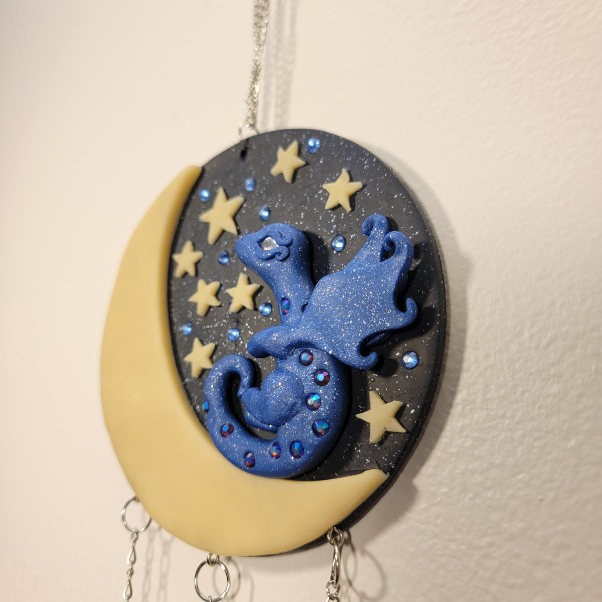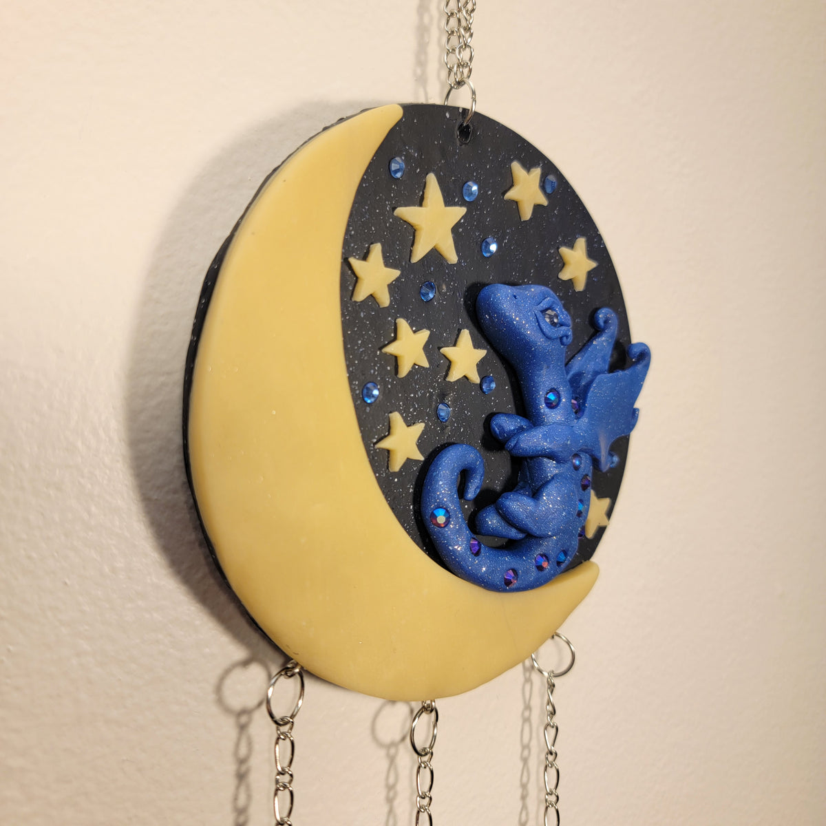 A unique wall hanging made out of polymer clay. This wall hanging features a glittery blue dragon with iridescent rhinestone accents sitting on the moon against a dark background, surrounded by stars and rhinestones. There are circles and stars hanging below. The moon and stars glow in the dark! The dragon will glow faintly, but the moon and stars will glow for much longer.