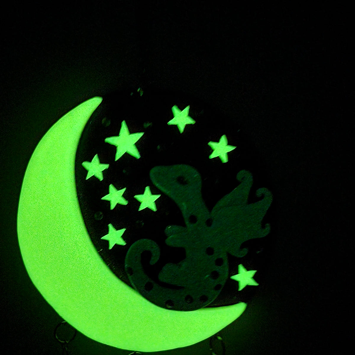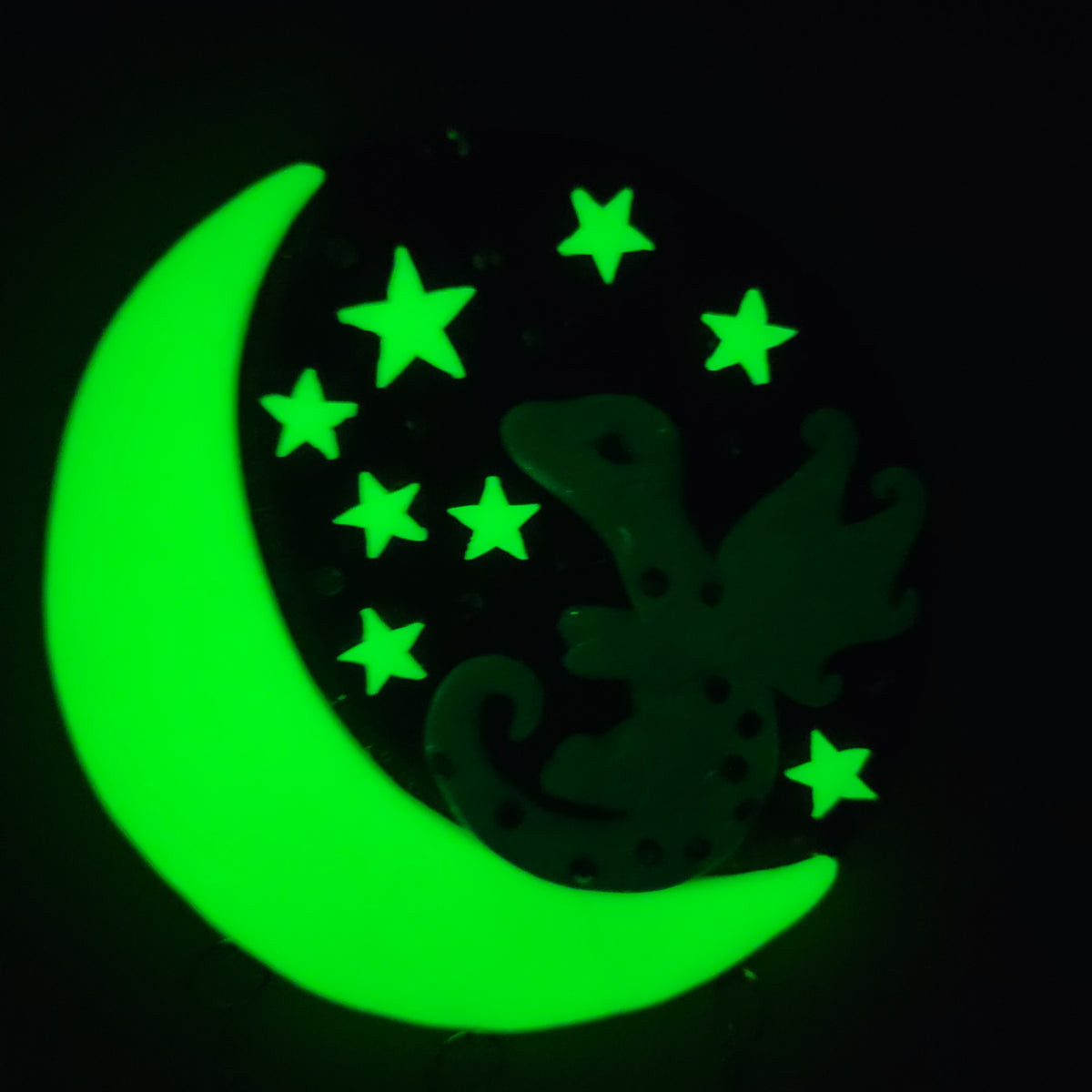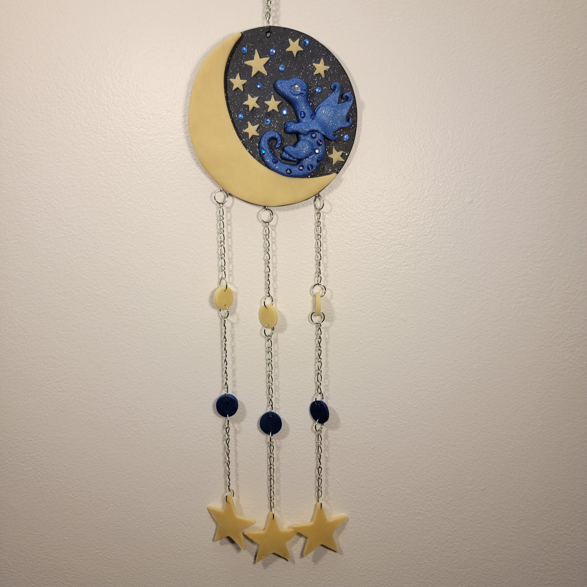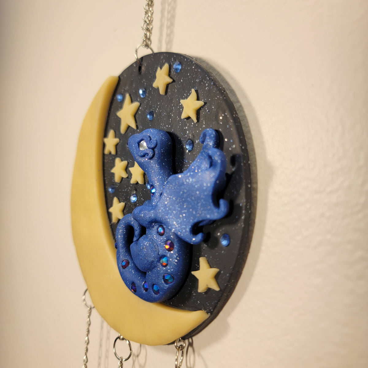 A unique wall hanging made out of polymer clay. This wall hanging features a glittery blue dragon with iridescent rhinestone accents sitting on the moon against a dark background, surrounded by stars and rhinestones. There are circles and stars hanging below. The moon and stars glow in the dark! The dragon will glow faintly, but the moon and stars will glow for much longer.