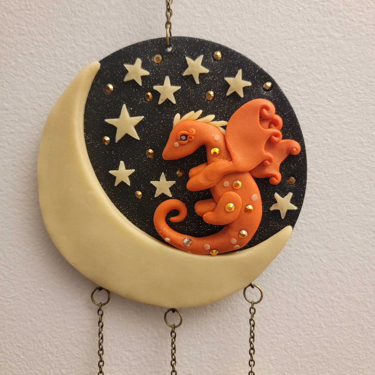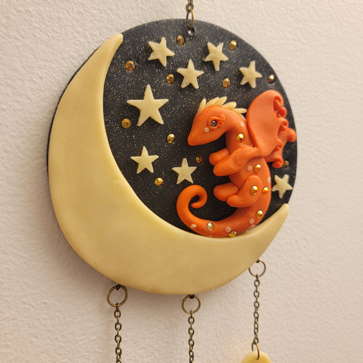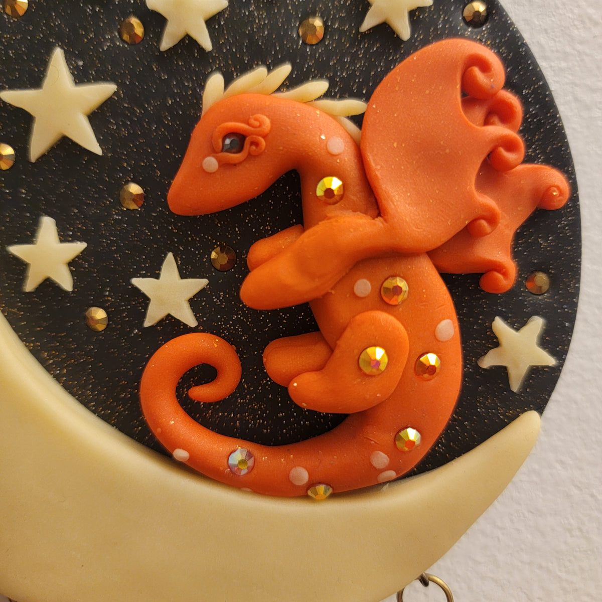 A unique wall hanging made out of polymer clay. This wall hanging features an orange dragon with spots and rhinestones sitting on the moon against a black background with gold glitter, surrounded by stars and rhinestones. There are circles and stars hanging below. The moon and stars glow in the dark! The dragon will glow faintly, but the moon and stars will glow for much longer. Of all the dragons, this one has the brightest glow.