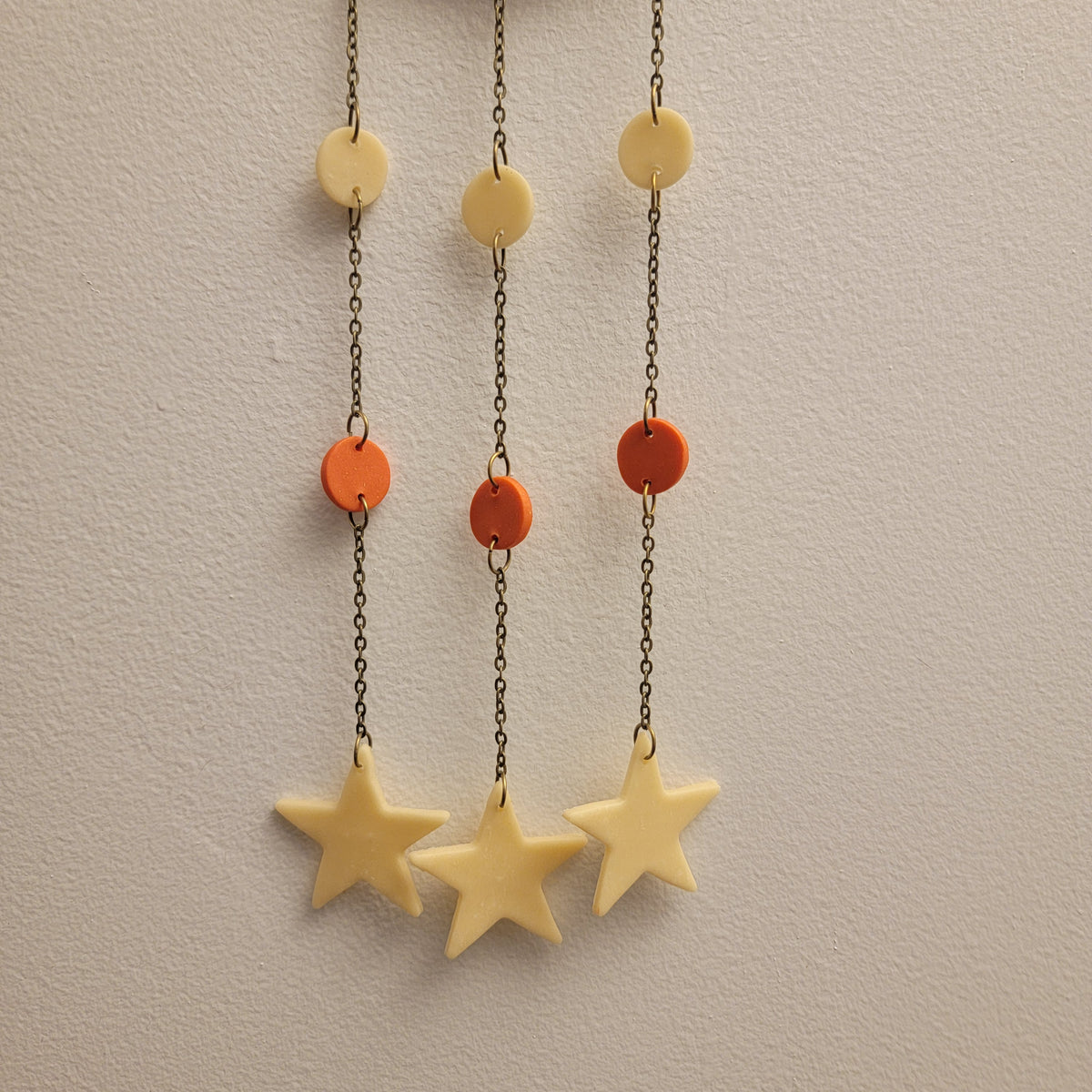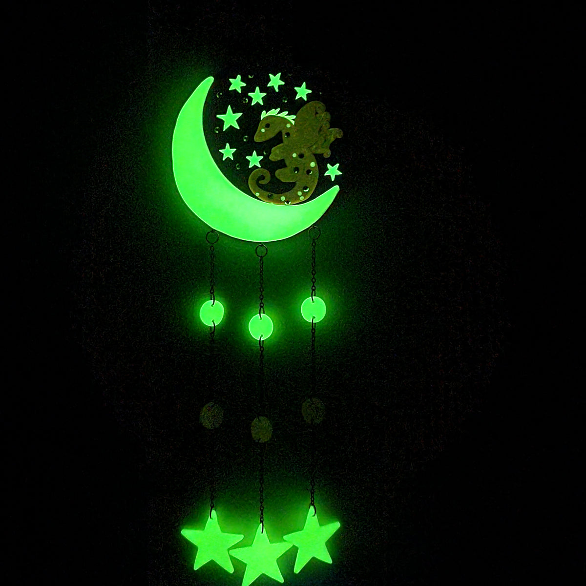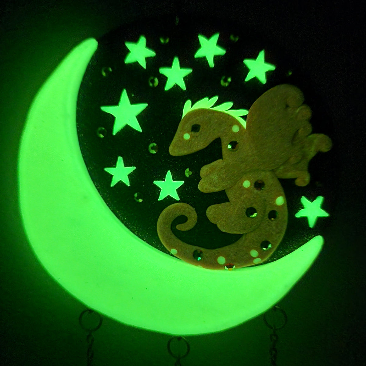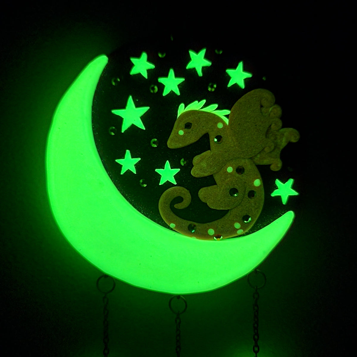 A unique wall hanging made out of polymer clay. This wall hanging features an orange dragon with spots and rhinestones sitting on the moon against a black background with gold glitter, surrounded by stars and rhinestones. There are circles and stars hanging below. The moon and stars glow in the dark! The dragon will glow faintly, but the moon and stars will glow for much longer. Of all the dragons, this one has the brightest glow.