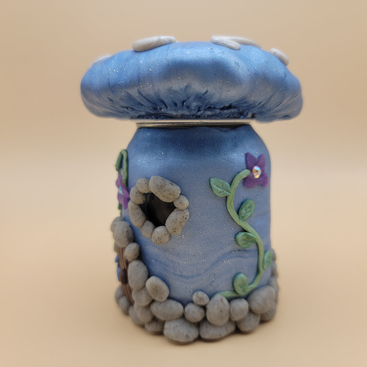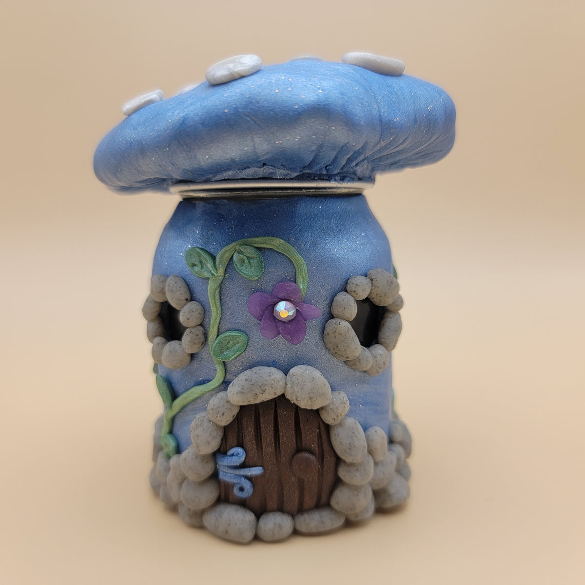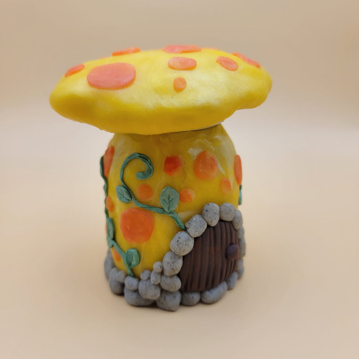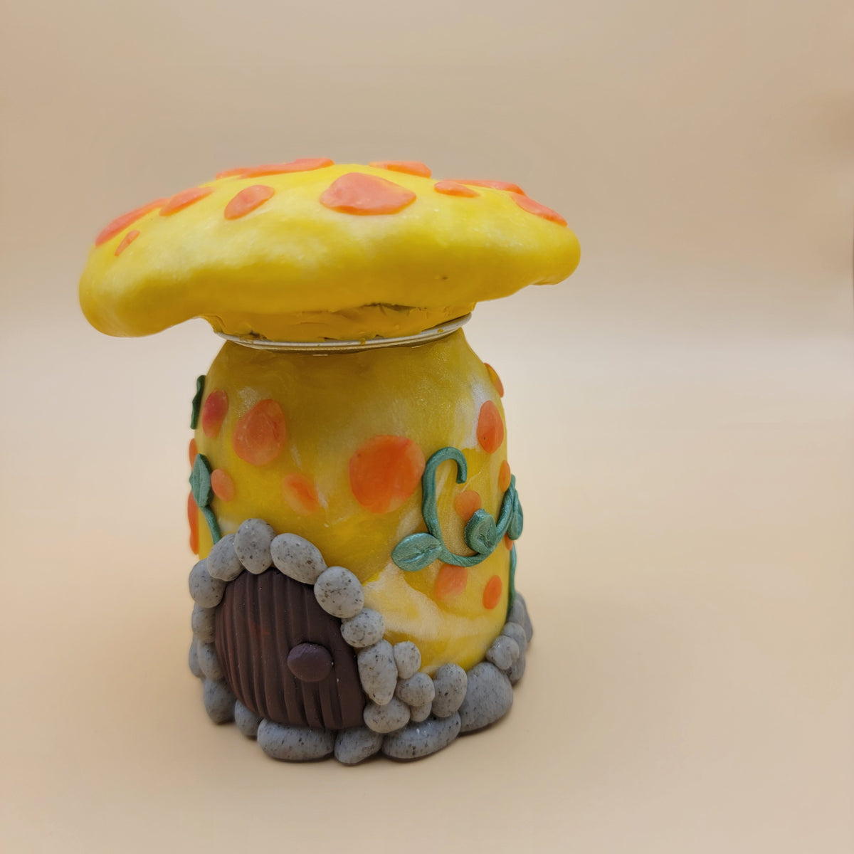 Polymer clay fairy house in the shape of a mushroom! Each house is handmade and one of a kind, built around a glass jar so it can be opened and used for keepsakes, fairy lights, or whatever you can dream up! Mushroom fairy houses are about 3.5 inches tall.