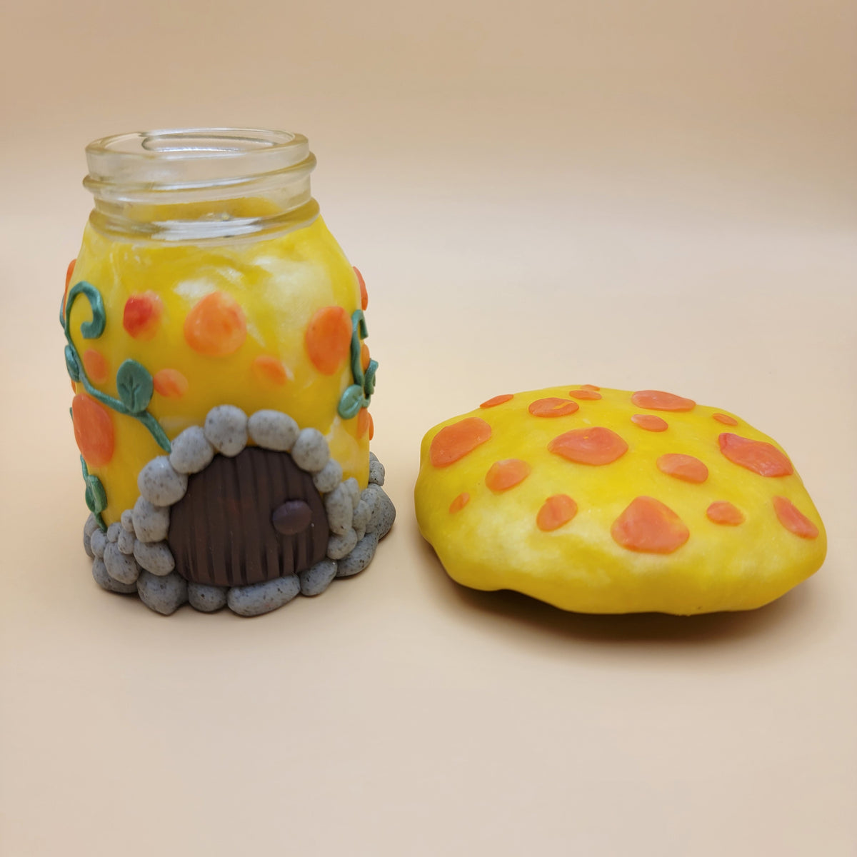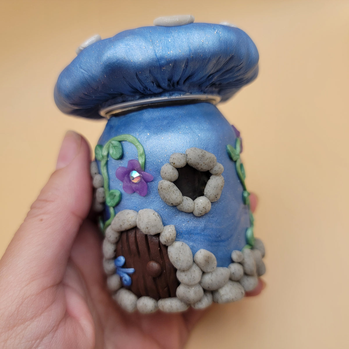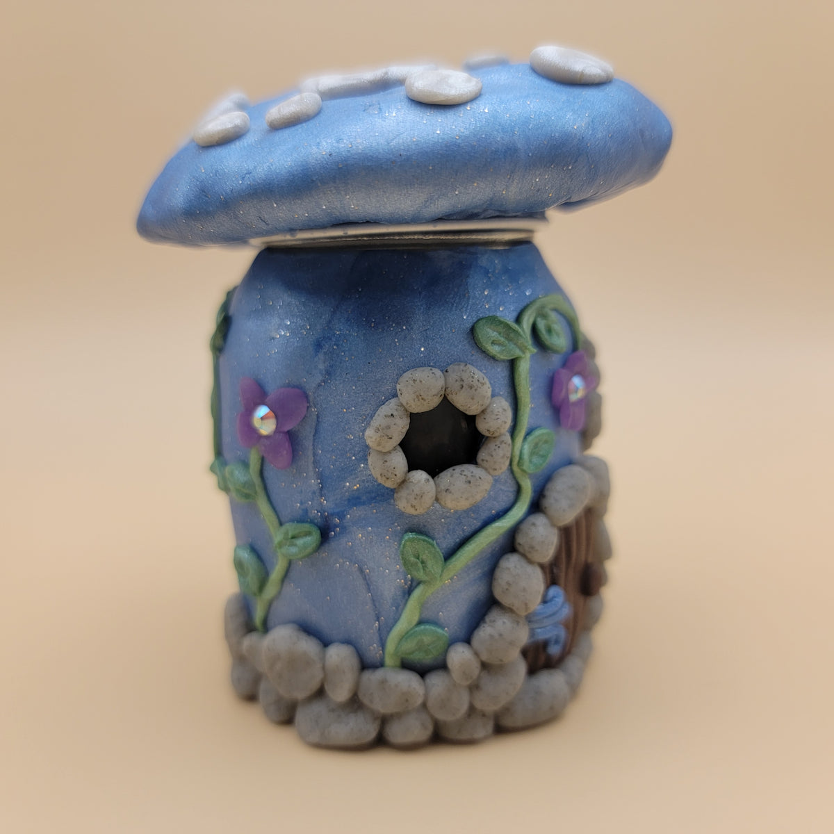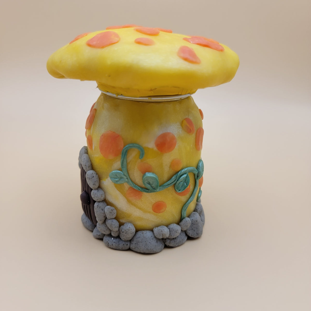 Polymer clay fairy house in the shape of a mushroom! Each house is handmade and one of a kind, built around a glass jar so it can be opened and used for keepsakes, fairy lights, or whatever you can dream up! Mushroom fairy houses are about 3.5 inches tall.