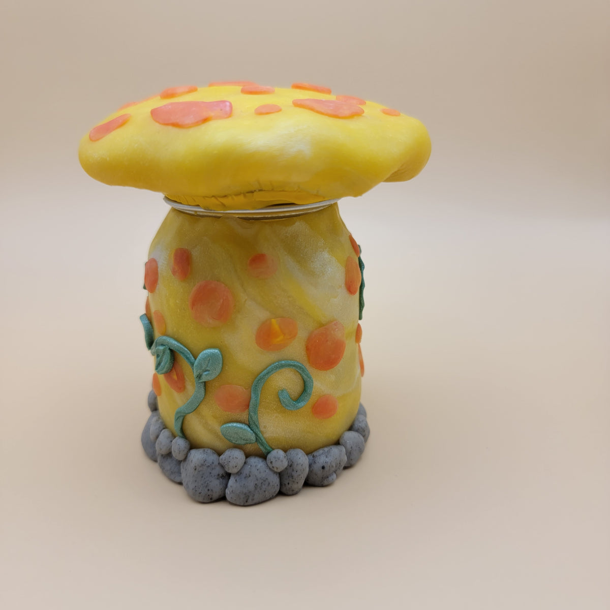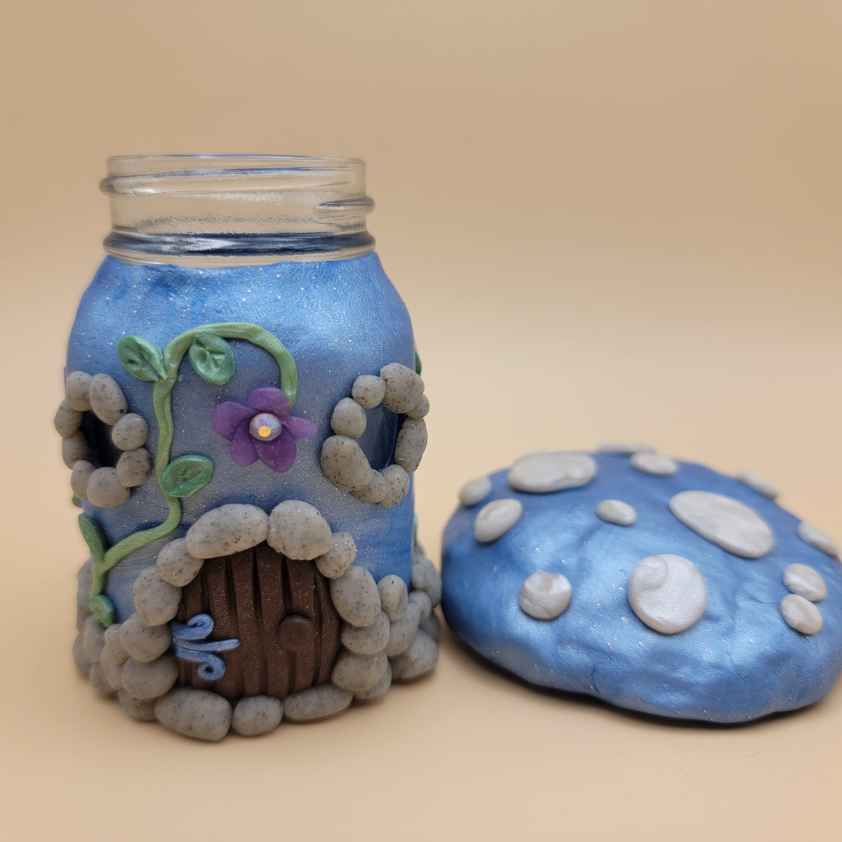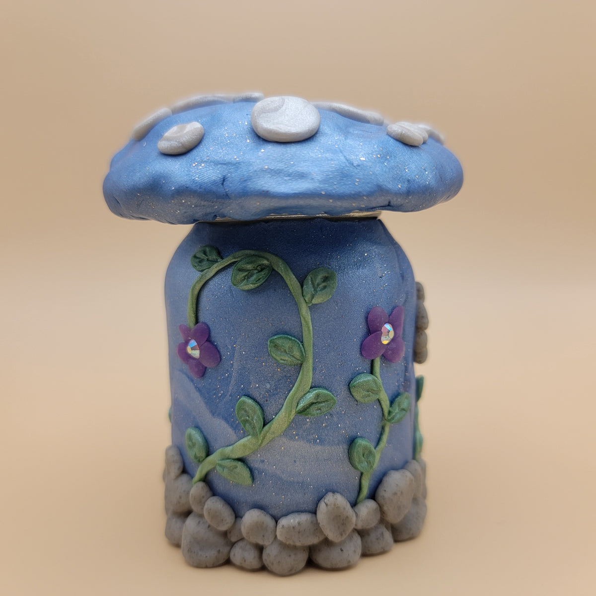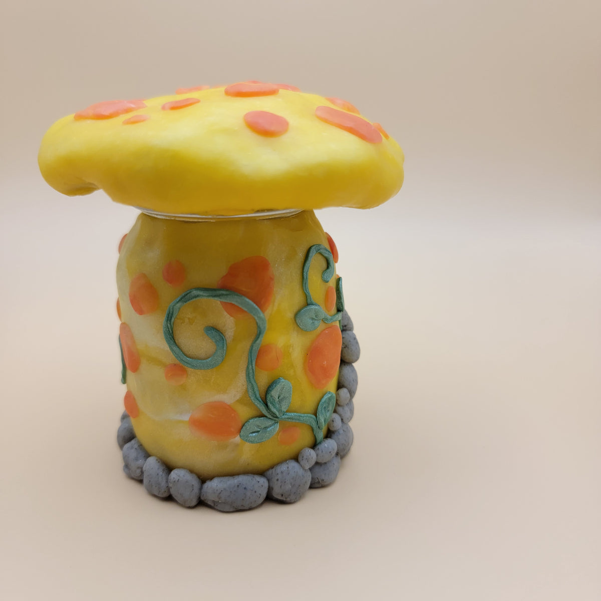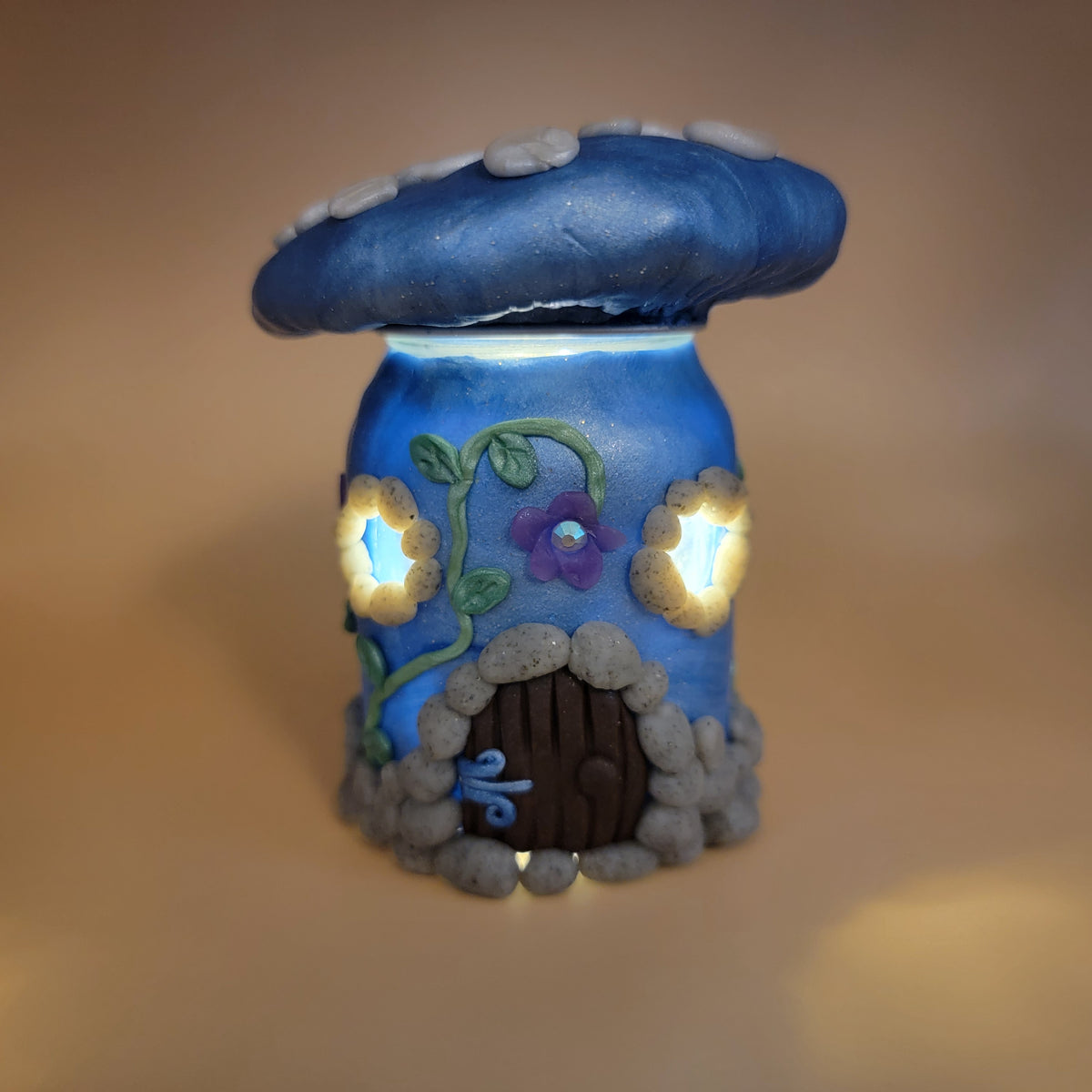 Polymer clay fairy house in the shape of a mushroom! Each house is handmade and one of a kind, built around a glass jar so it can be opened and used for keepsakes, fairy lights, or whatever you can dream up! Mushroom fairy houses are about 3.5 inches tall.