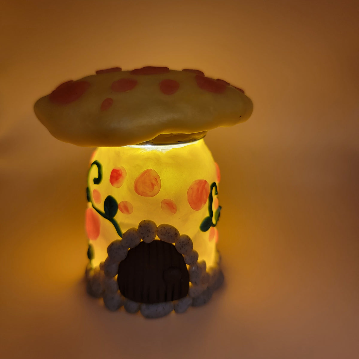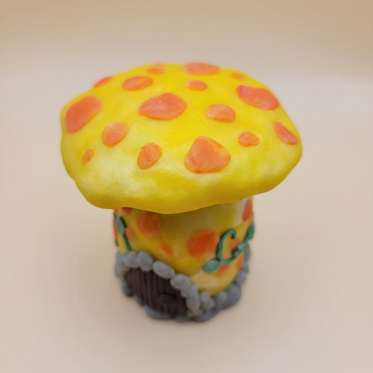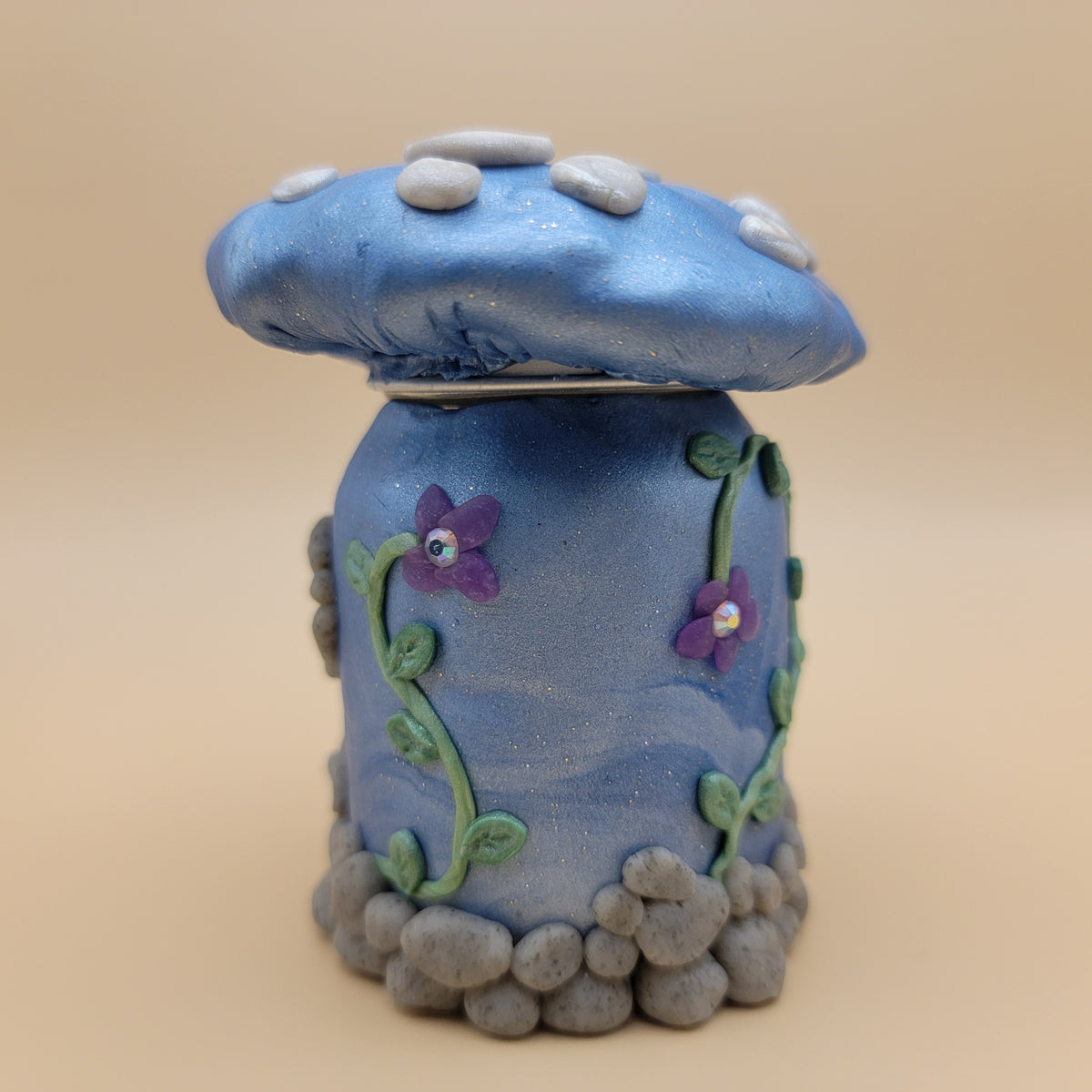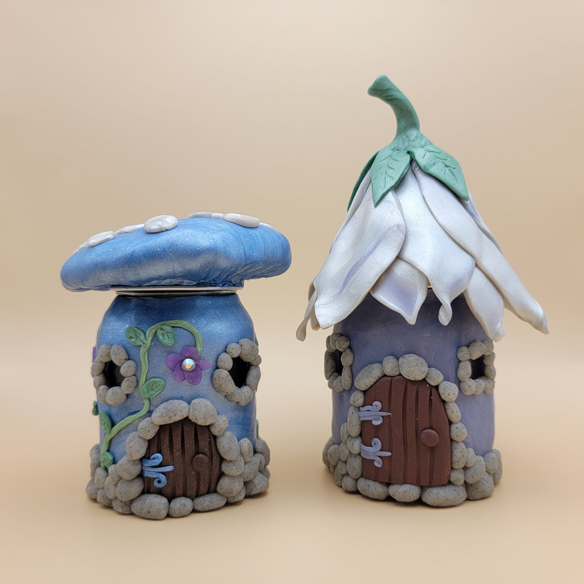 Polymer clay fairy house in the shape of a mushroom! Each house is handmade and one of a kind, built around a glass jar so it can be opened and used for keepsakes, fairy lights, or whatever you can dream up! Mushroom fairy houses are about 3.5 inches tall.