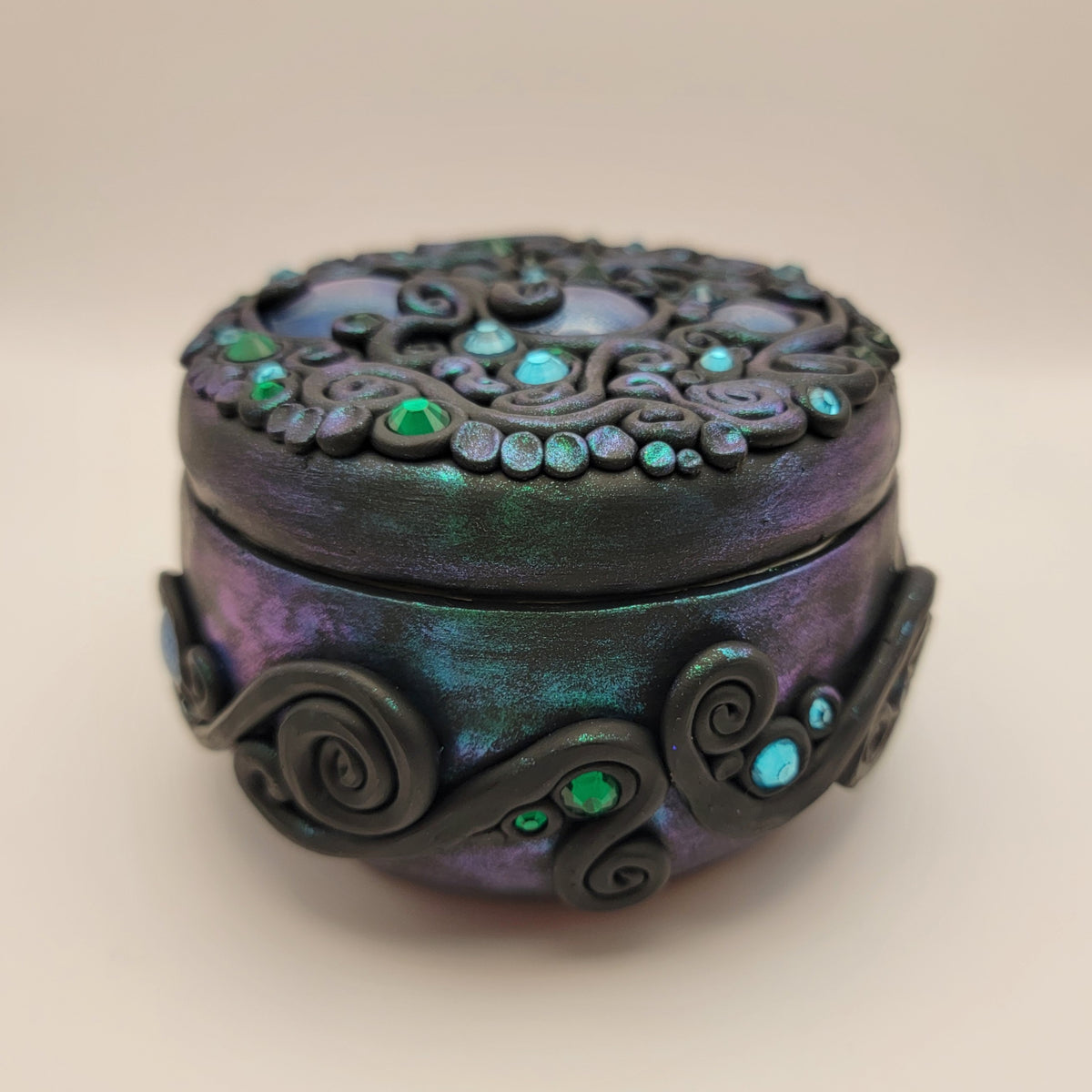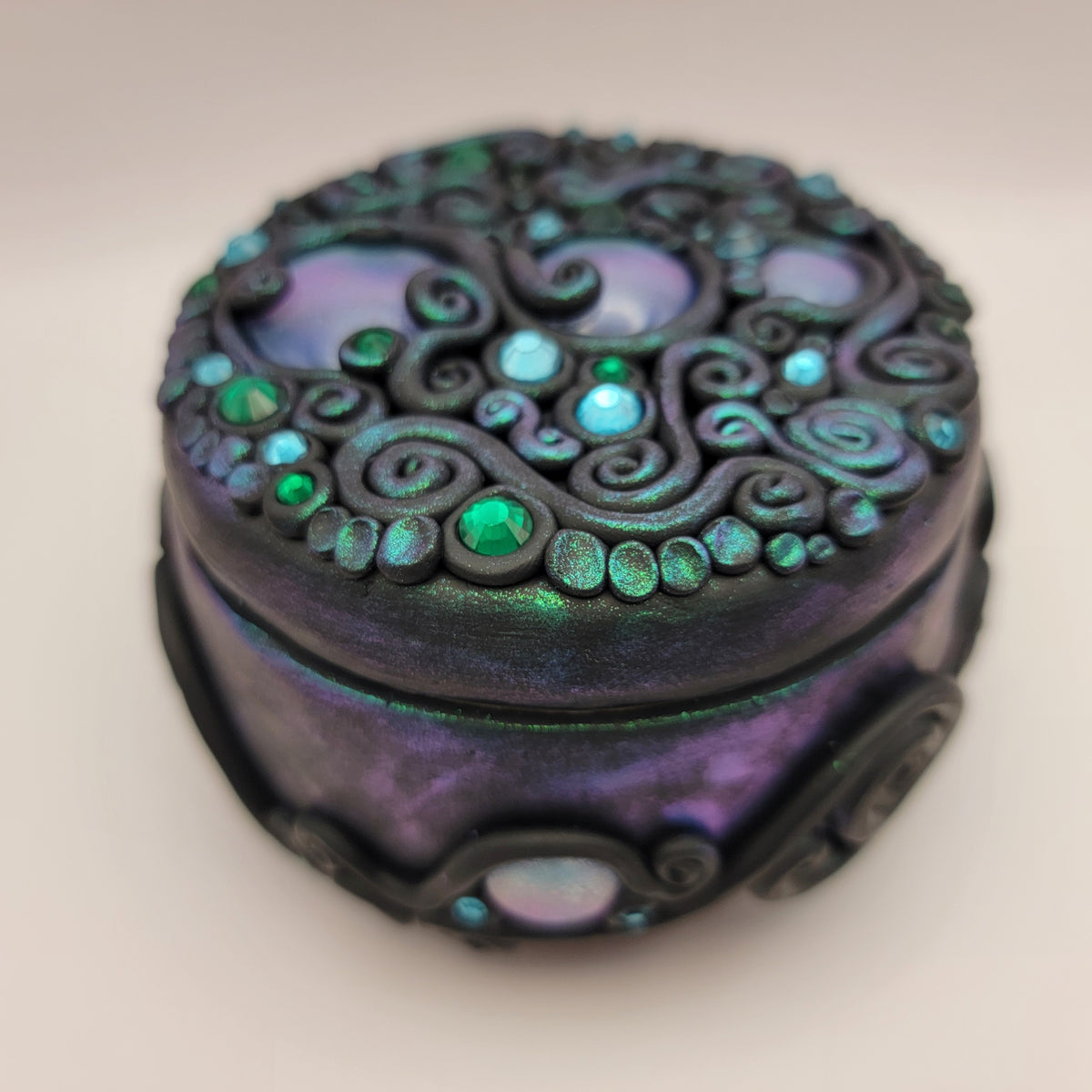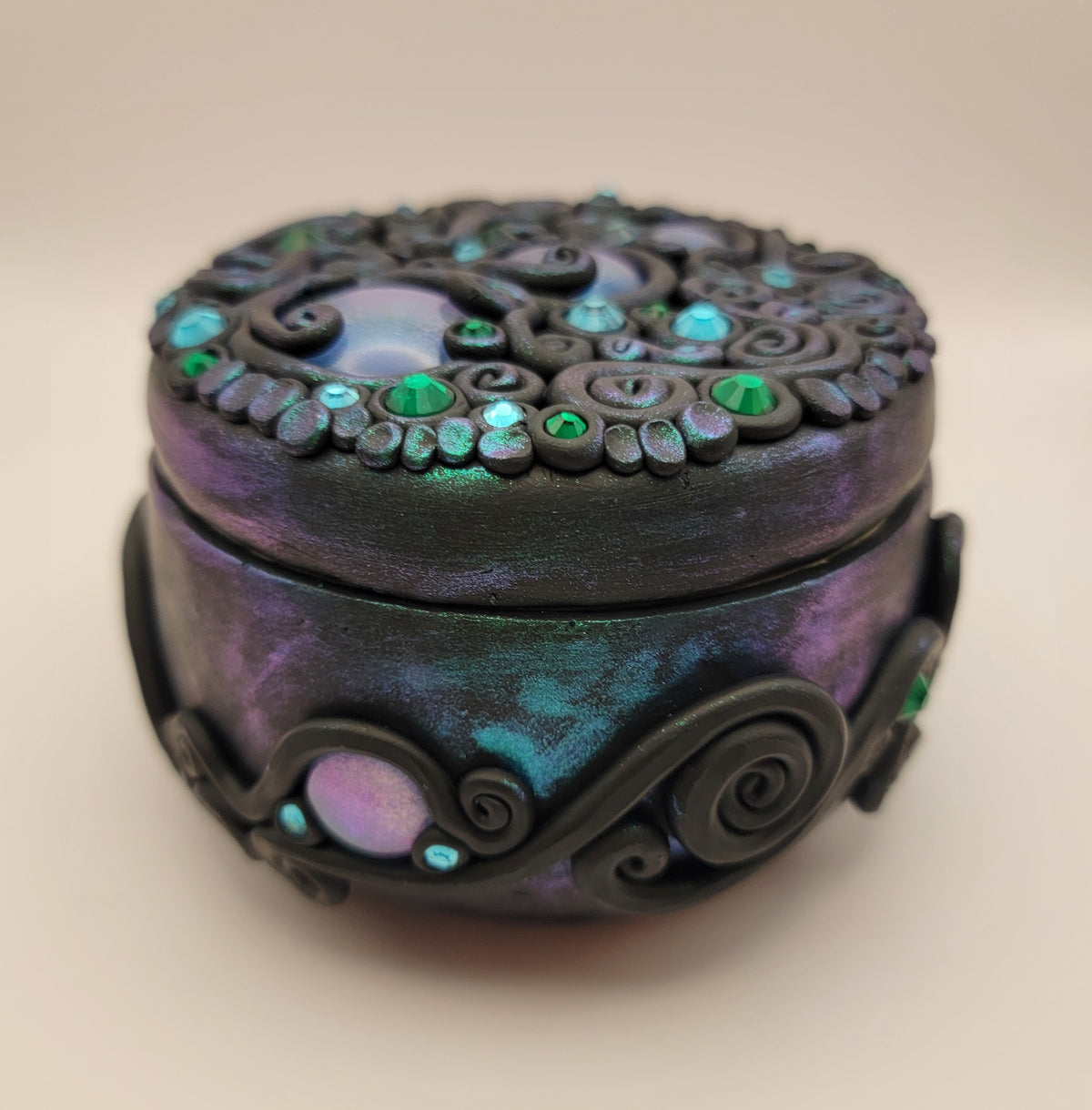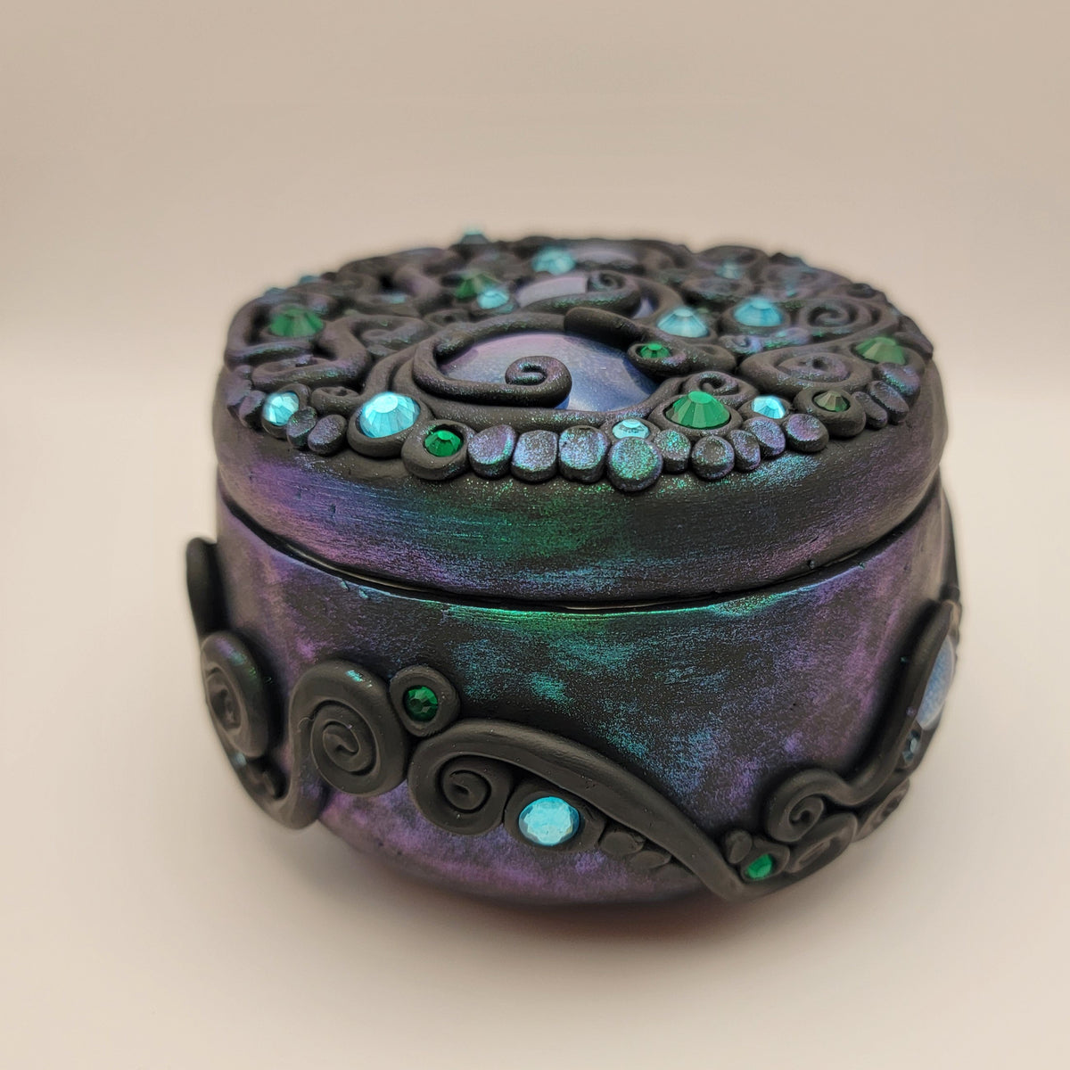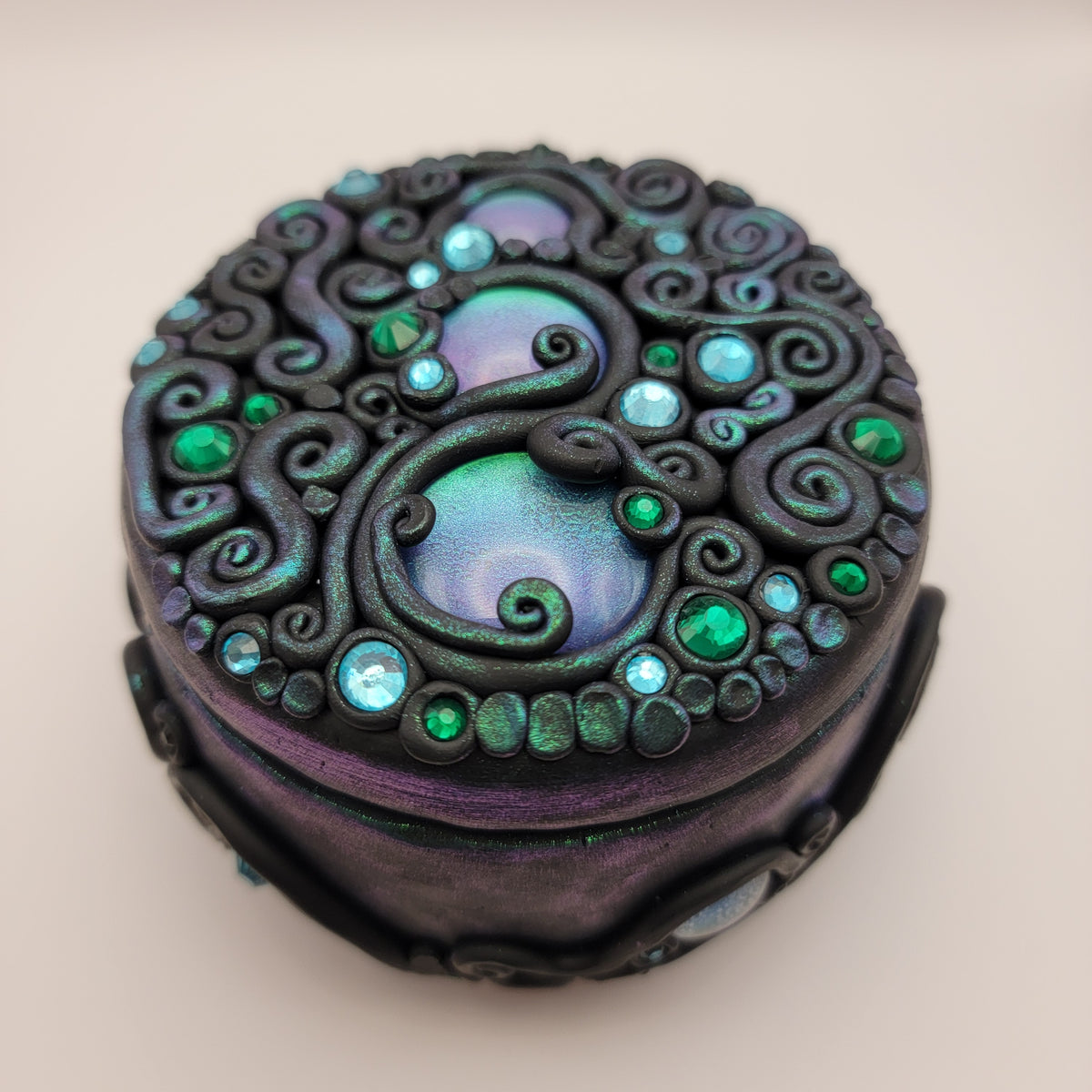 A unique polymer clay trinket box with three painted glass cabochons They read as green most often, but depending on the light and angle they will also appear to be turquoise or purple. The chameleon powder brushed over it changes in the same colors, bringing even more magic to the box. Accented with green and turquoise rhinestones for extra sparkle.