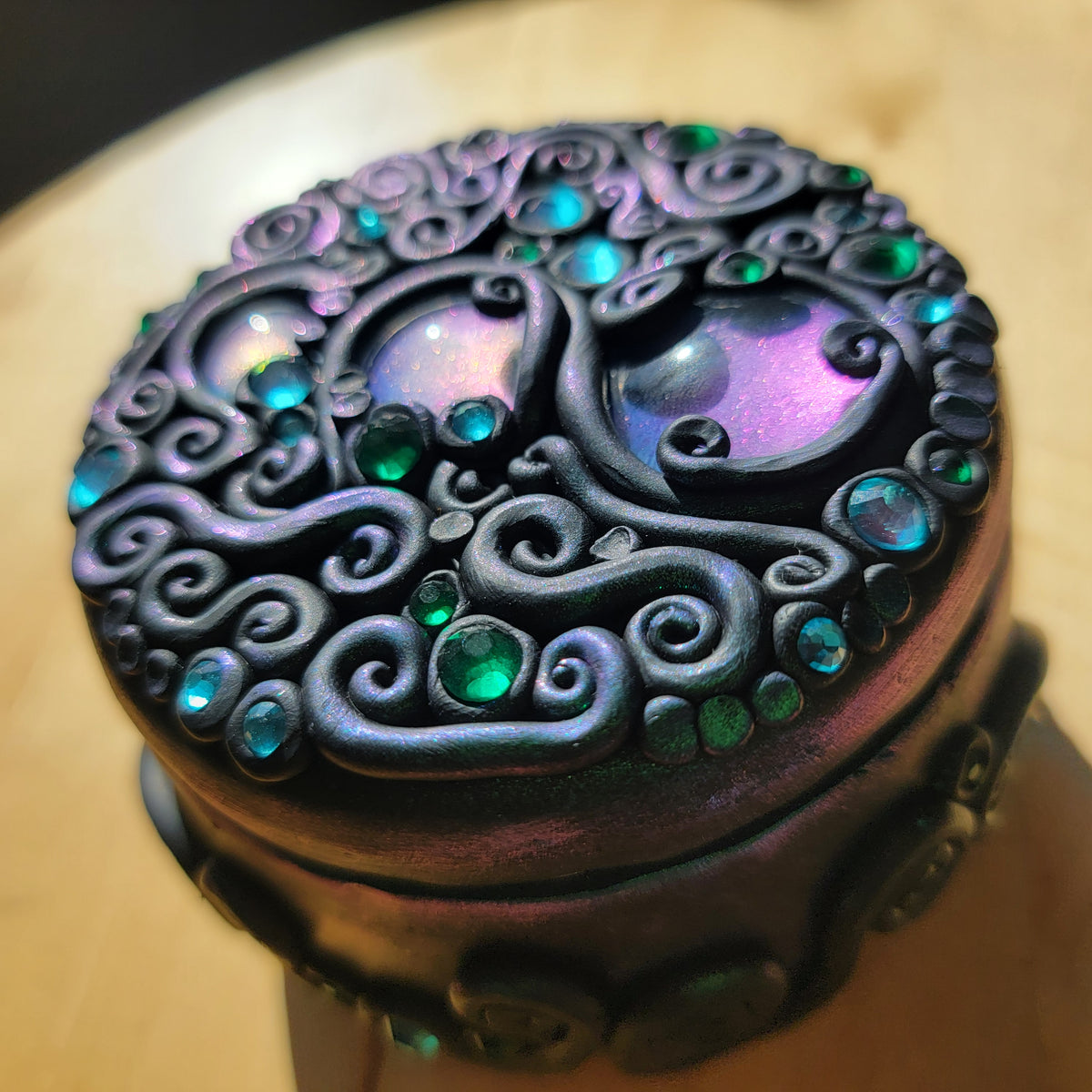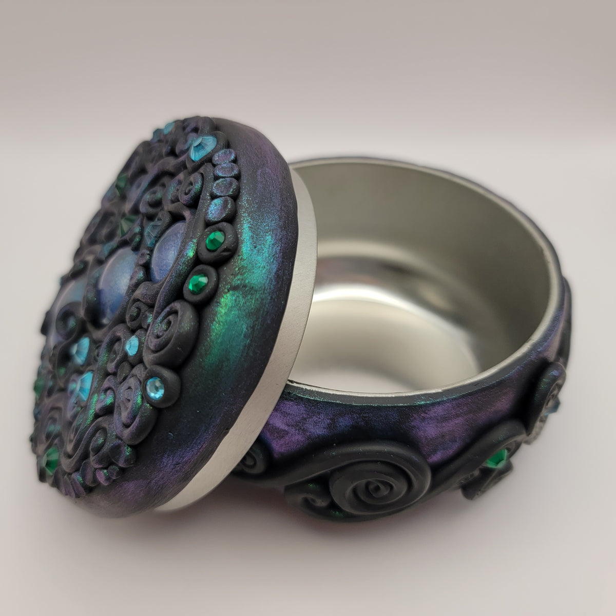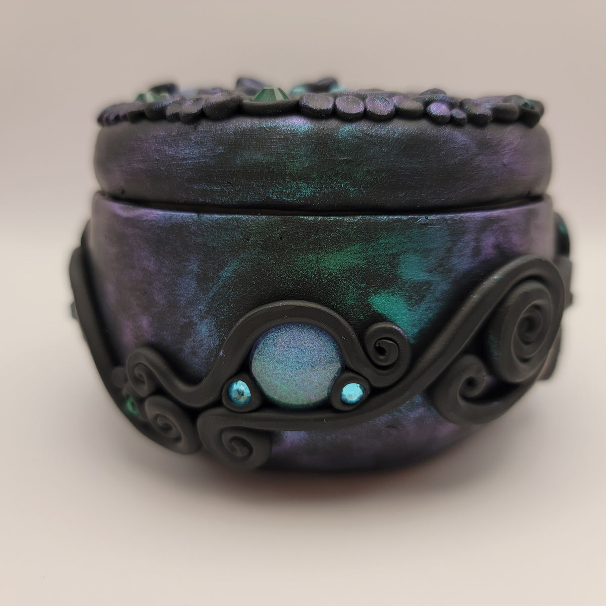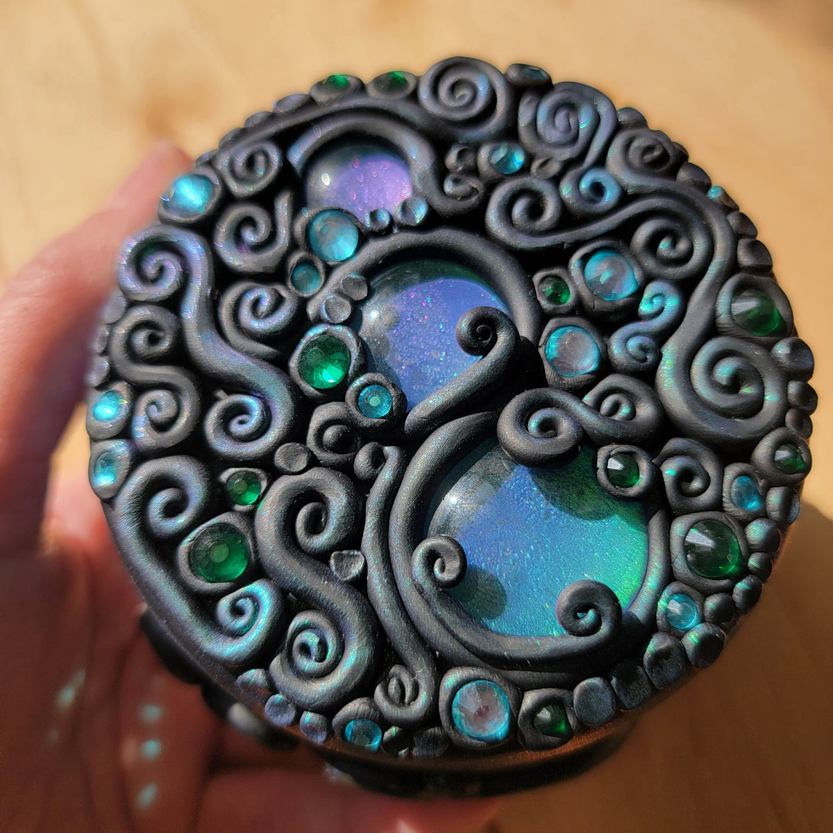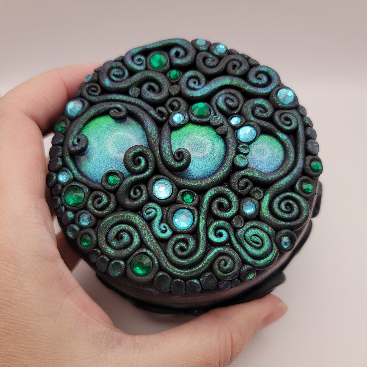 A unique polymer clay trinket box with three painted glass cabochons They read as green most often, but depending on the light and angle they will also appear to be turquoise or purple. The chameleon powder brushed over it changes in the same colors, bringing even more magic to the box. Accented with green and turquoise rhinestones for extra sparkle.