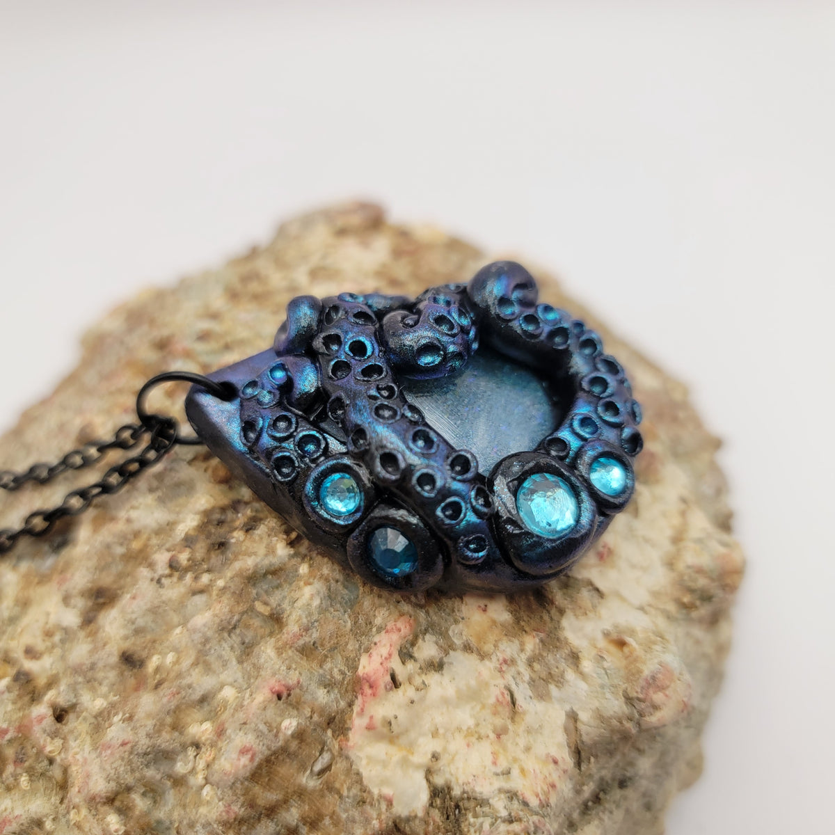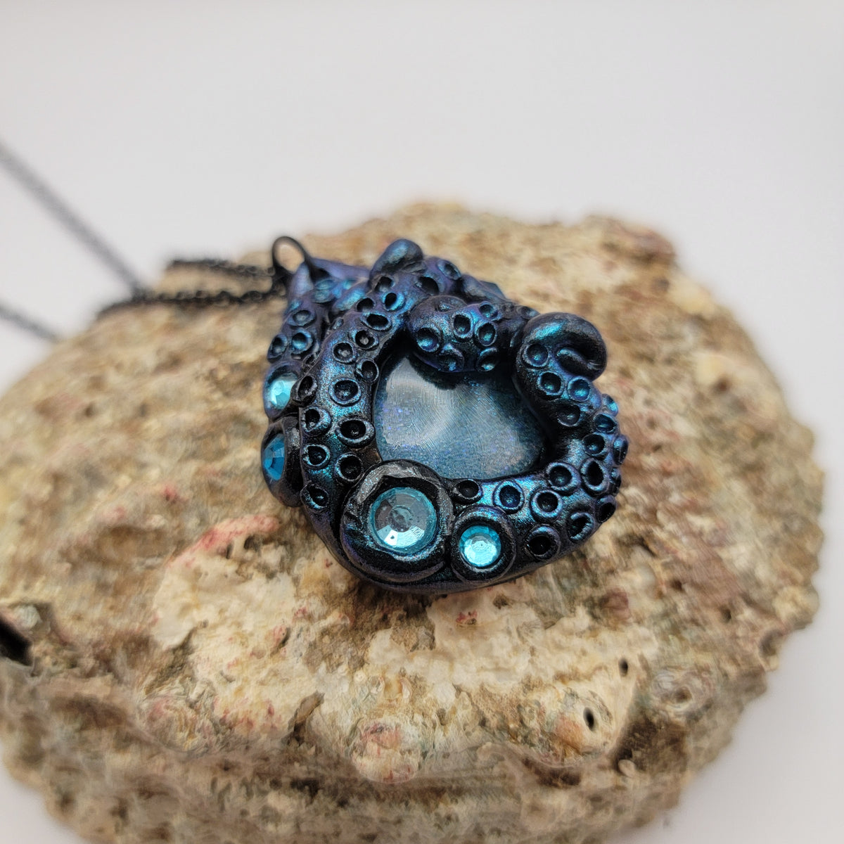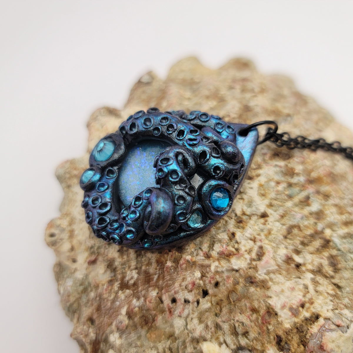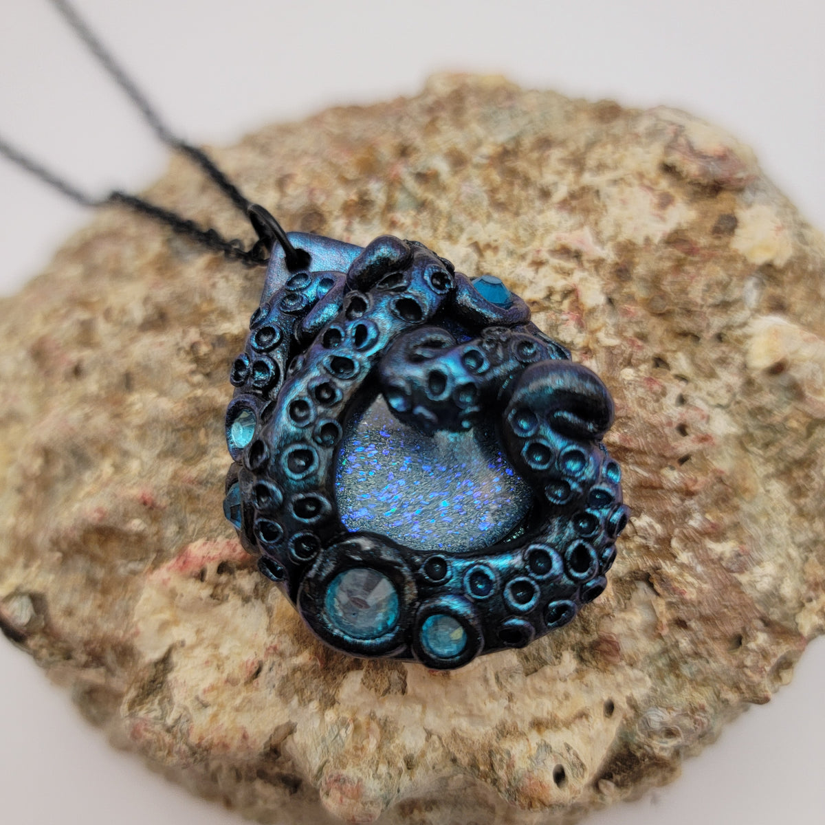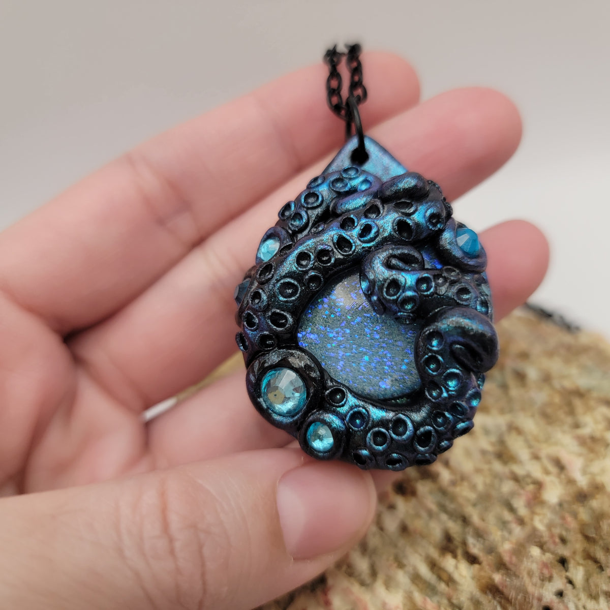 Black polymer clay pendant with tentacles surrounding a light blue painted glass cabochon, that sparkles with multiple types of glitter. The pendant is accented with turquoise rhinestones and brushed with chameleon powder that makes the tentacles shimmer. Pendant has been sealed with gloss glaze for extra shine. Each pendant is made by hand and entirely unique.