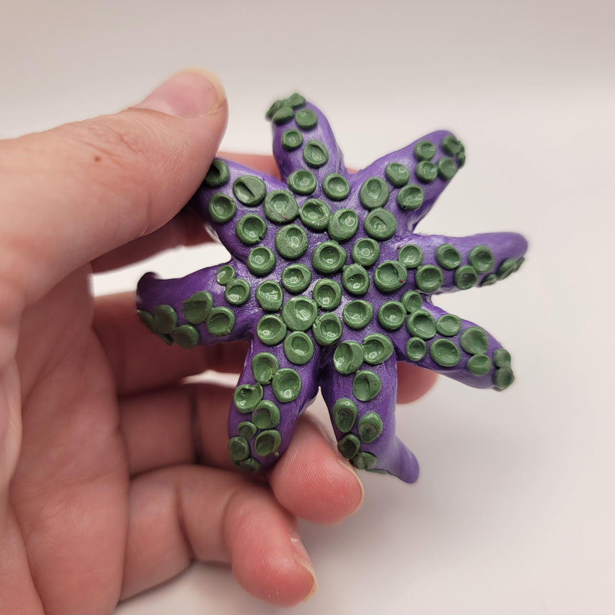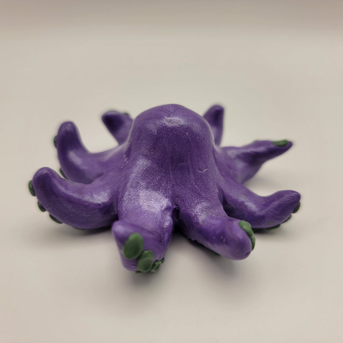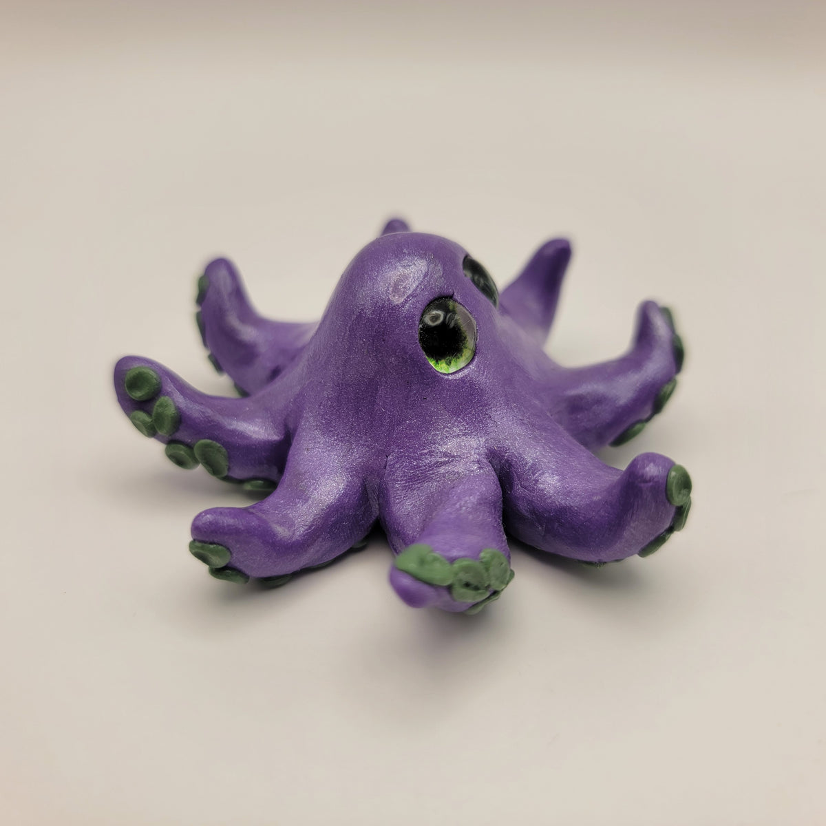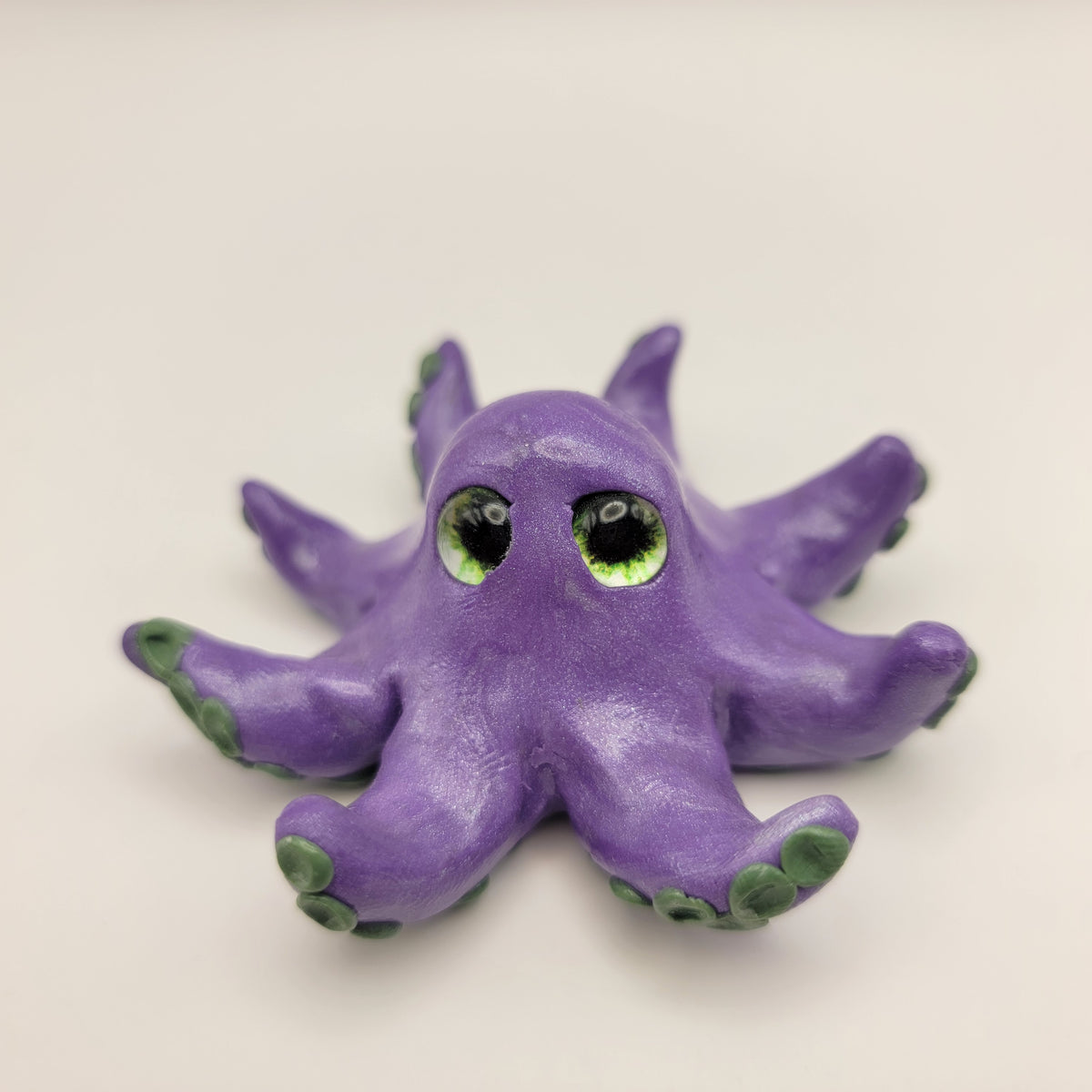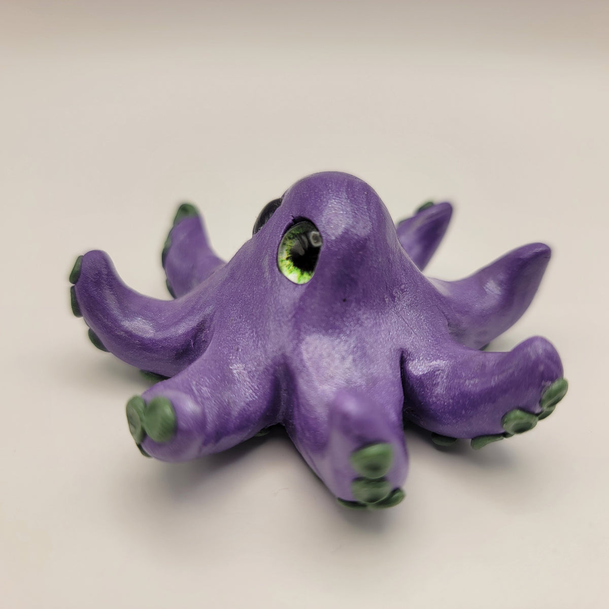 A small polymer clay octopus friend! Purple with green glass eyes and green suckers, it has its tentacles outstretched to explore the world.