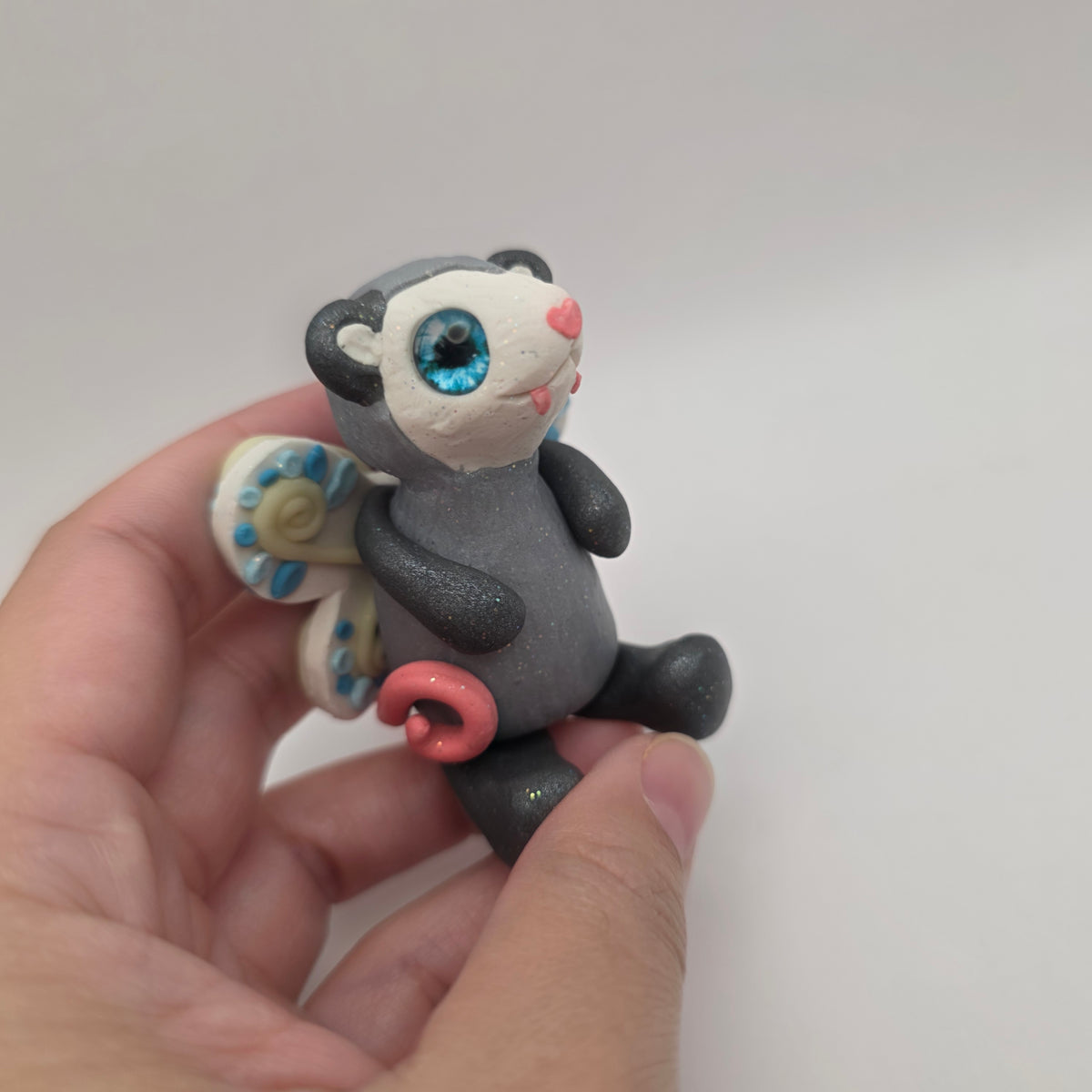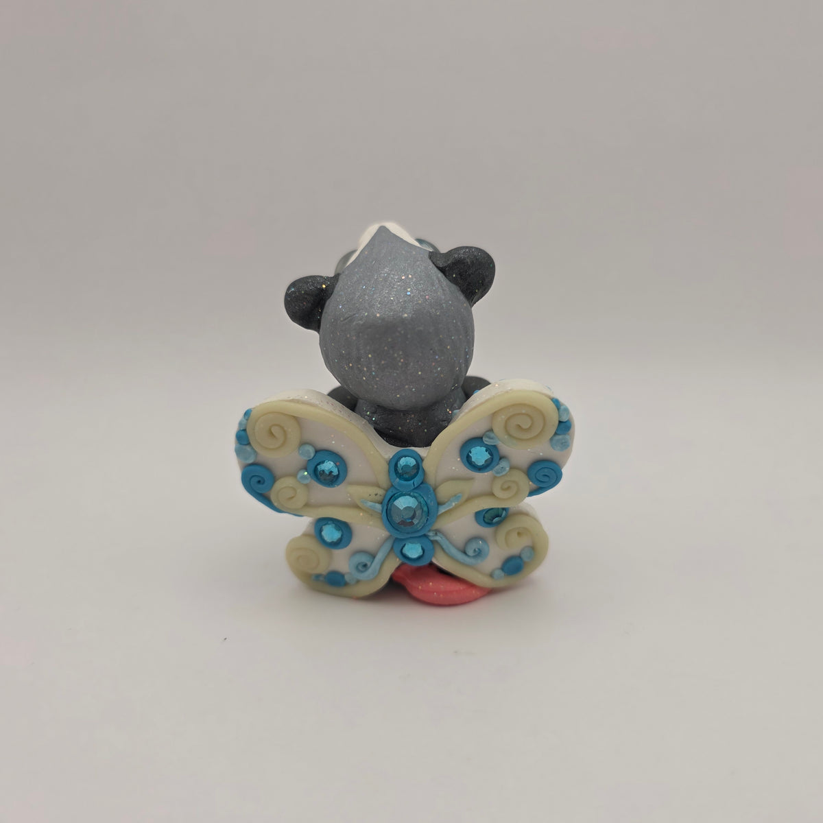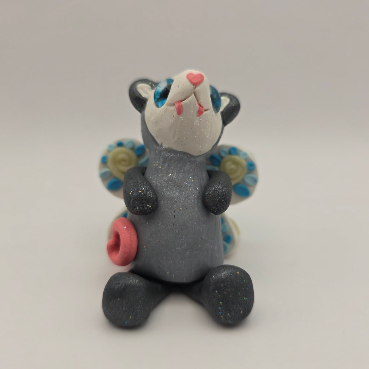Meet Indy the opossum fairy!  This little fairy has bright turquoise eyes and wings with glowing swirls and turquoise rhinestones.