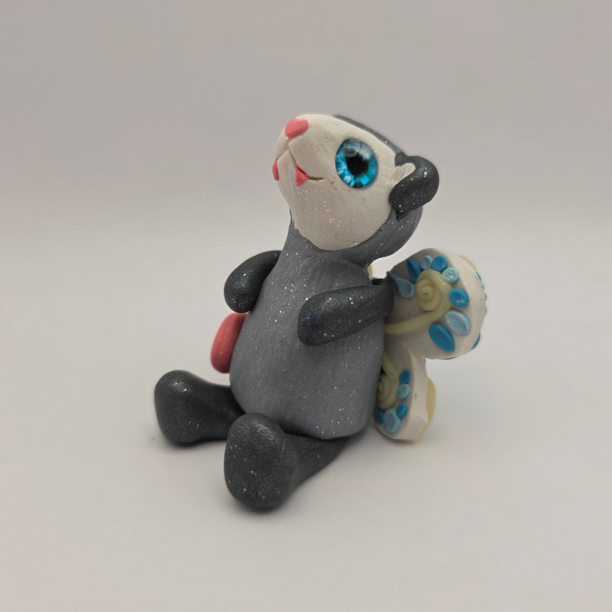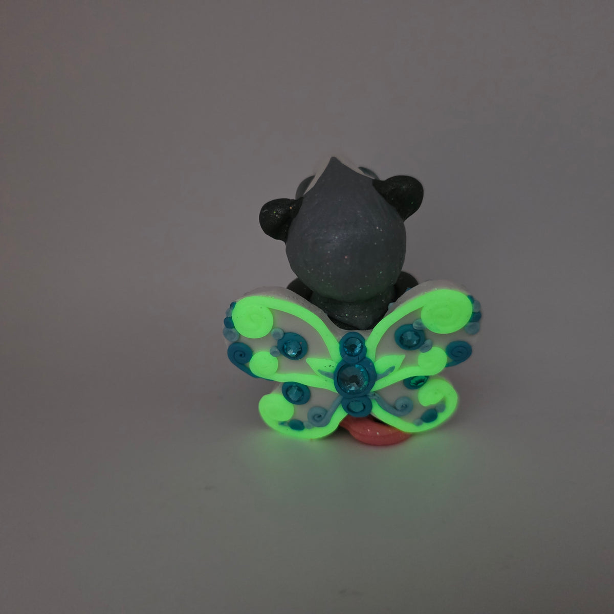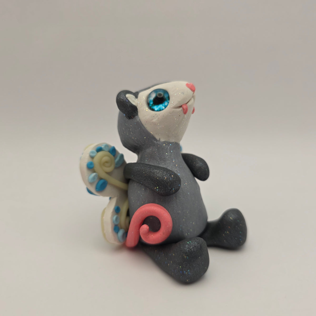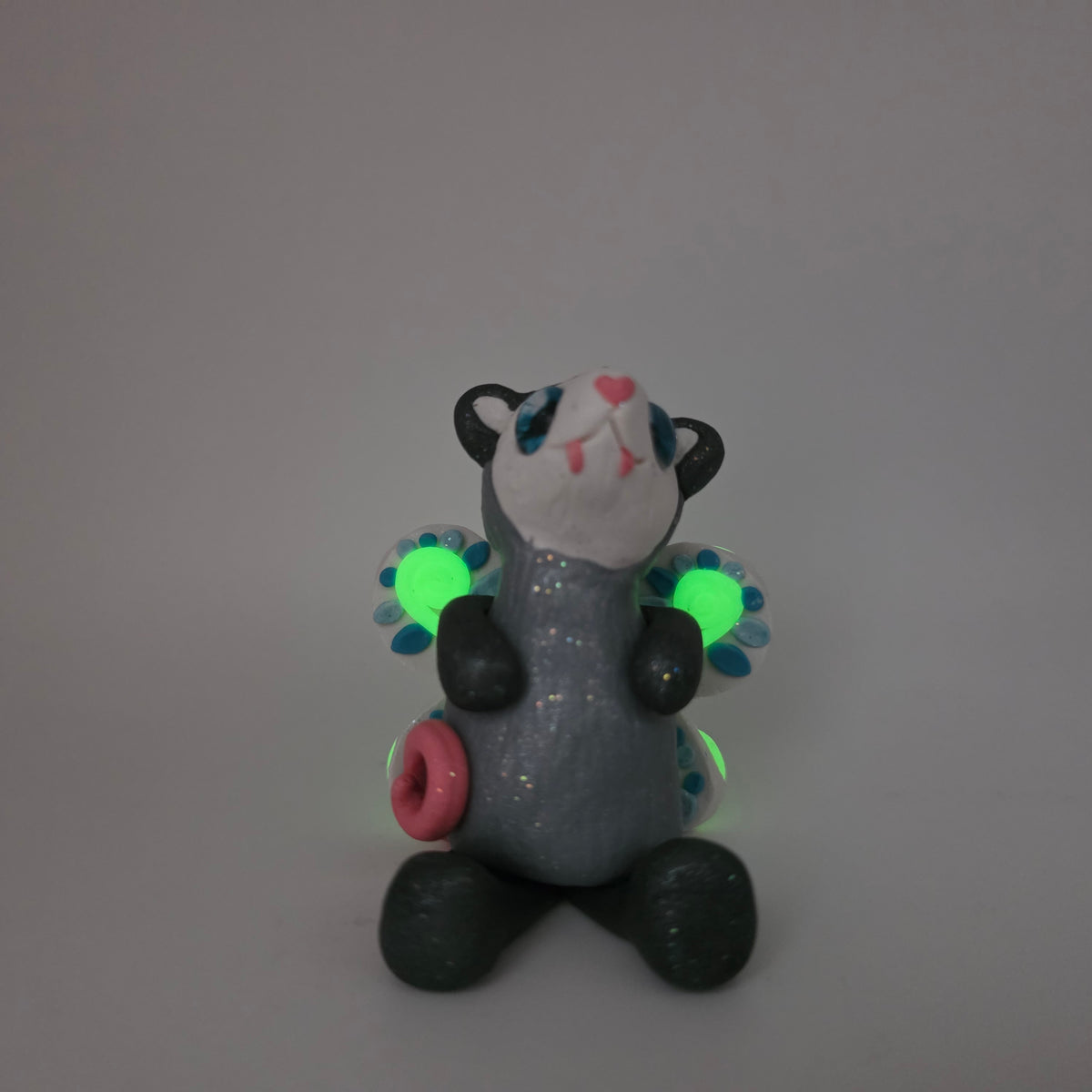 Meet Indy the opossum fairy!  This little fairy has bright turquoise eyes and wings with glowing swirls and turquoise rhinestones.