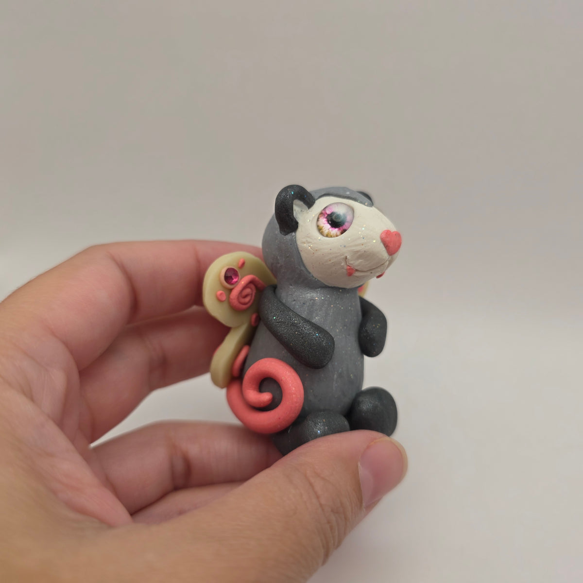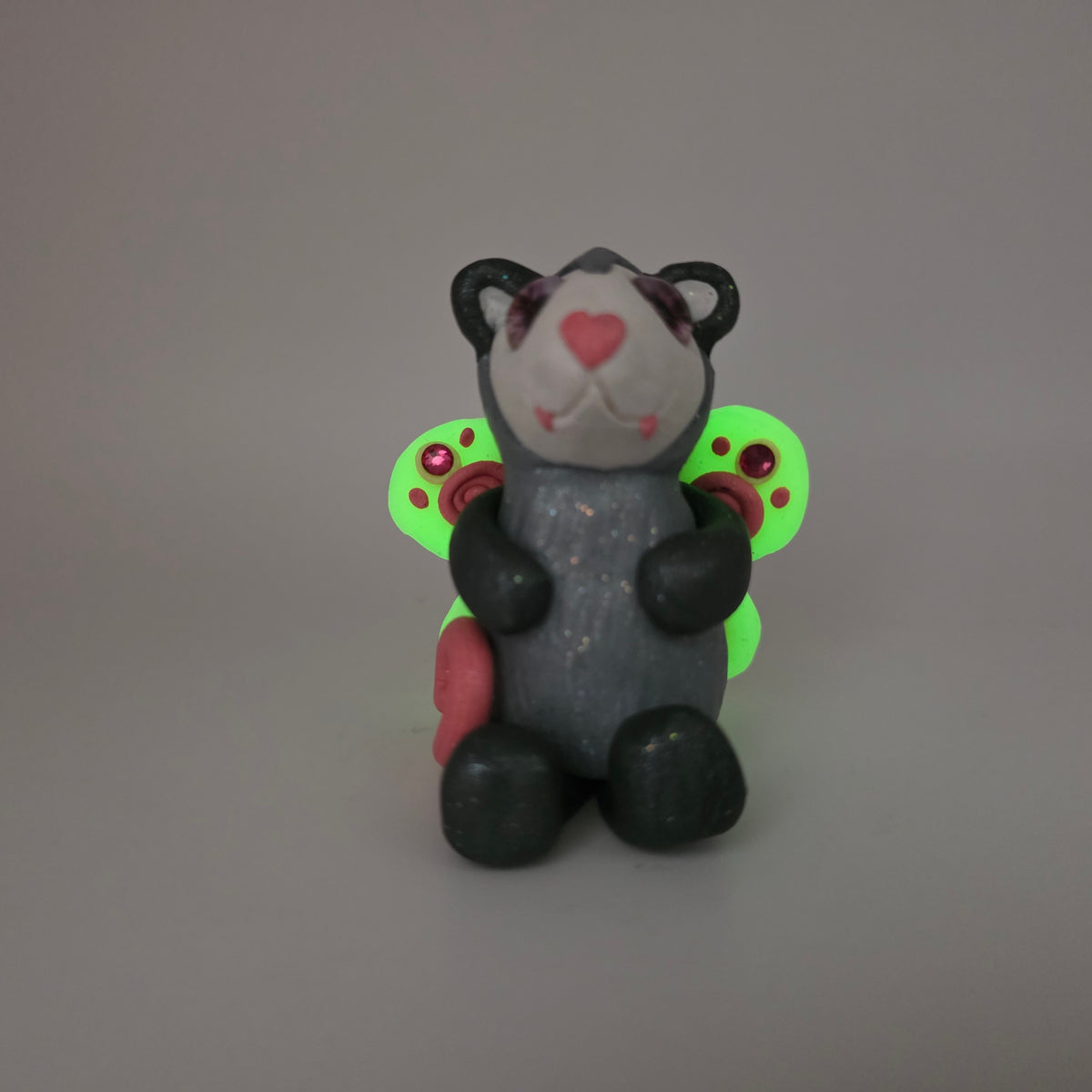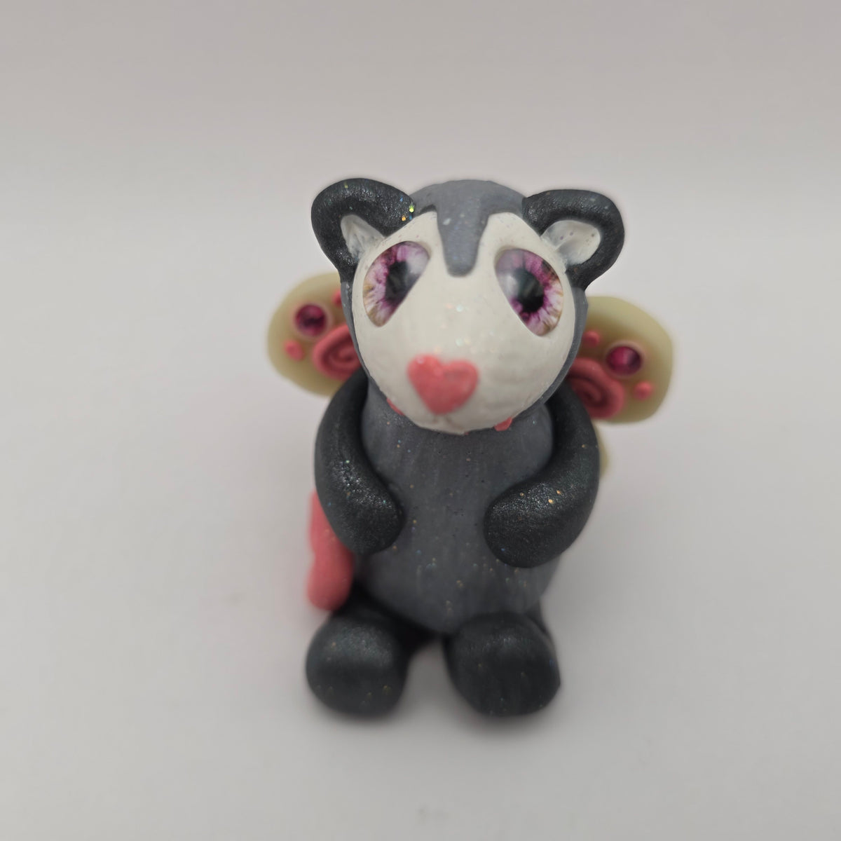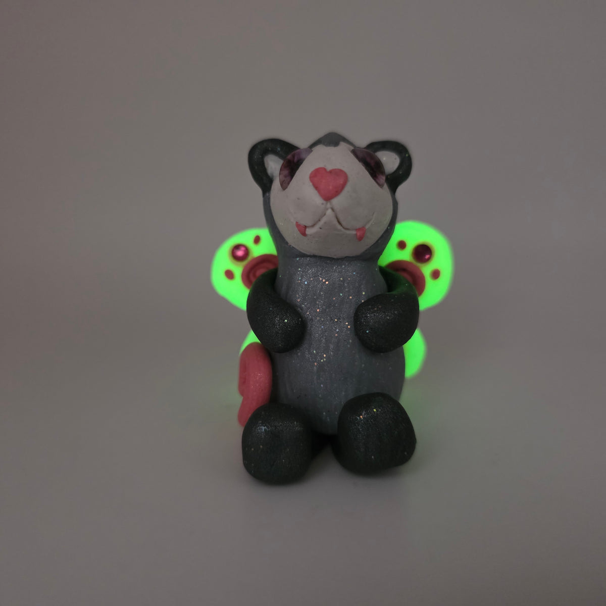 Meet Tula the opossum fairy!  This little fairy has pink eyes and glow in the dark wings decorated with pink swirls and pink and iridescent white rhinestones.