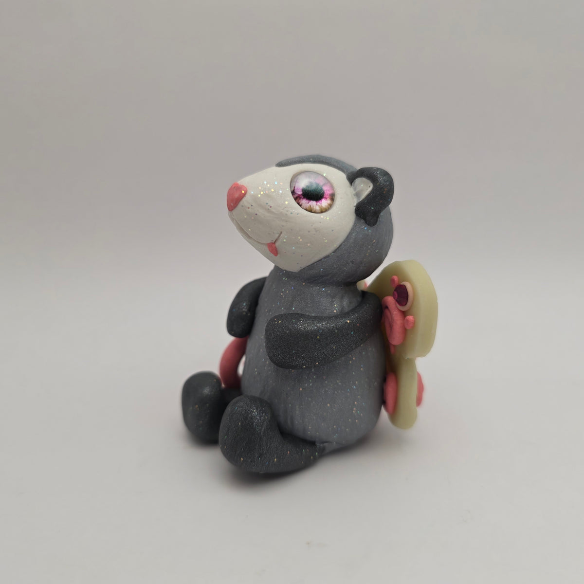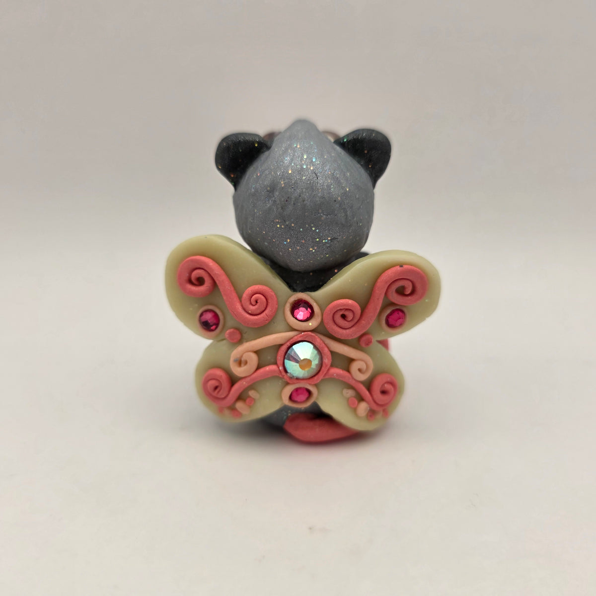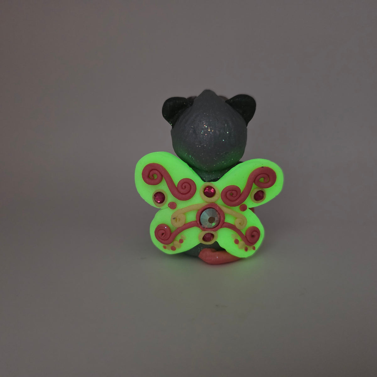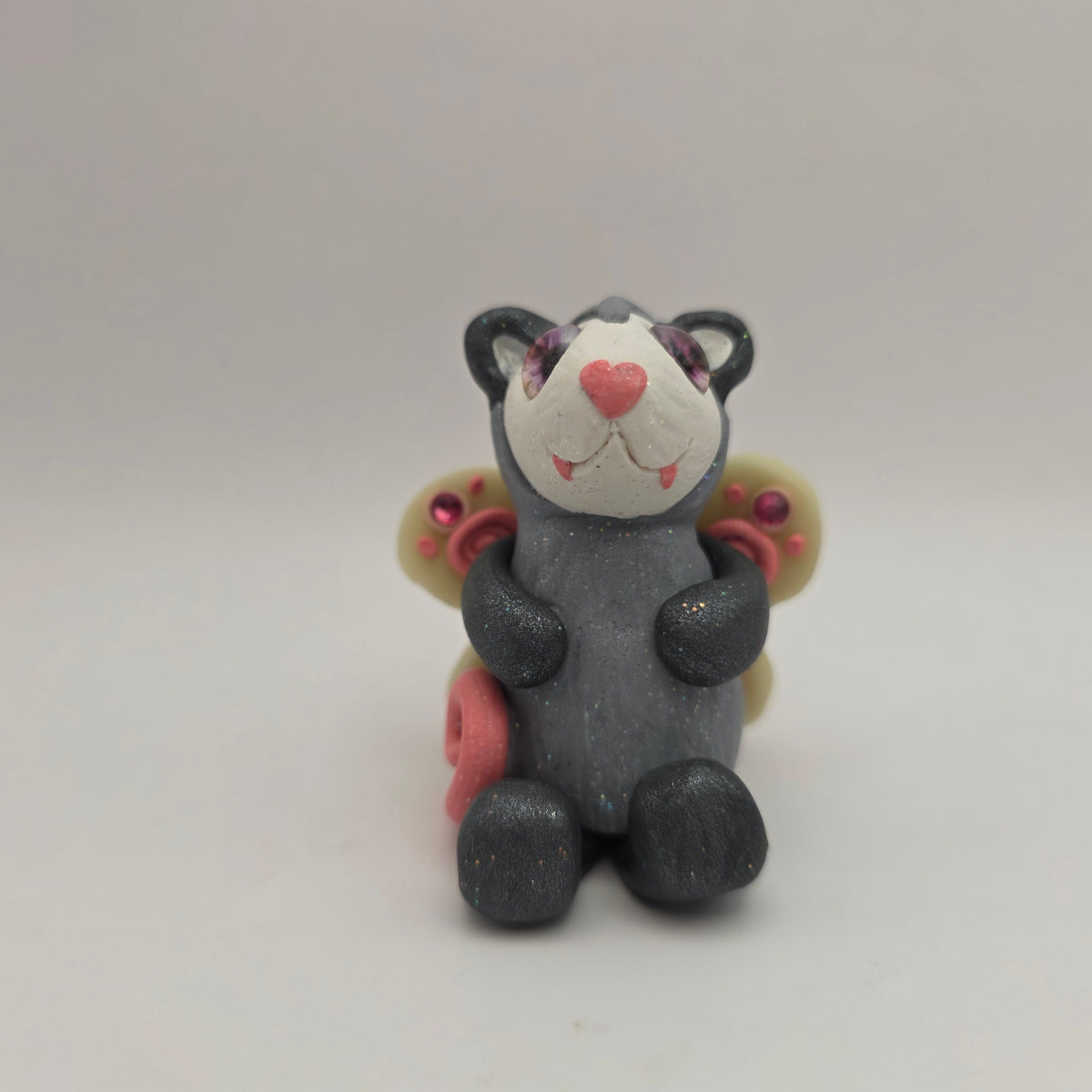 Meet Tula the opossum fairy!  This little fairy has pink eyes and glow in the dark wings decorated with pink swirls and pink and iridescent white rhinestones.
