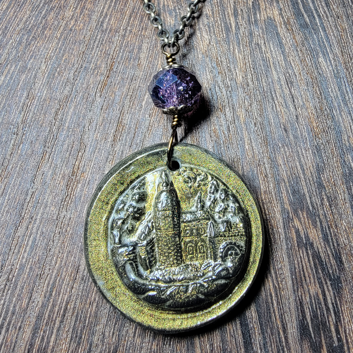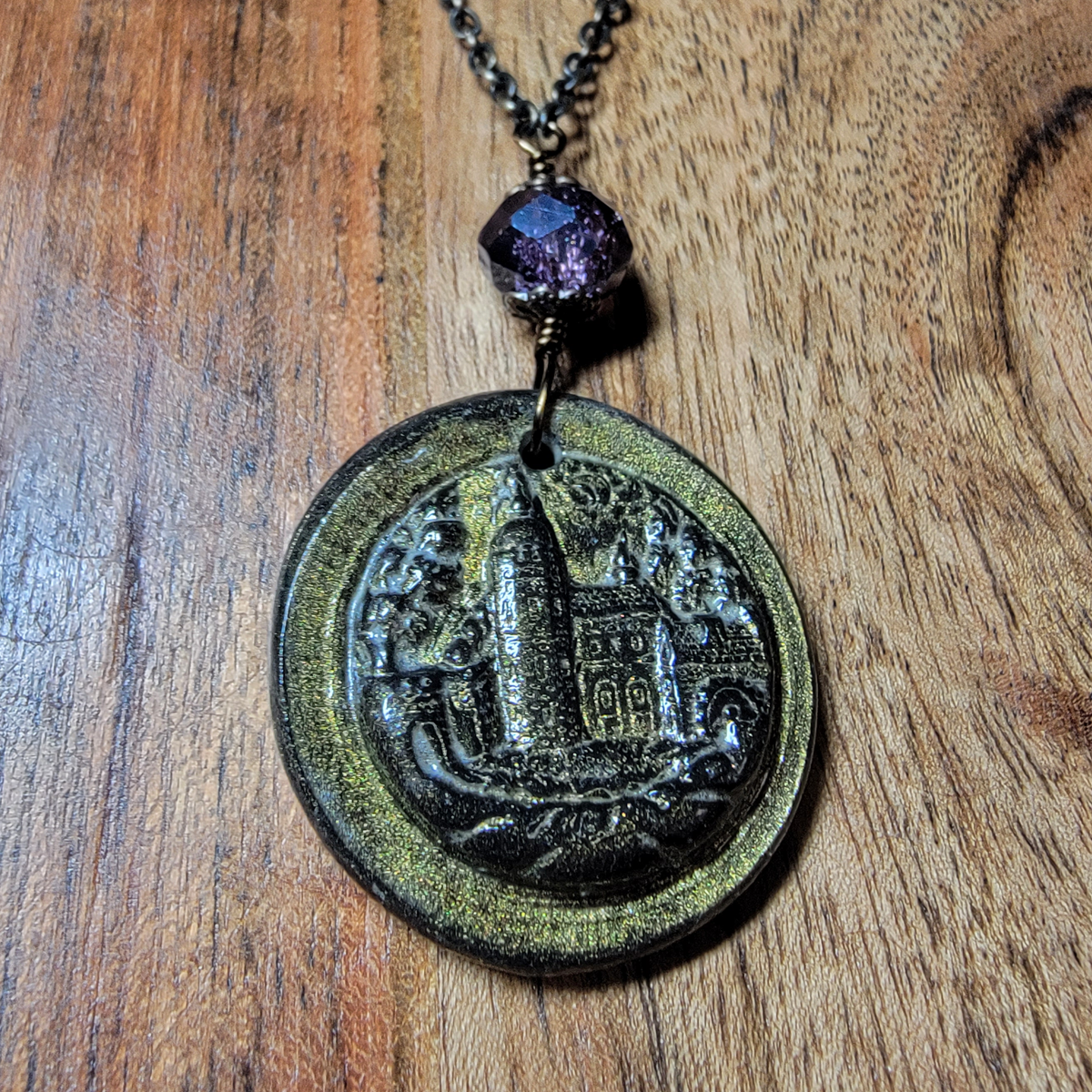 Sometimes you just need to escape to a castle. This whimsical polymer clay pendant was cast from a Victorian-era antique button. This pendant features a castle surrounded by trees under a crescent moon. It is lightweight, made out of polymer clay that has been painted and varnished.