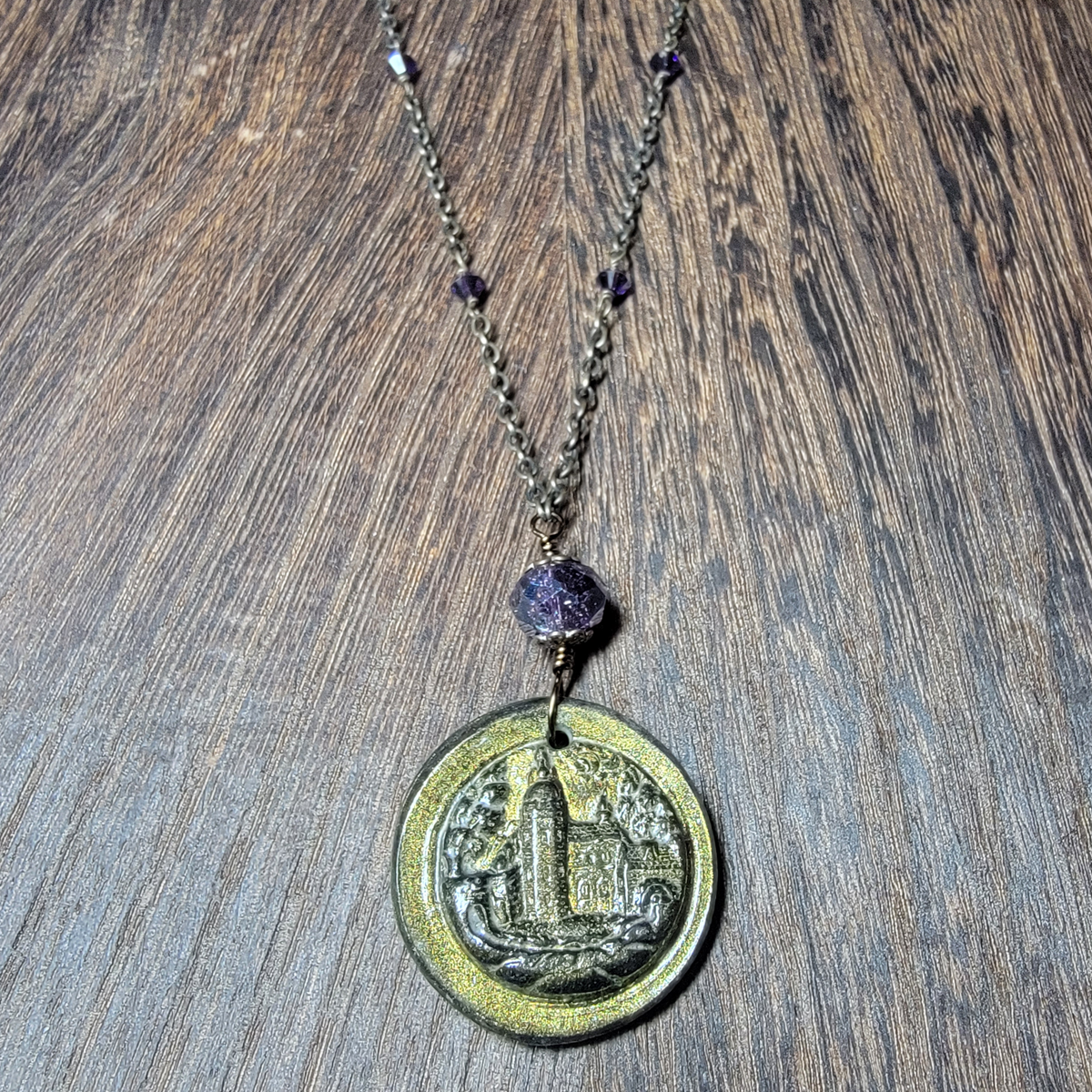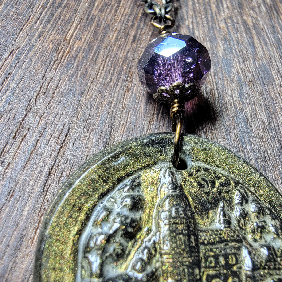 Pendant is on an antique gold toned chain interspersed with deep purple Swarovski crystal beads, and a sparkling purple bead above it. Chain measures about 26 inches and is closed with a bar and ring clasp. Pendant measures about 1.2 inches in diameter.