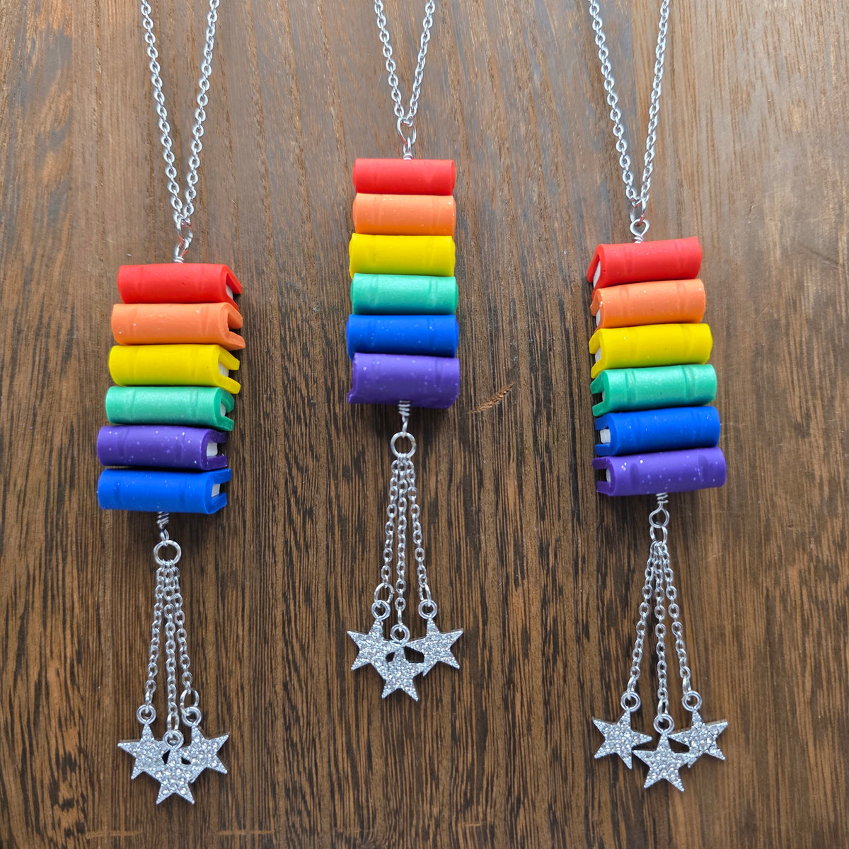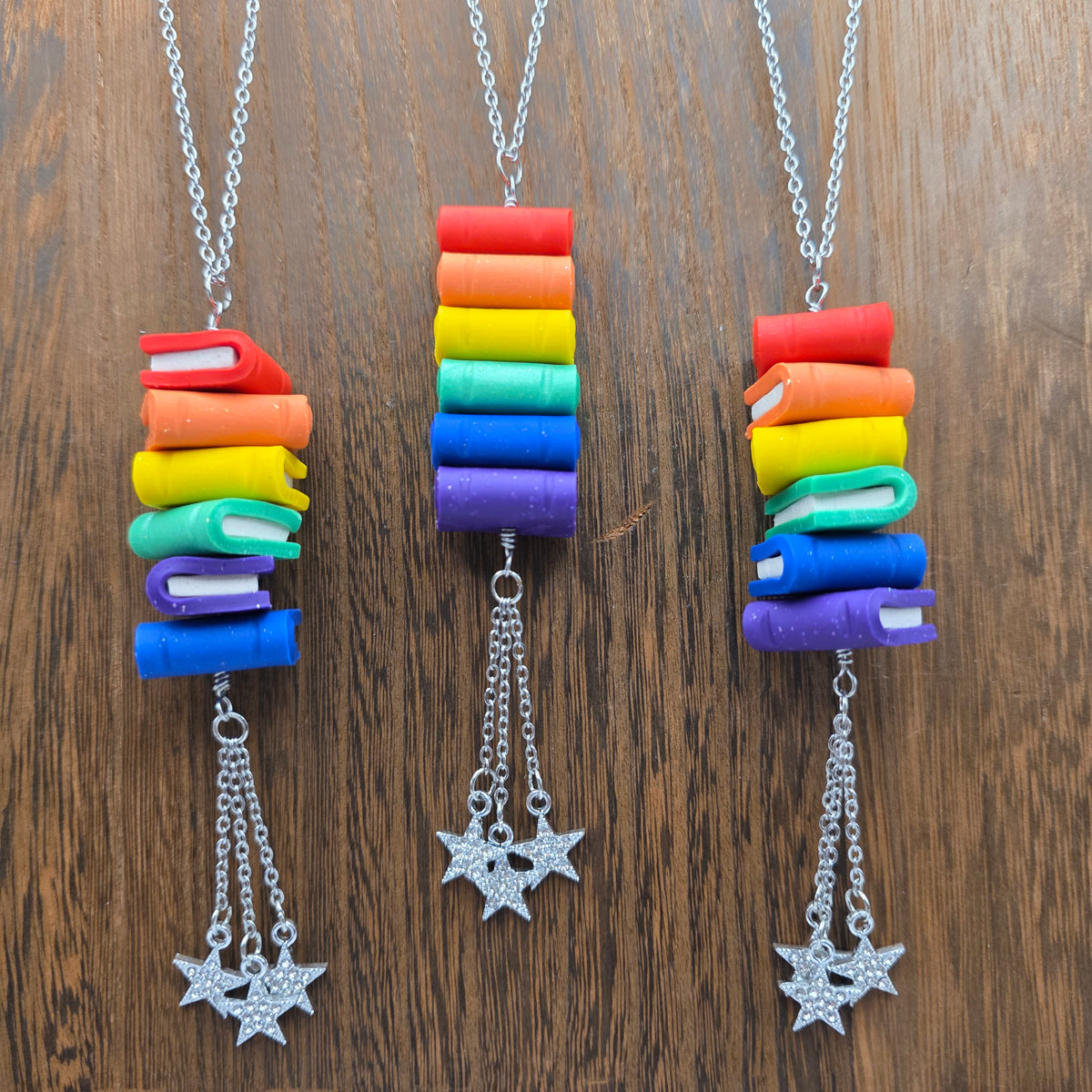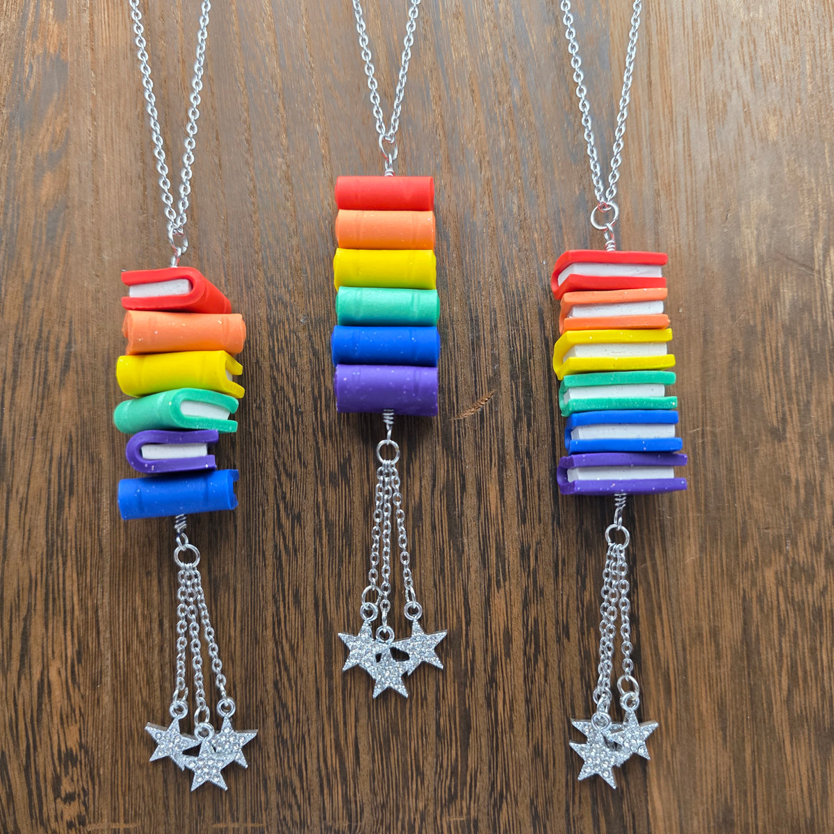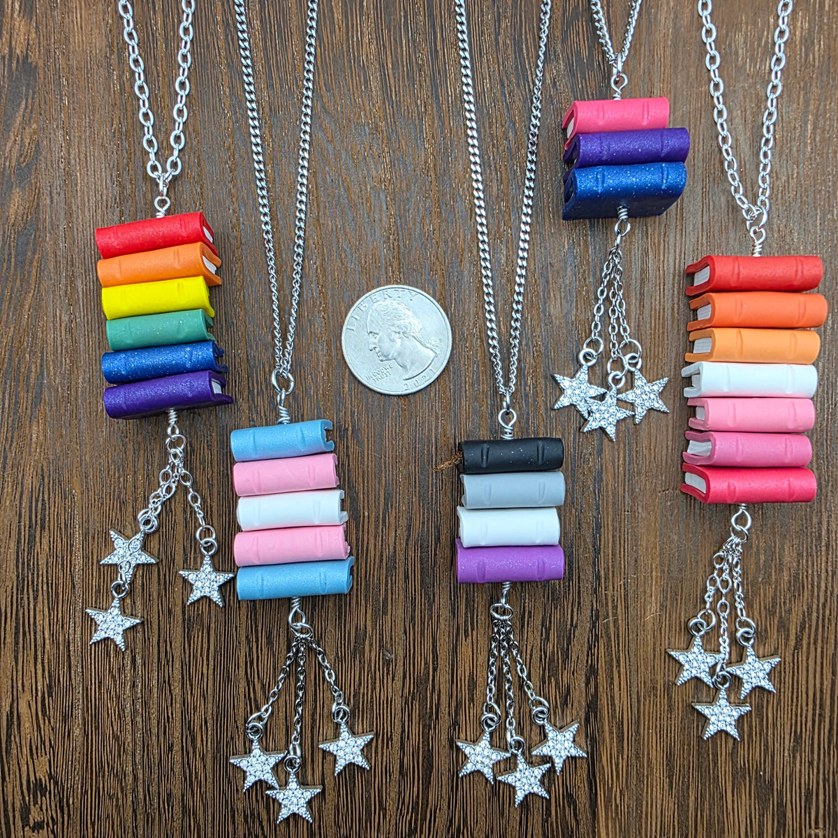 Pendants made from stacks of handmade polymer clay books with stars hanging beneath them. Available in the colors or various pride flags! Books are all made individually, so they are able to turn on the pendant.