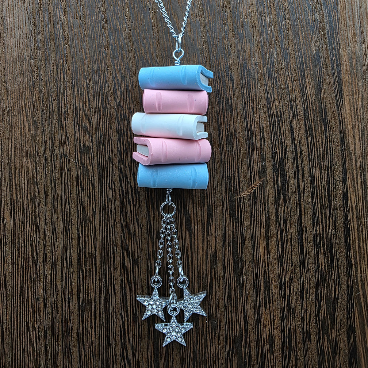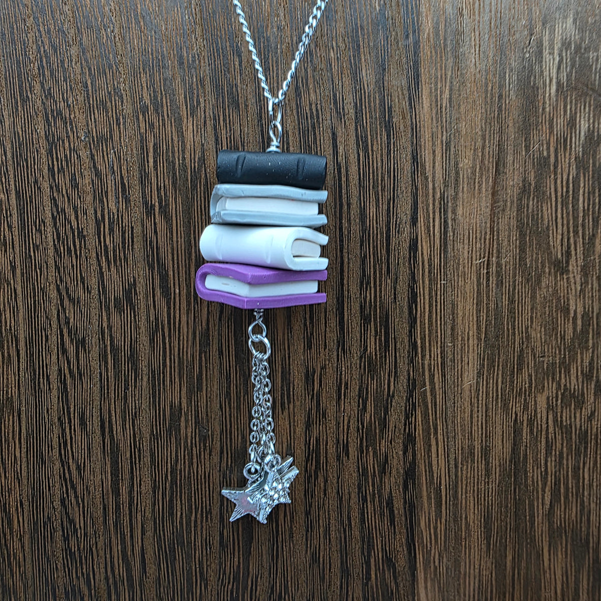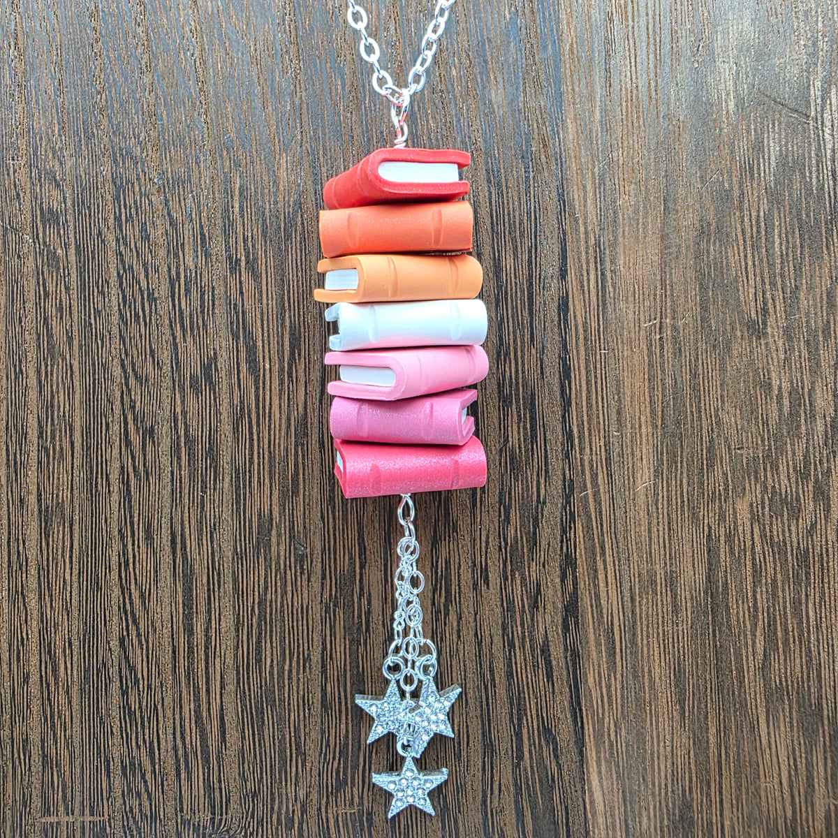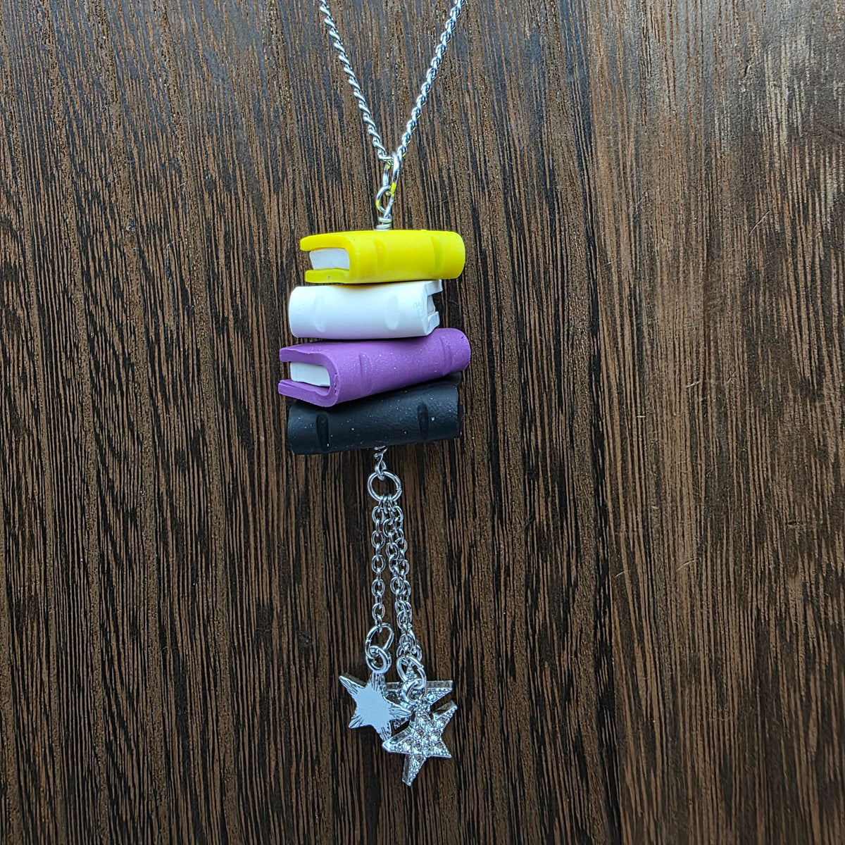 Pendants made from stacks of handmade polymer clay books with stars hanging beneath them. Available in the colors or various pride flags! Books are all made individually, so they are able to turn on the pendant.