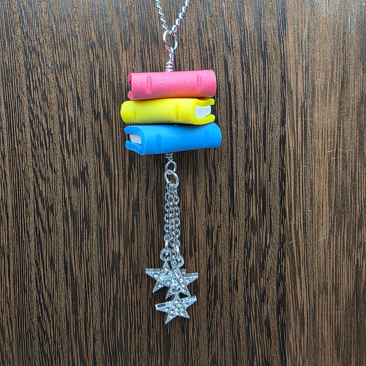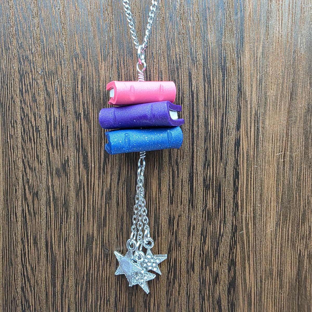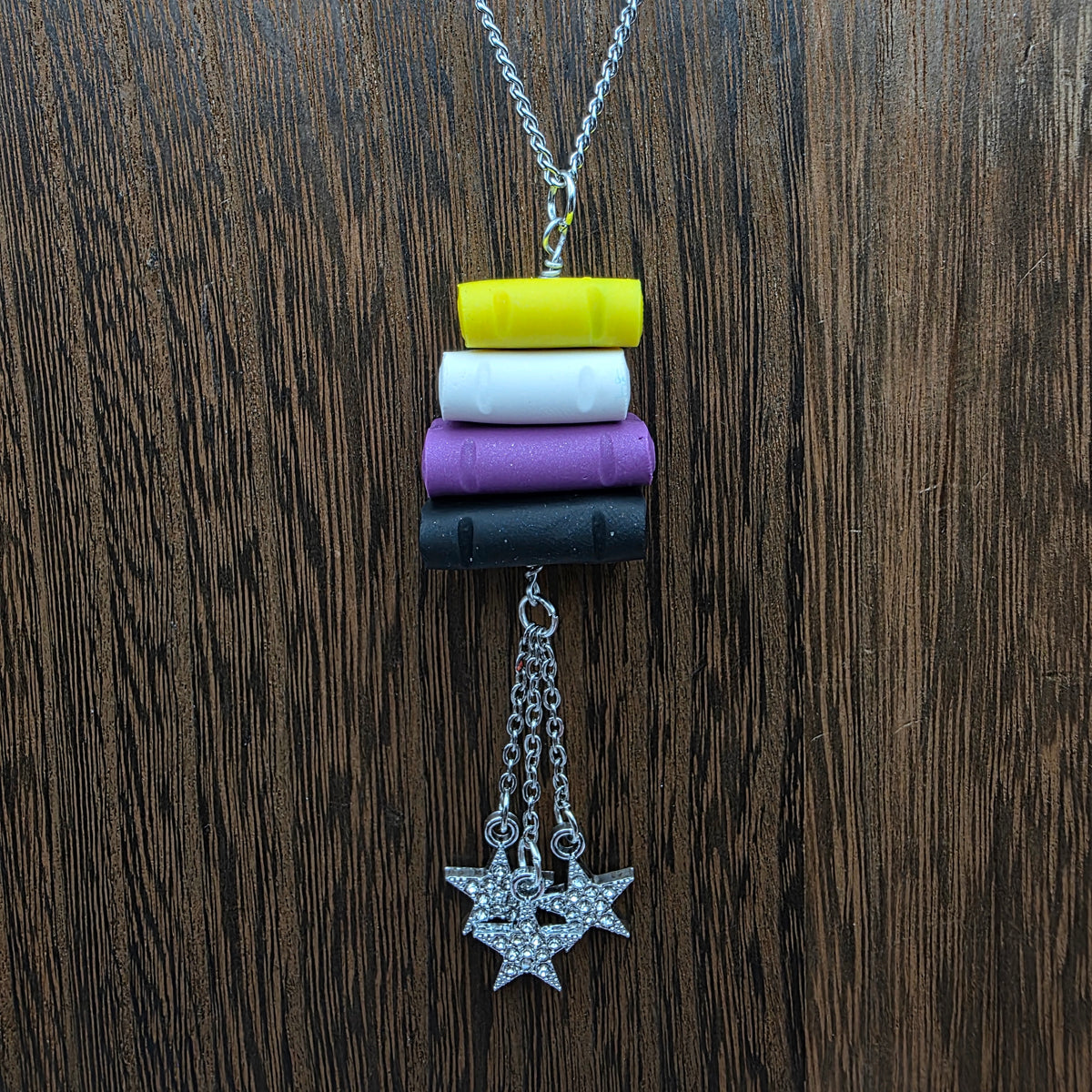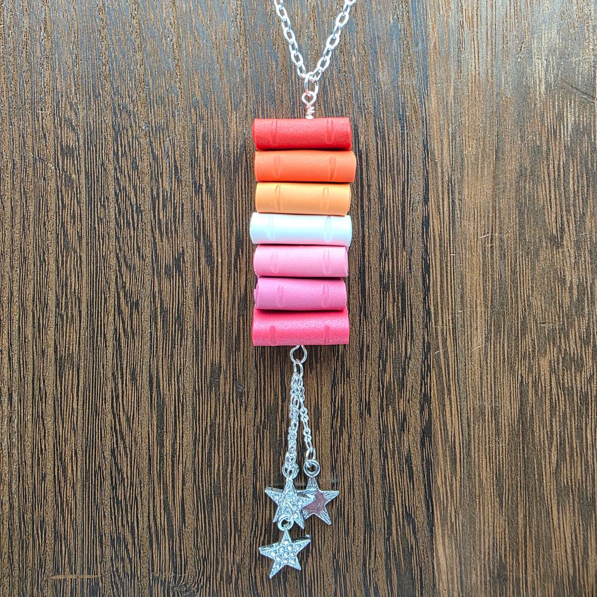 Pendants made from stacks of handmade polymer clay books with stars hanging beneath them. Available in the colors or various pride flags! Books are all made individually, so they are able to turn on the pendant.