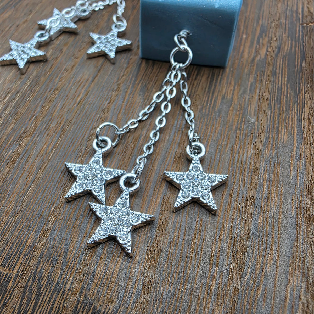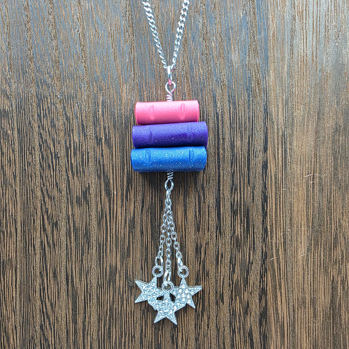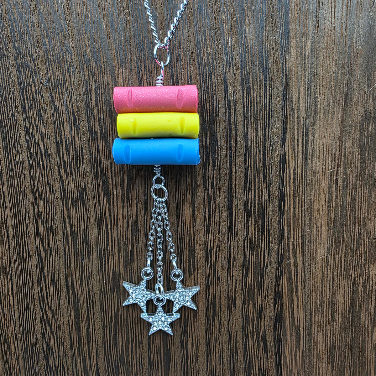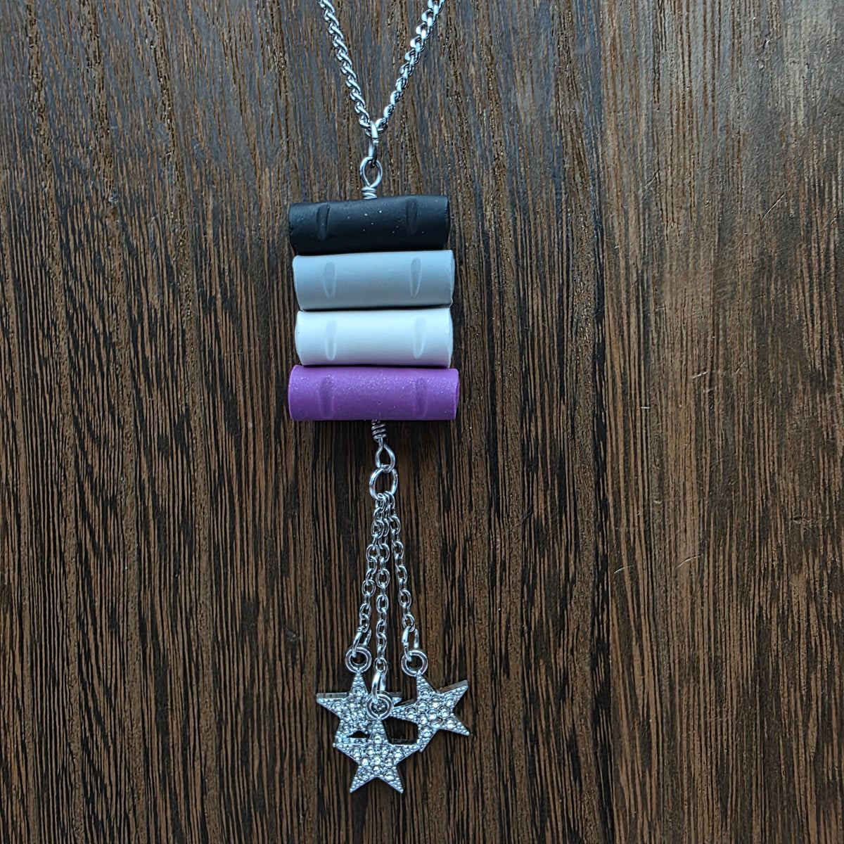 Pendants made from stacks of handmade polymer clay books with stars hanging beneath them. Available in the colors or various pride flags! Books are all made individually, so they are able to turn on the pendant.
