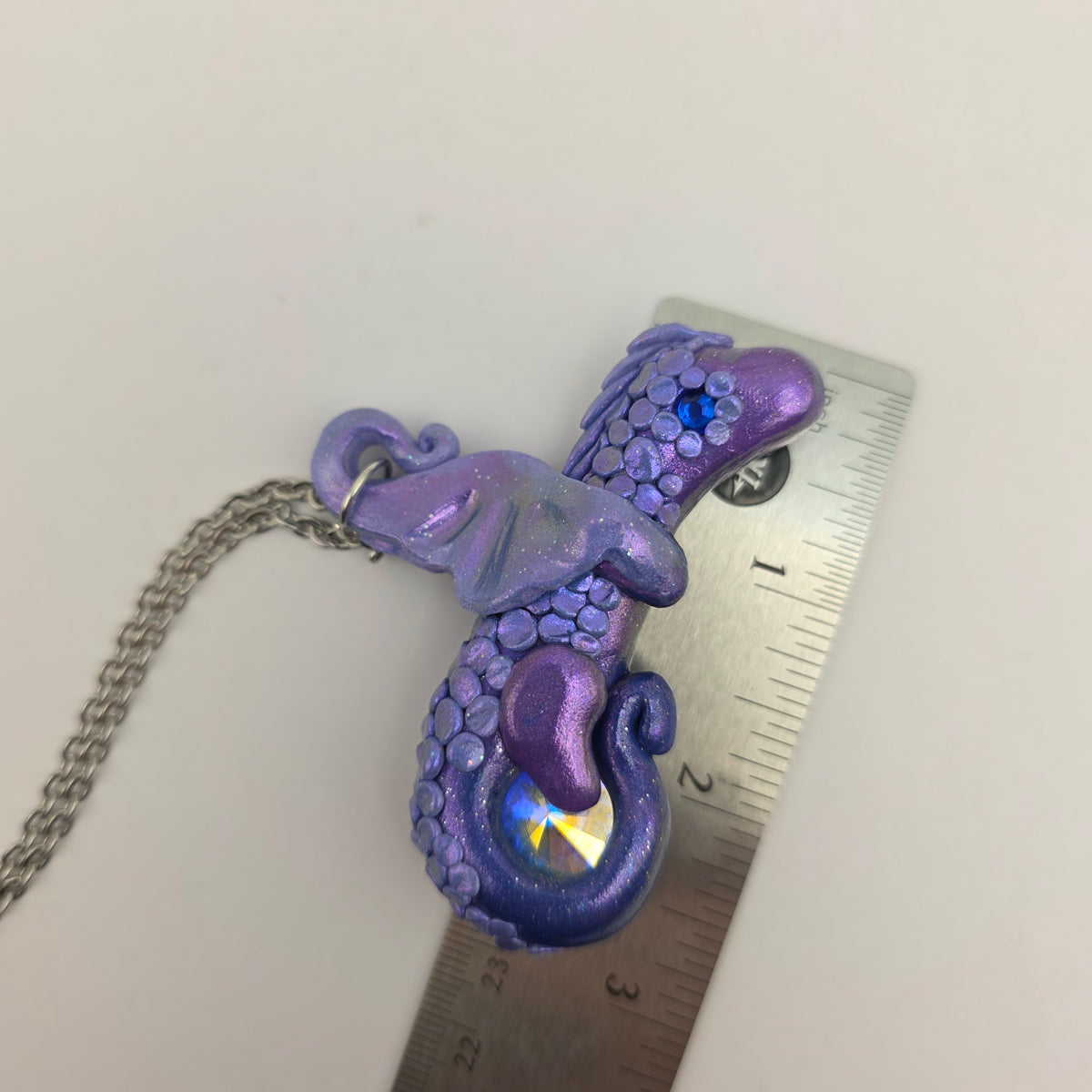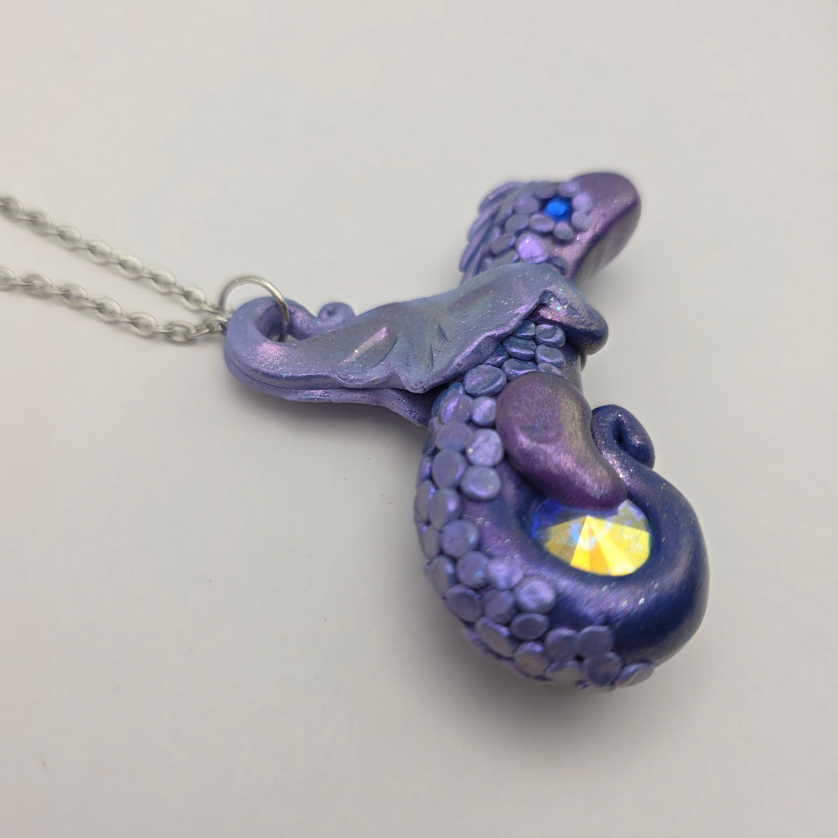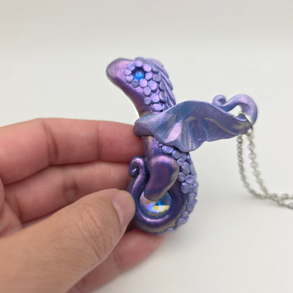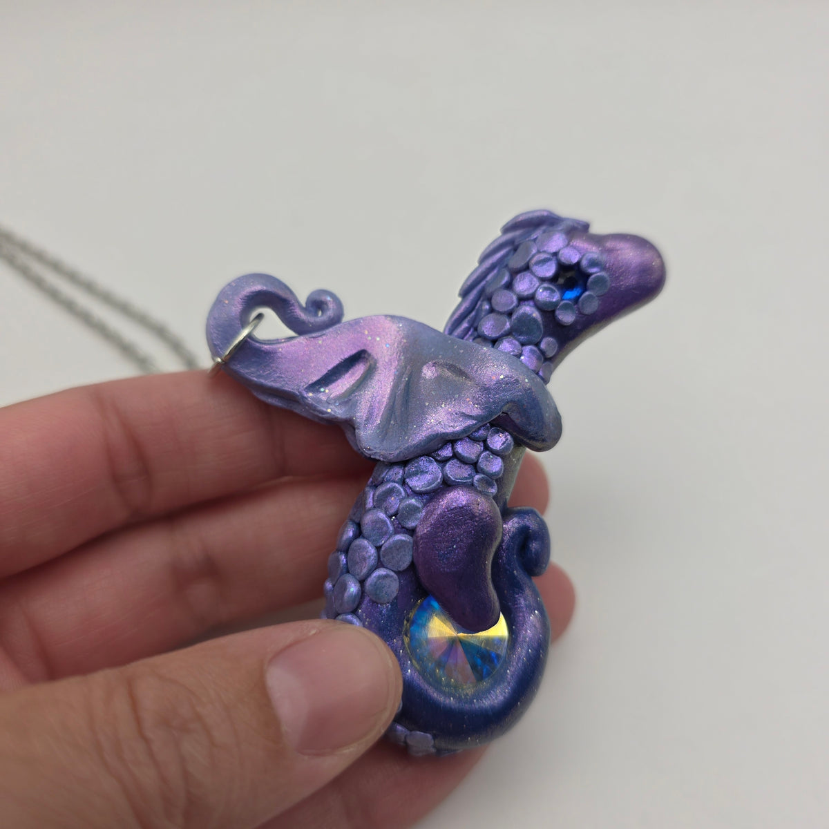 This purple dragon has a lovely shimmer to it, shining from light purple to blue depending on the light and angle.  It also shows bits of iridescent glitter, especially in the wings. It has blue rhinestone eyes and is holding onto aurora borealis crystals, which pick up multiple colors as they sparkle.  This dragon is entirely unique, sculpted with polymer with polymer clay, two Prestige Rivoli crystals, and rhinestones for eyes. Painted with gloss glaze to keep it from spreading glitter wherever it goes.