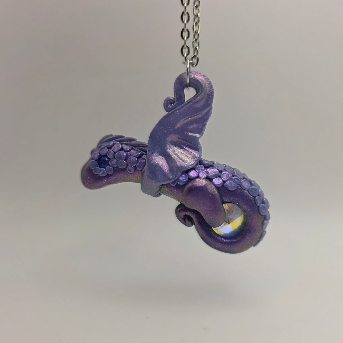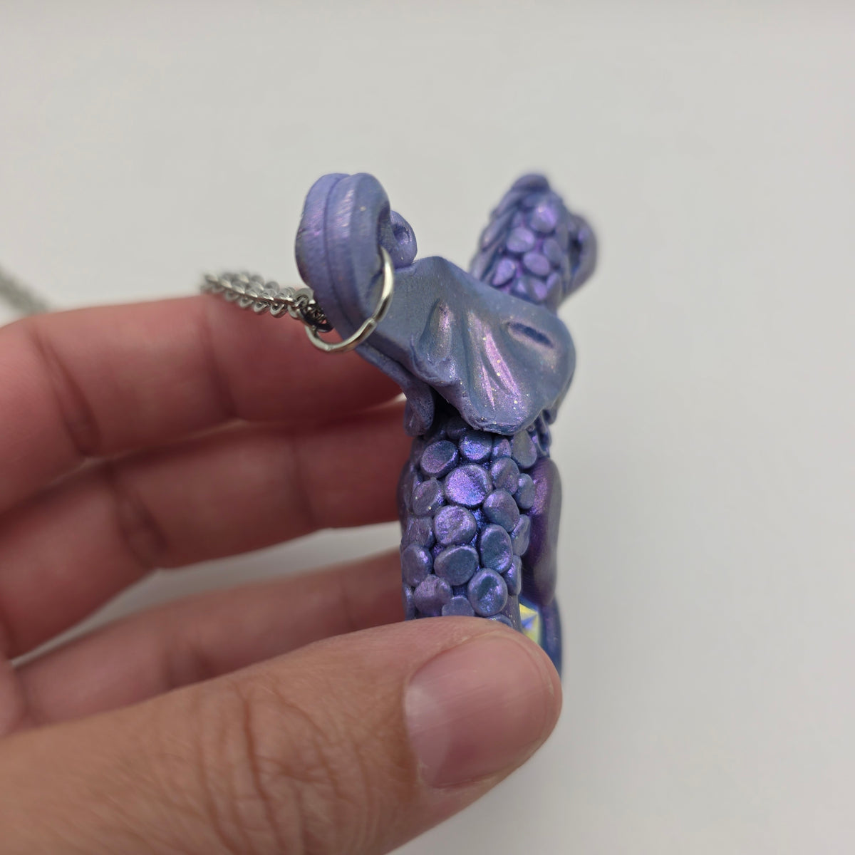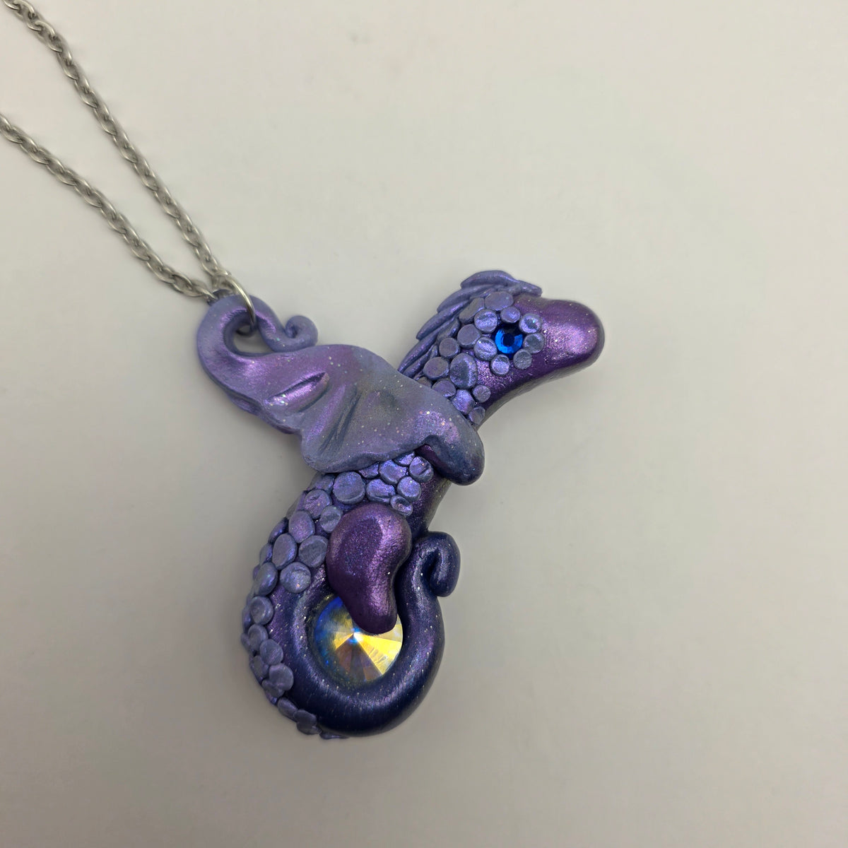 This purple dragon has a lovely shimmer to it, shining from light purple to blue depending on the light and angle.  It also shows bits of iridescent glitter, especially in the wings. It has blue rhinestone eyes and is holding onto aurora borealis crystals, which pick up multiple colors as they sparkle.  This dragon is entirely unique, sculpted with polymer with polymer clay, two Prestige Rivoli crystals, and rhinestones for eyes. Painted with gloss glaze to keep it from spreading glitter wherever it goes.