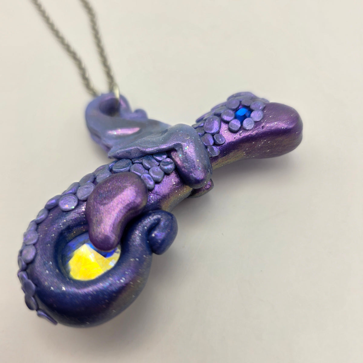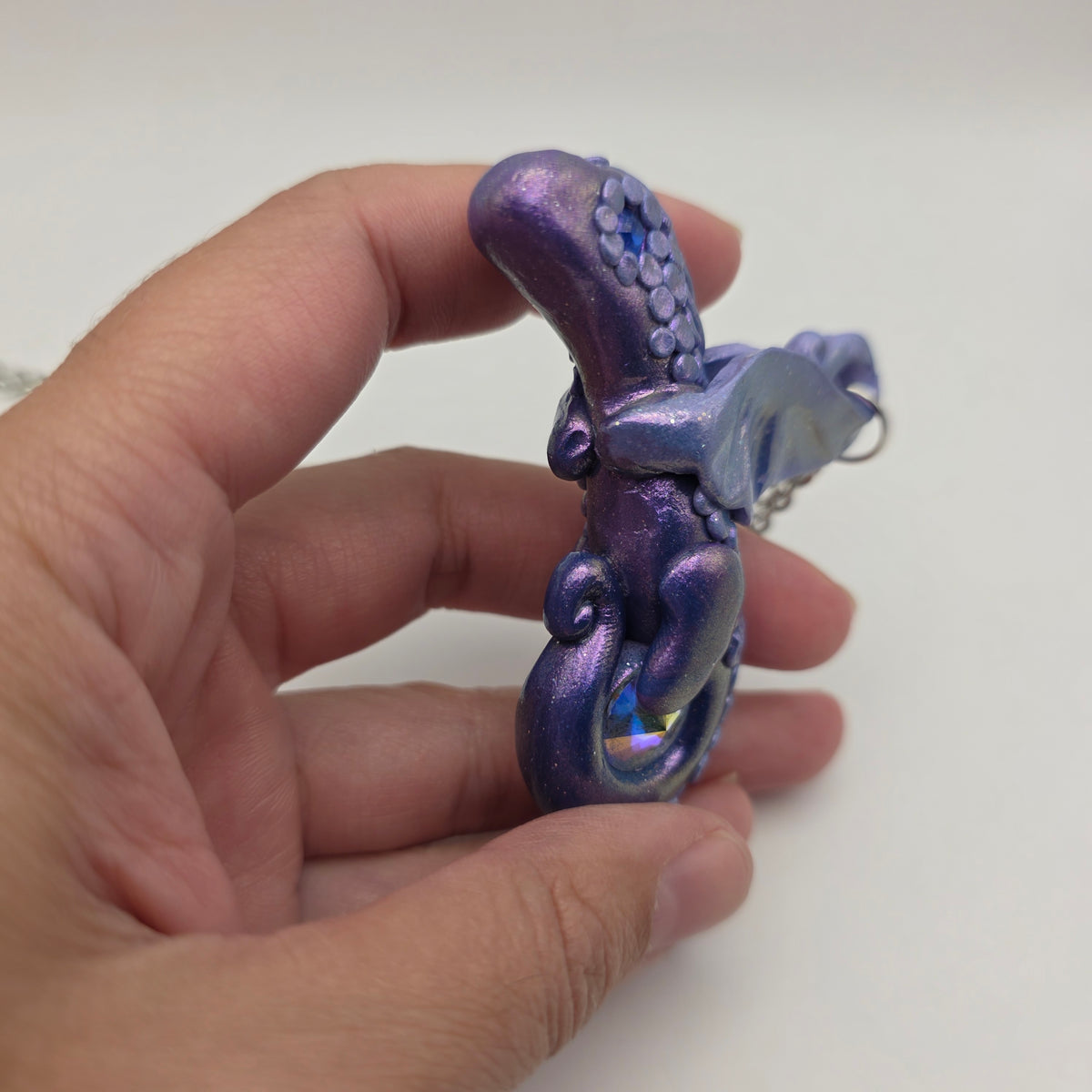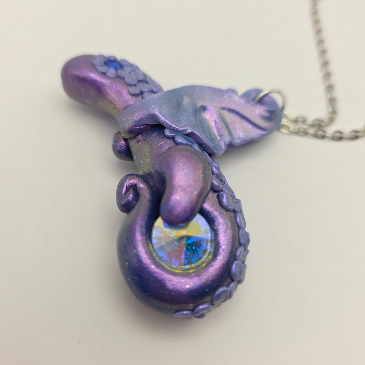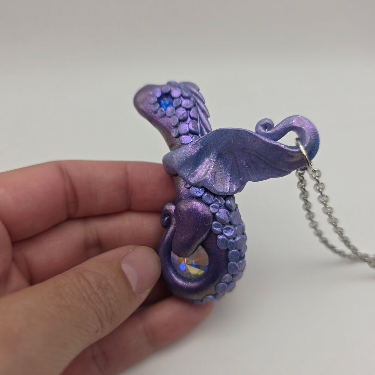 This purple dragon has a lovely shimmer to it, shining from light purple to blue depending on the light and angle.  It also shows bits of iridescent glitter, especially in the wings. It has blue rhinestone eyes and is holding onto aurora borealis crystals, which pick up multiple colors as they sparkle.  This dragon is entirely unique, sculpted with polymer with polymer clay, two Prestige Rivoli crystals, and rhinestones for eyes. Painted with gloss glaze to keep it from spreading glitter wherever it goes.