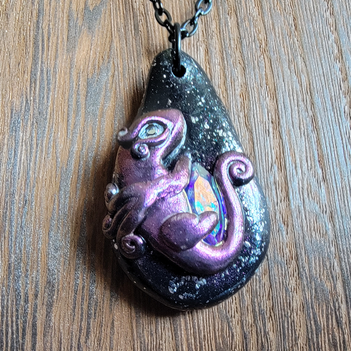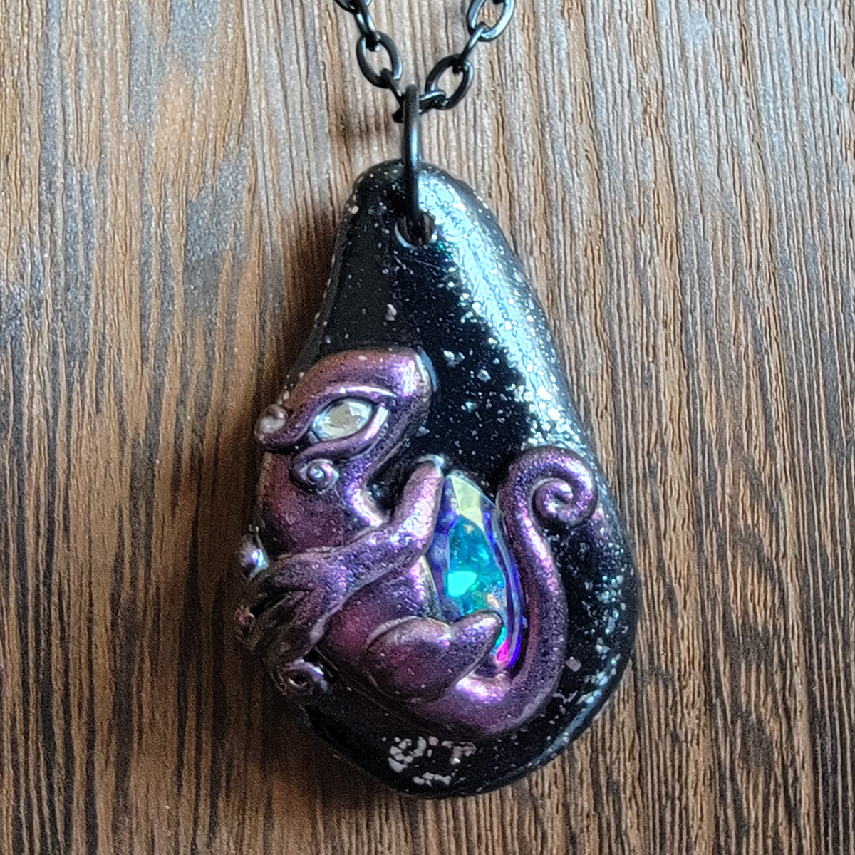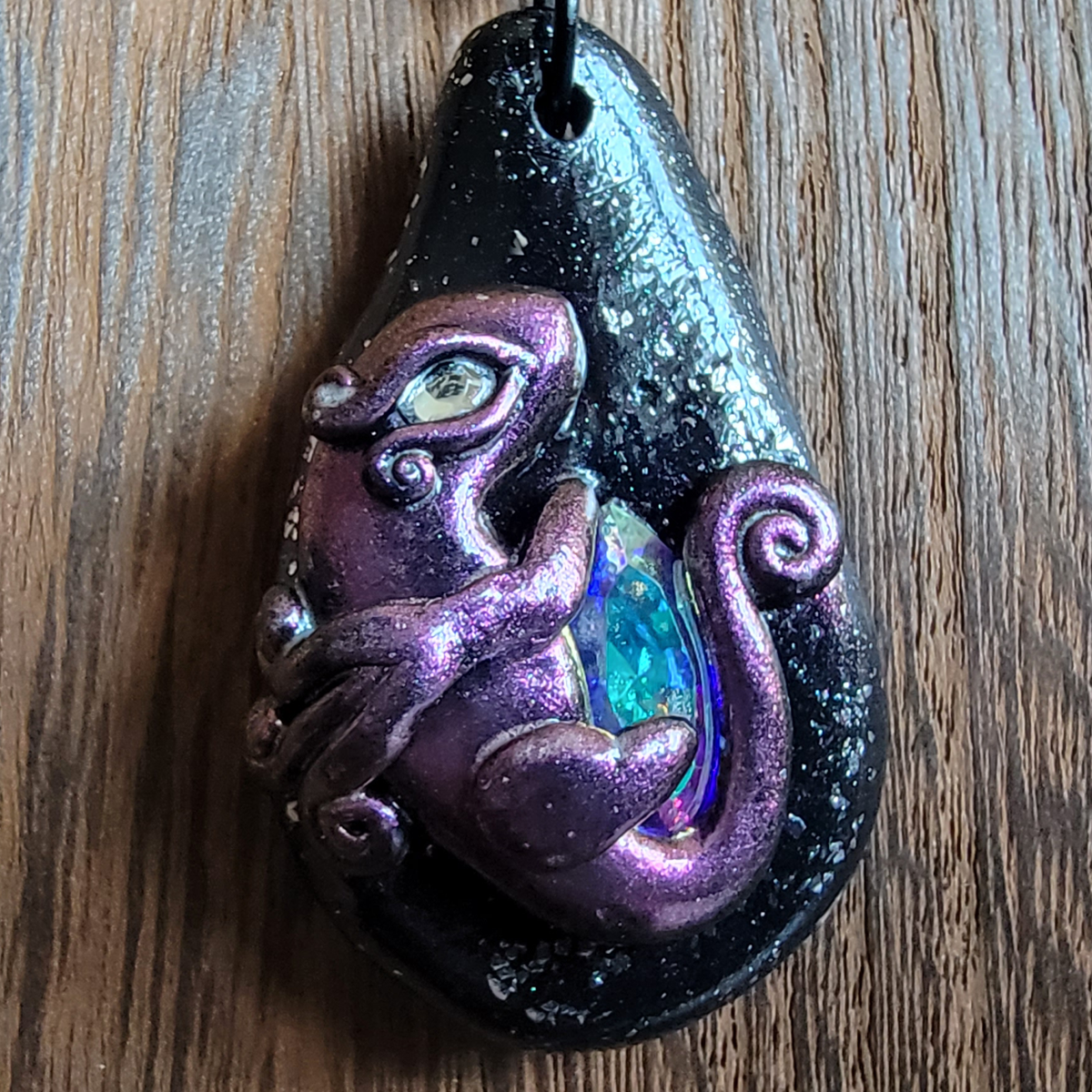 A polymer clay dragon pendant wrapped up around it's Swarovski crystal treasure, an Aurora Borealis navette crystal.