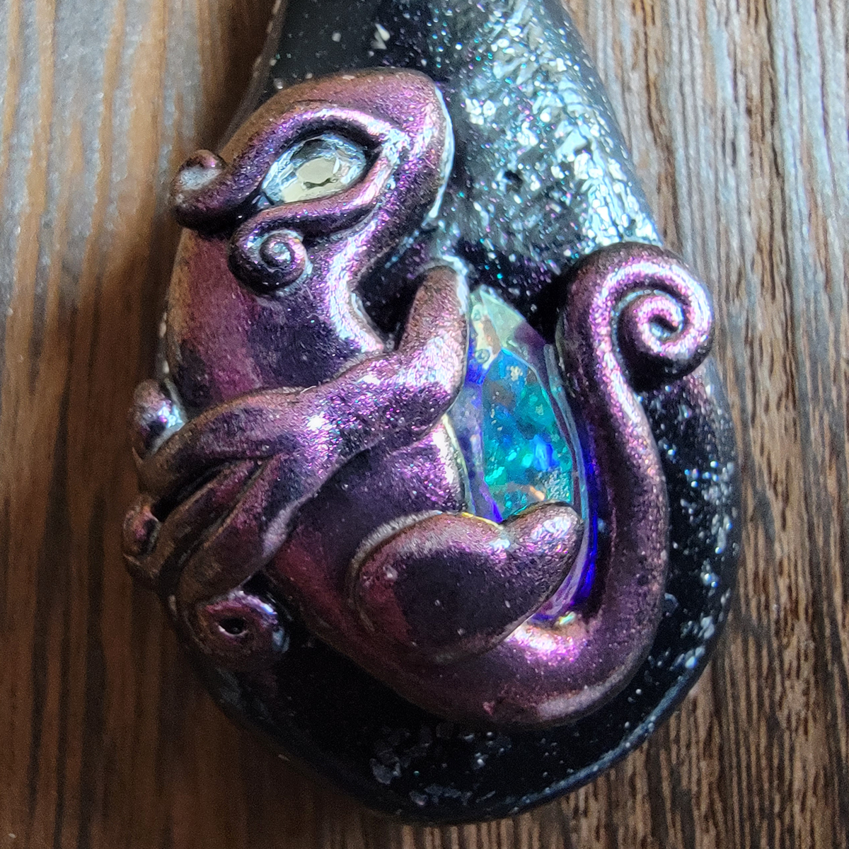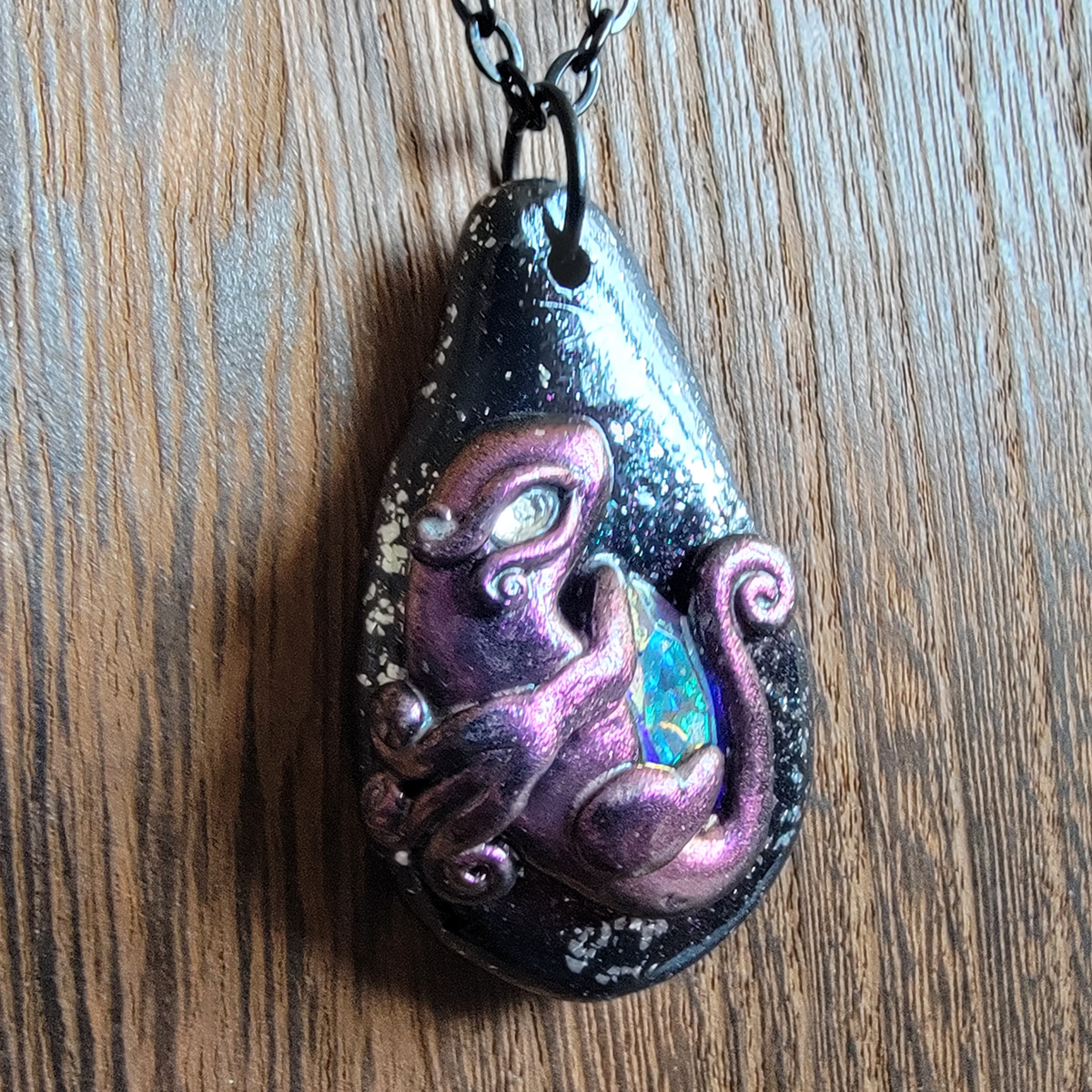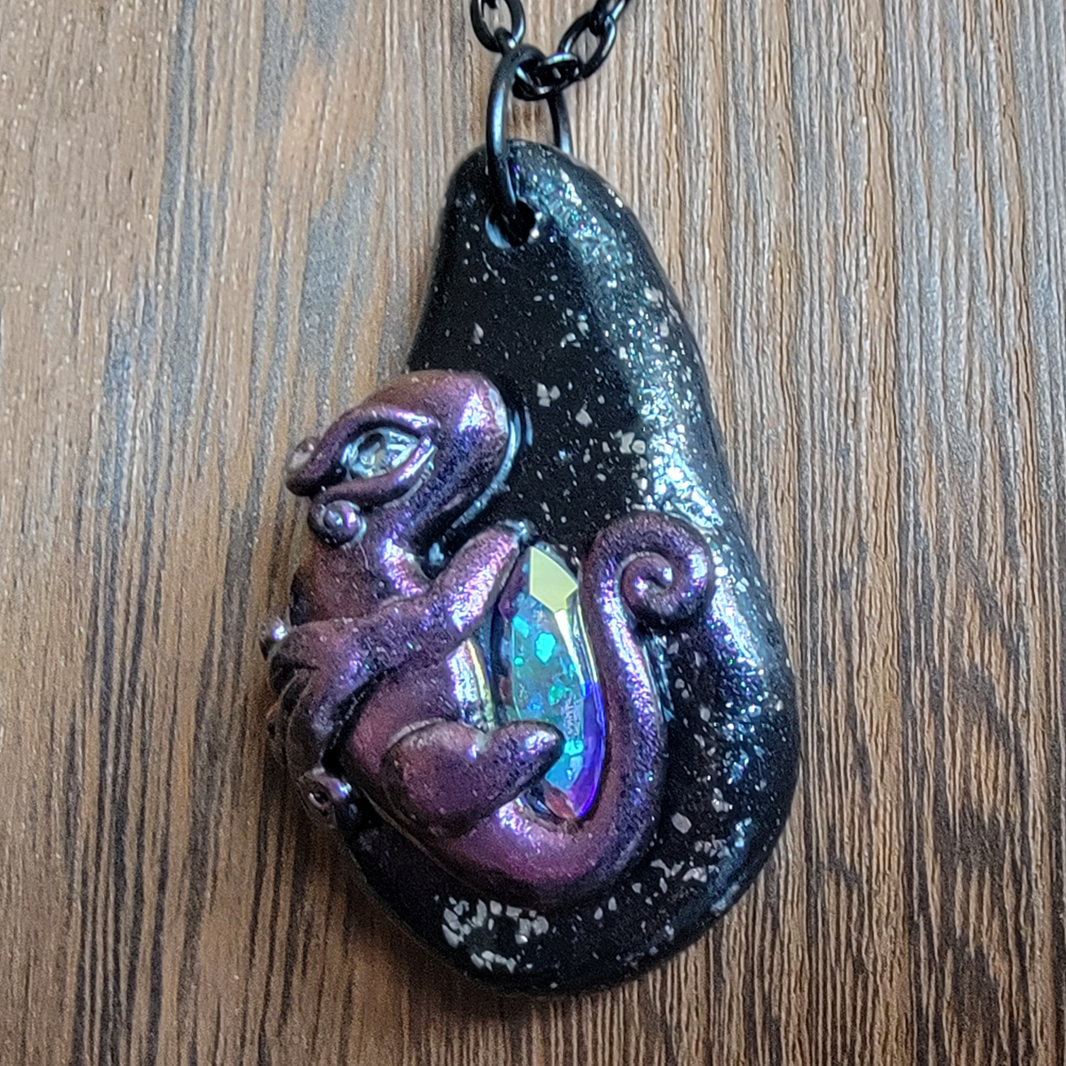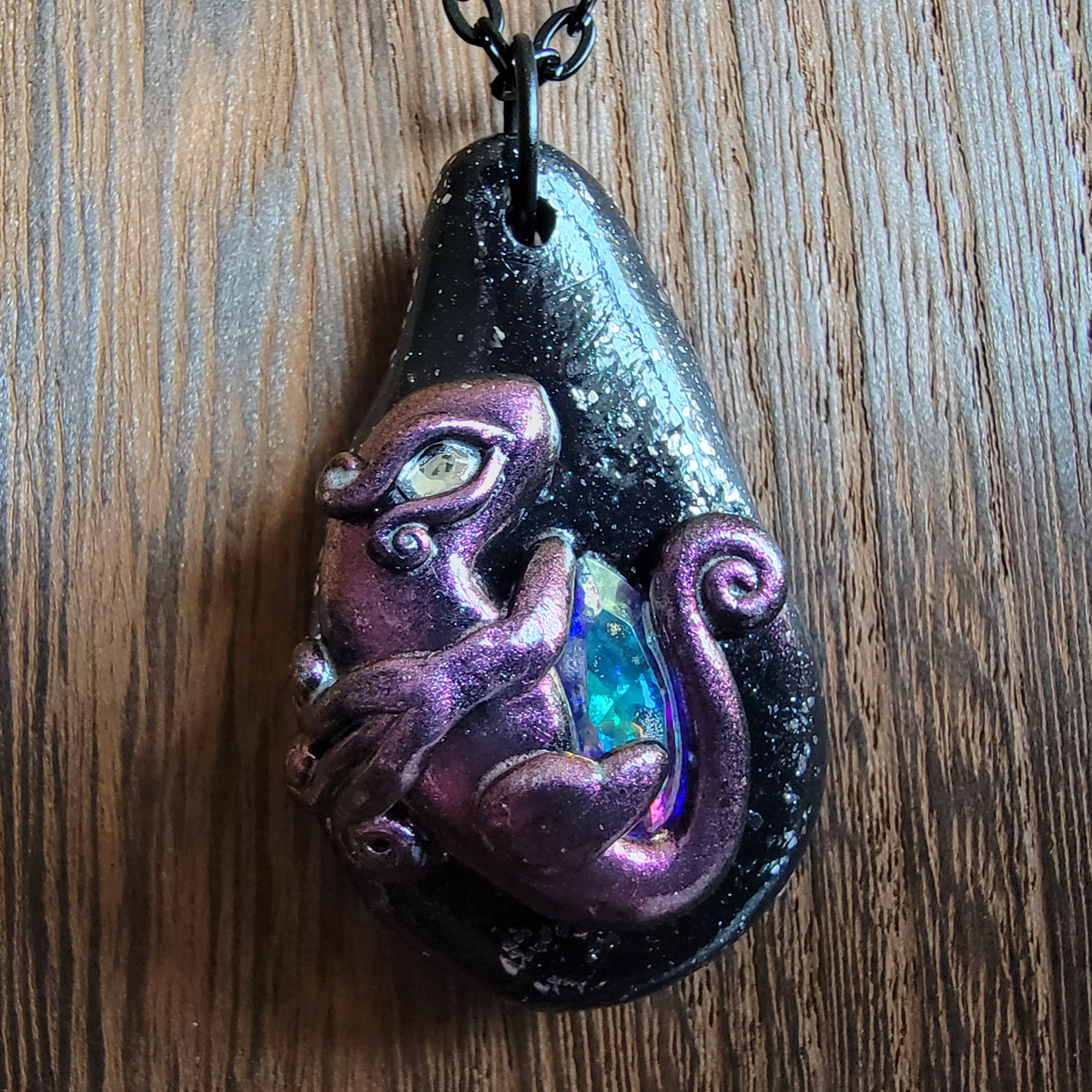A polymer clay dragon pendant wrapped up around it's Swarovski crystal treasure, an Aurora Borealis navette crystal.