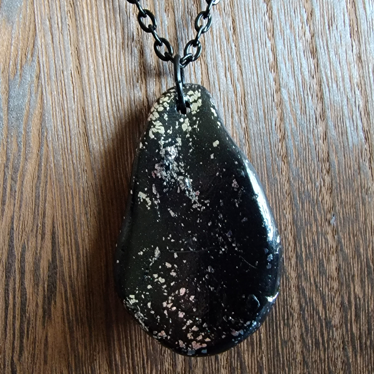 The dragon is hand sculpted and painted with a pinkish purple mica powder. It has a Preciosa rhinestone eye. The background is black with imitation silver foil flakes. The pendant has been sealed with a glaze for extra shine and protection.