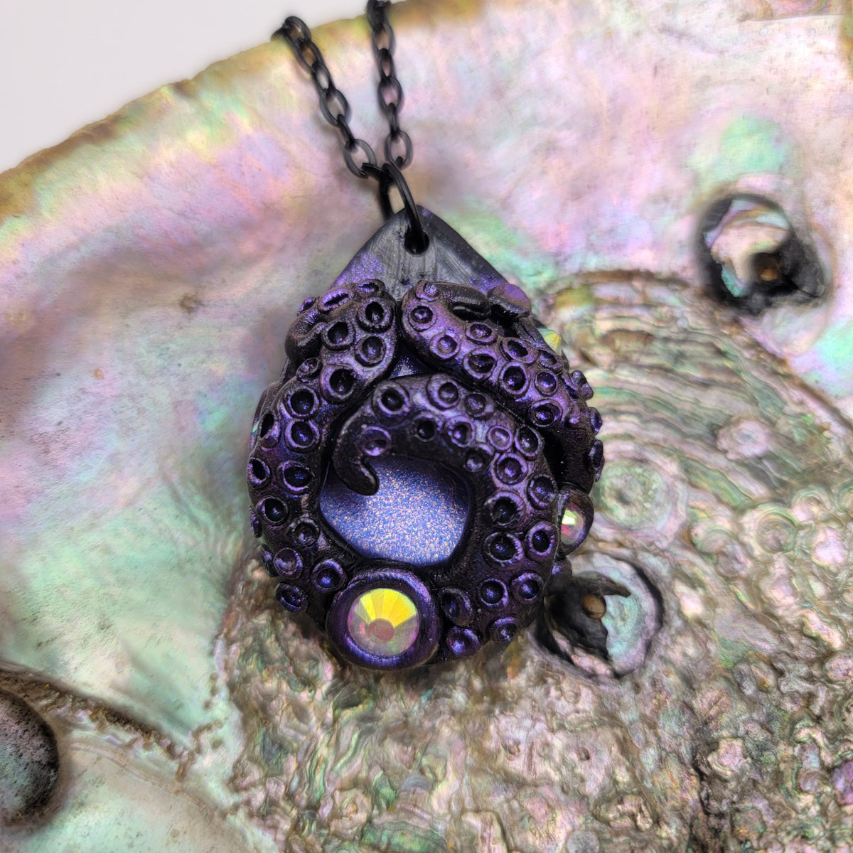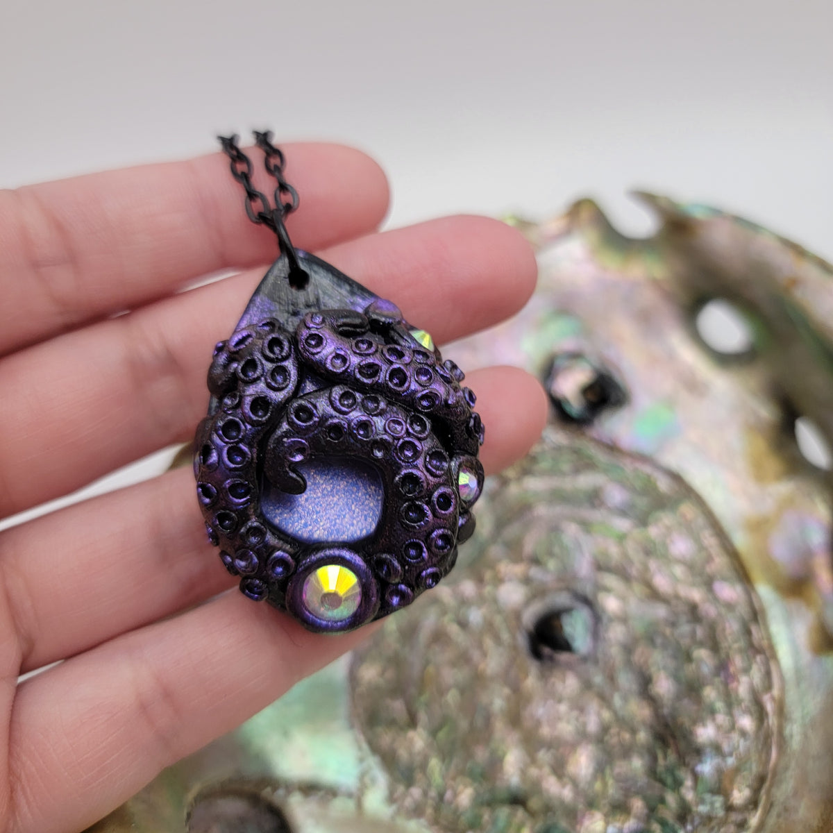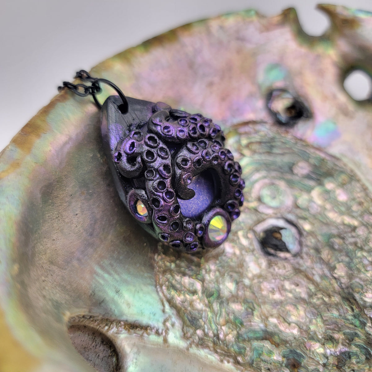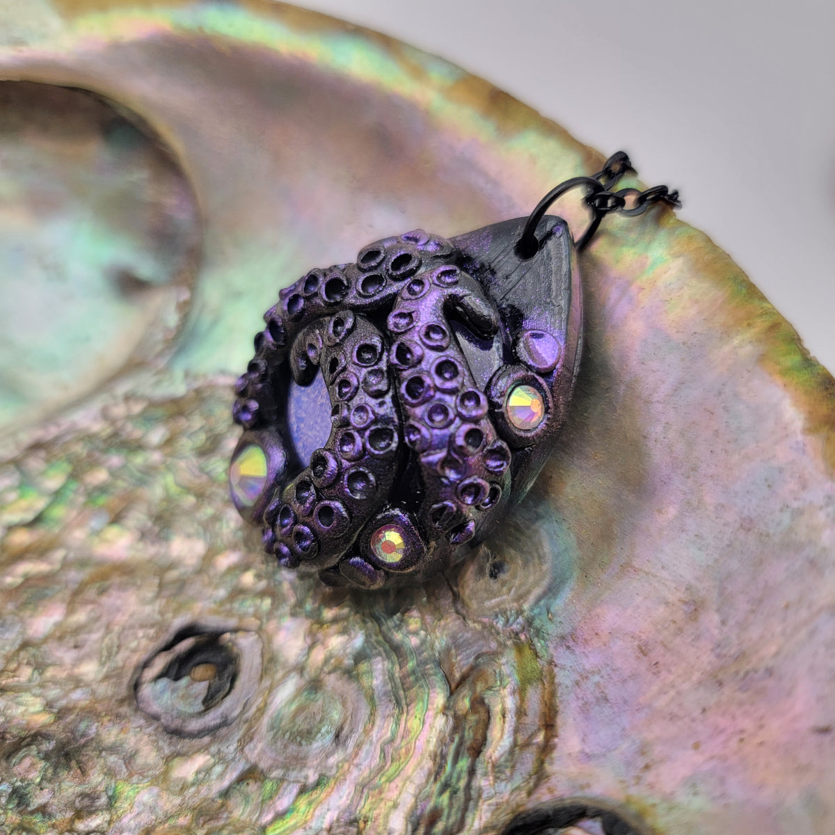 A one of a kind handmade pendant! Black polymer clay pendant with tentacles surrounding a shimmery purple painted glass cabochon. Accented with aurora borealis rhinestones that give an iridescent sparkle, and brushed with purple chameleon powder to accentuate the tentacles. This pendant is sealed with gloss glaze for extra shine.