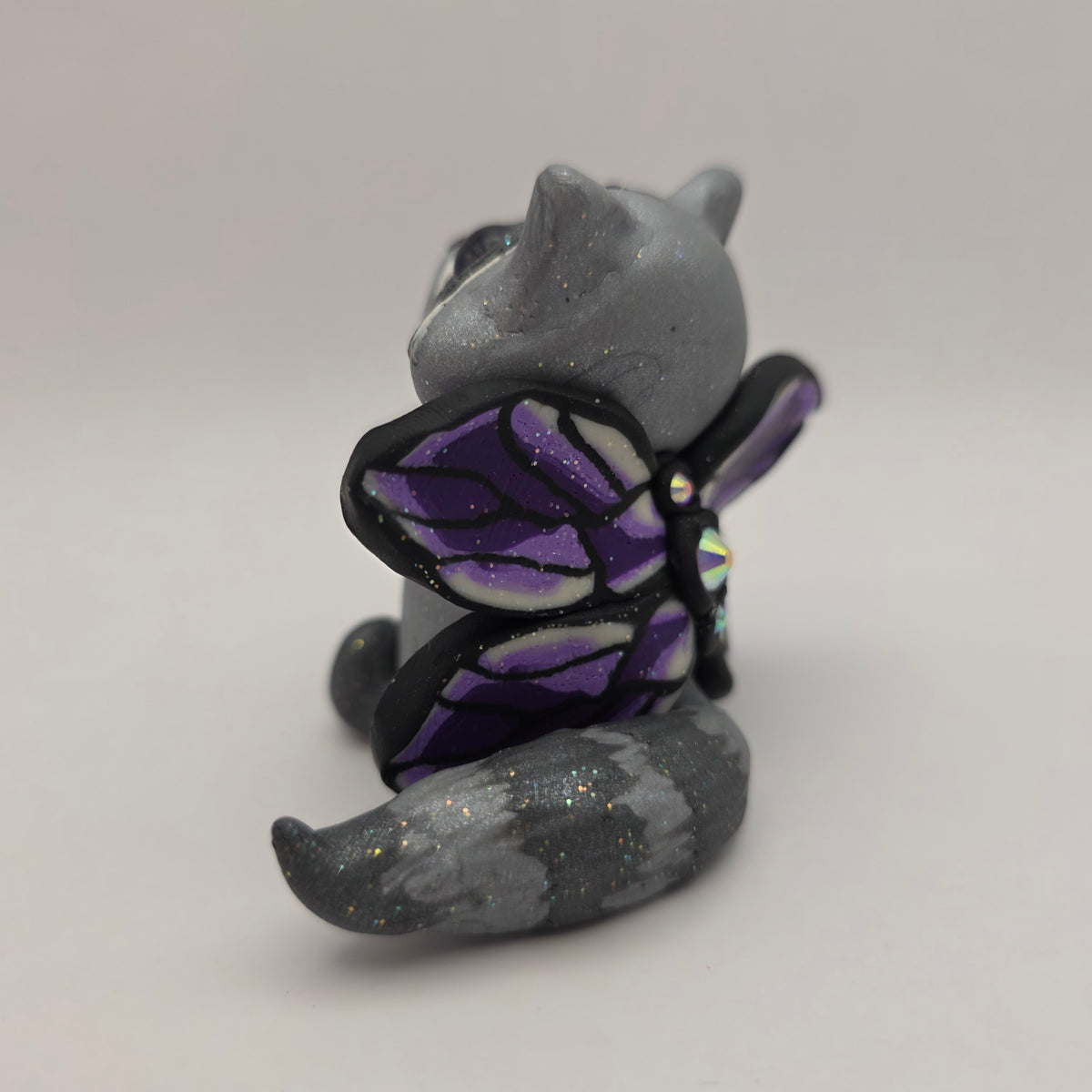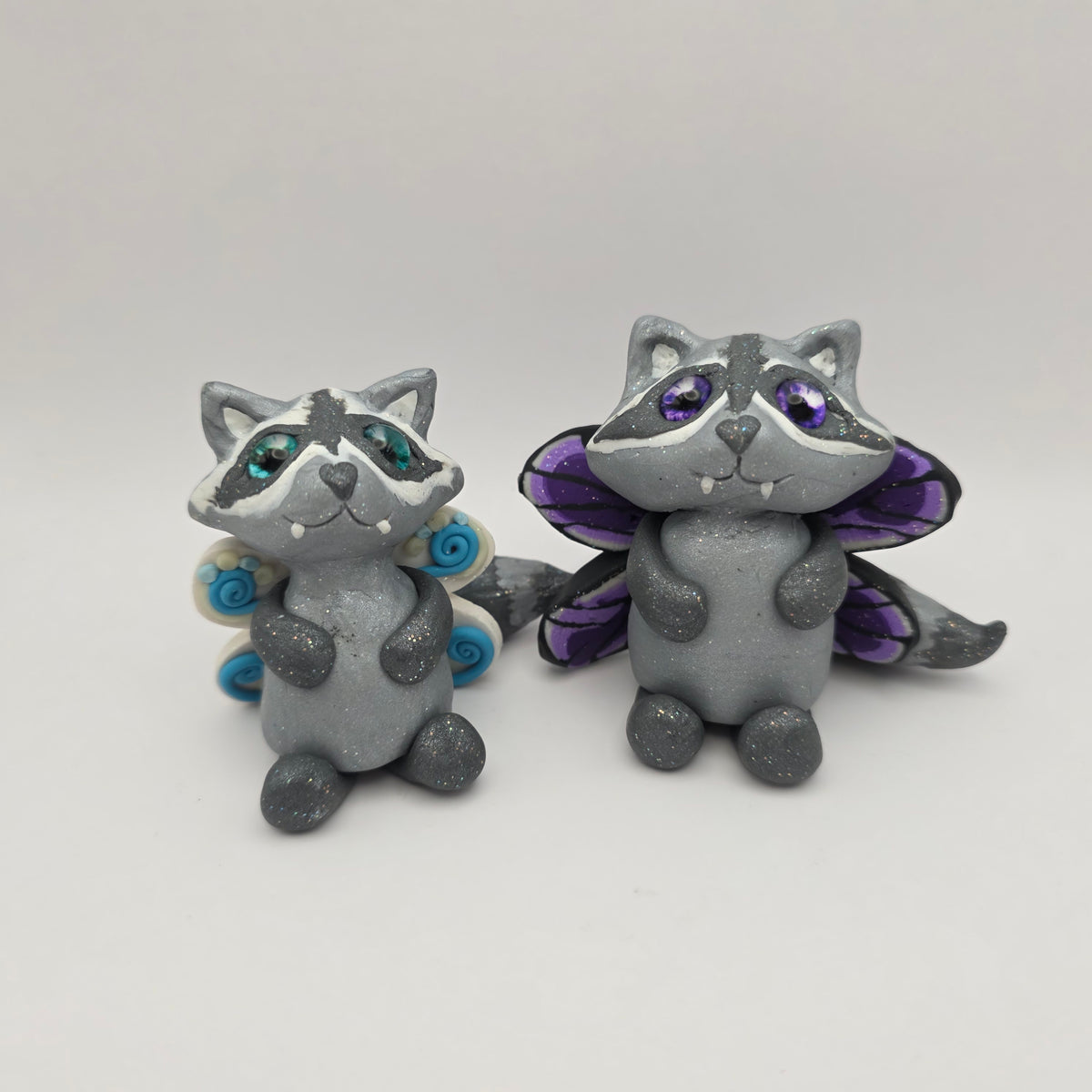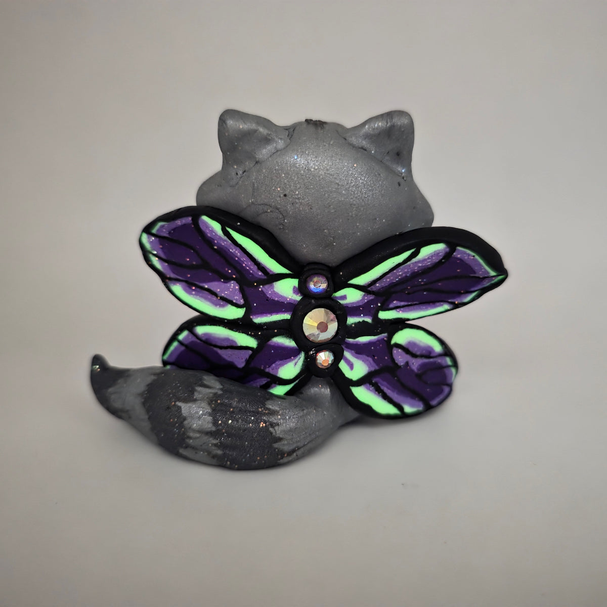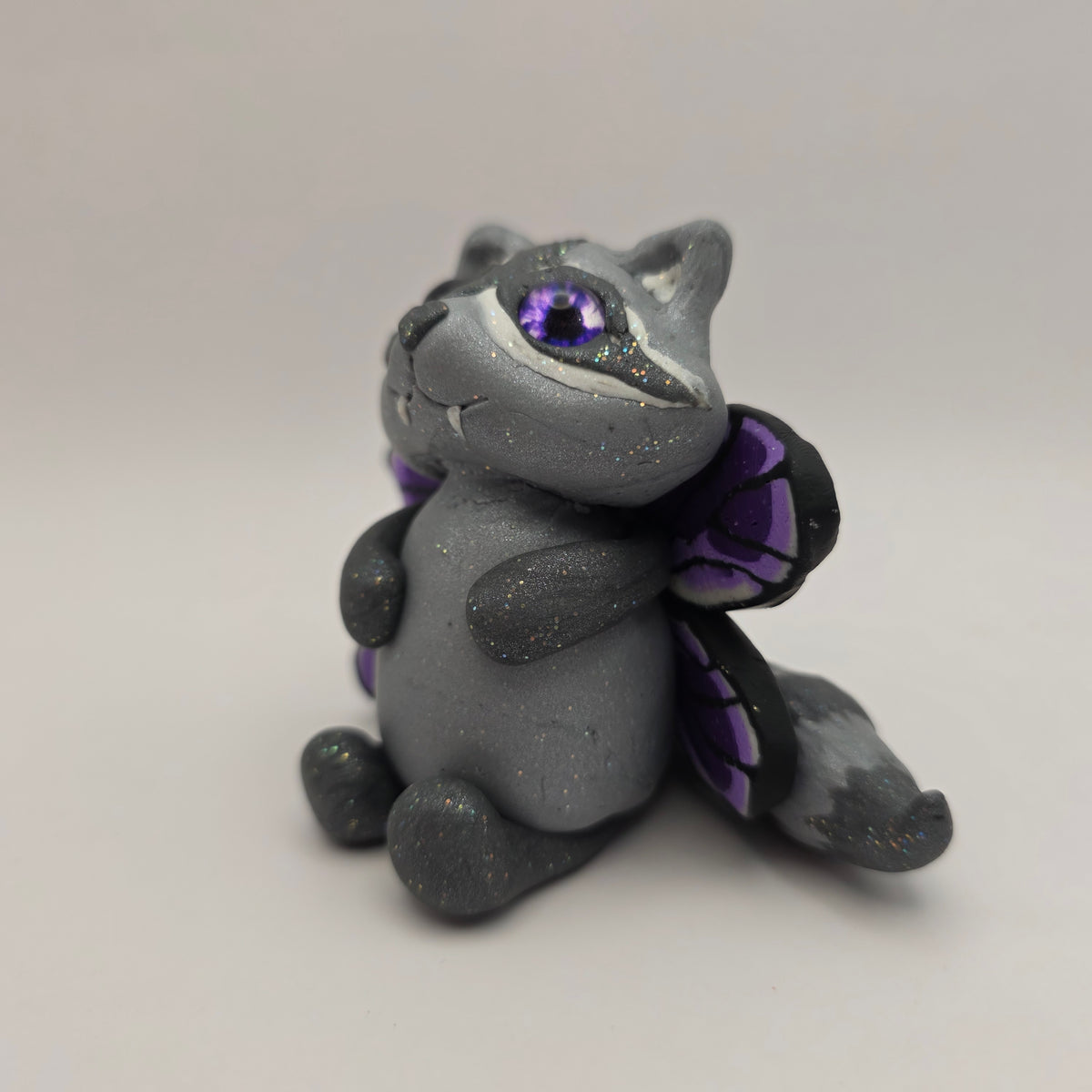 Meet Cookie the raccoon fairy! Cookie is the first of the feral fairies with butterfly style wings, and is the largest of the raccoon fairies (see final photo of Cookie with Lasagna for a sense of size). With purple eyes and wings of sparkling purple, lavender, white, with black veins and iridescent rhinestones.