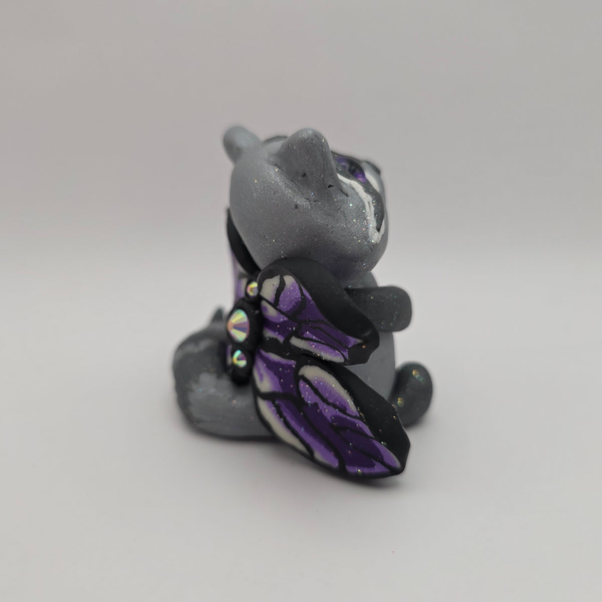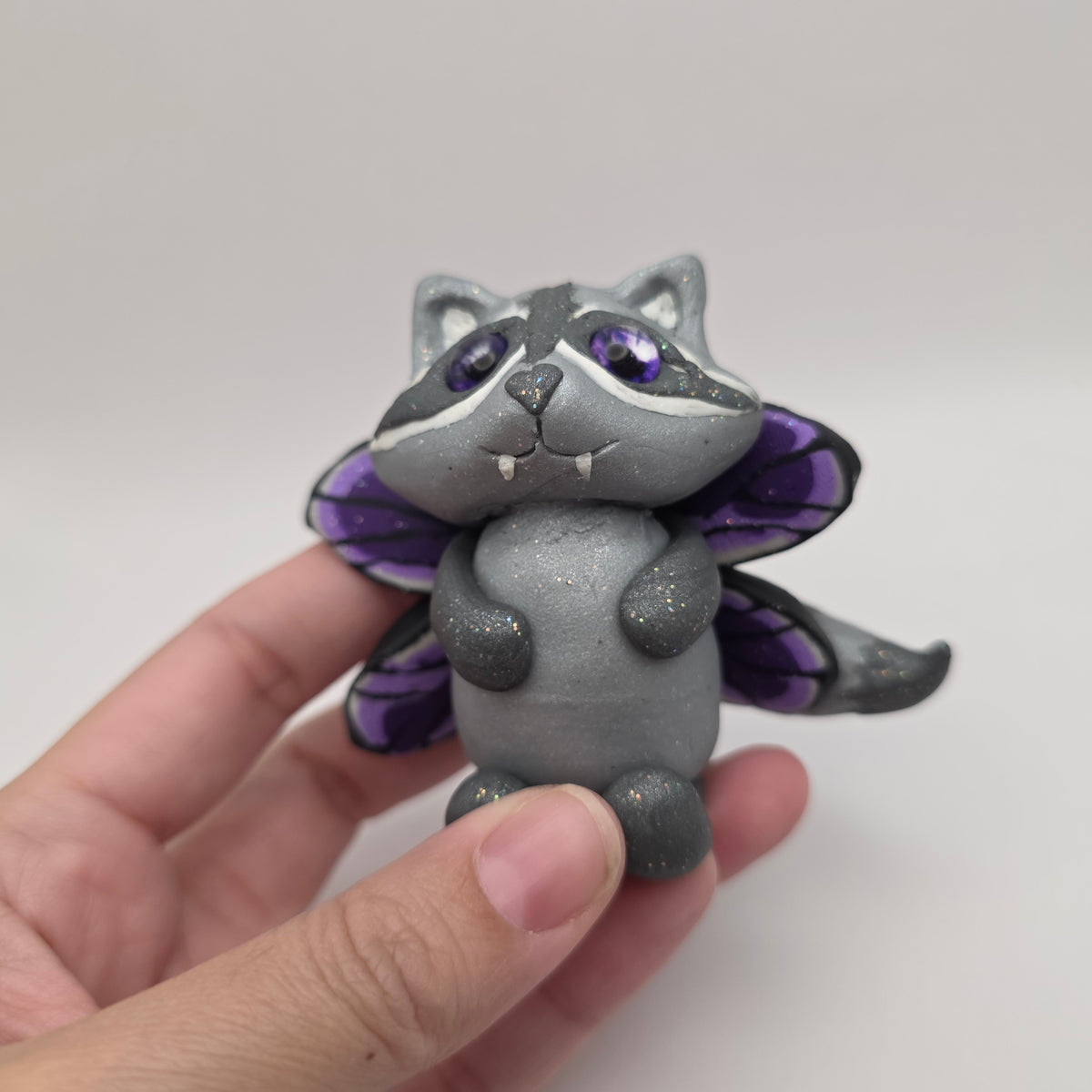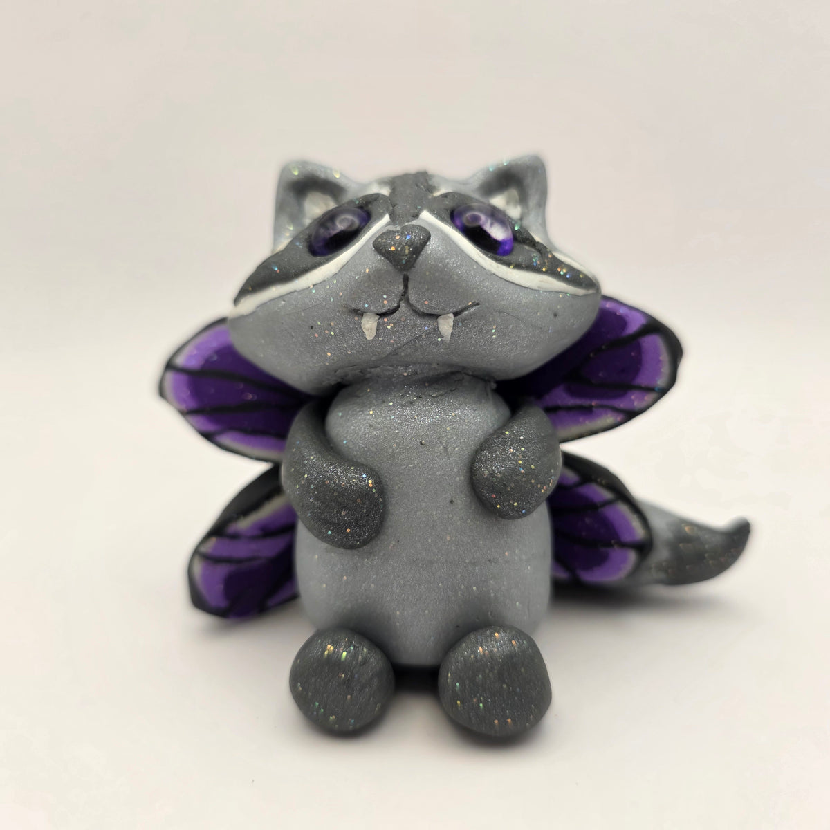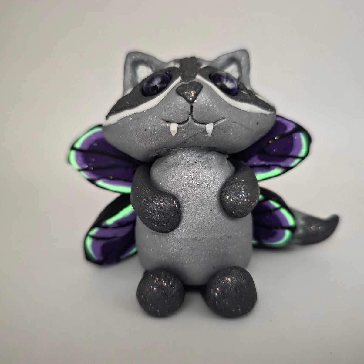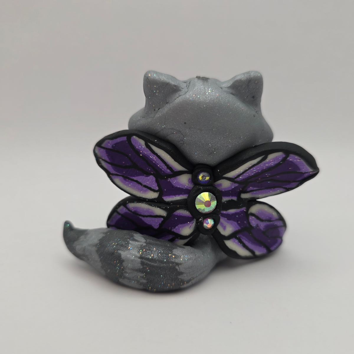 Meet Cookie the raccoon fairy! Cookie is the first of the feral fairies with butterfly style wings, and is the largest of the raccoon fairies (see final photo of Cookie with Lasagna for a sense of size). With purple eyes and wings of sparkling purple, lavender, white, with black veins and iridescent rhinestones.