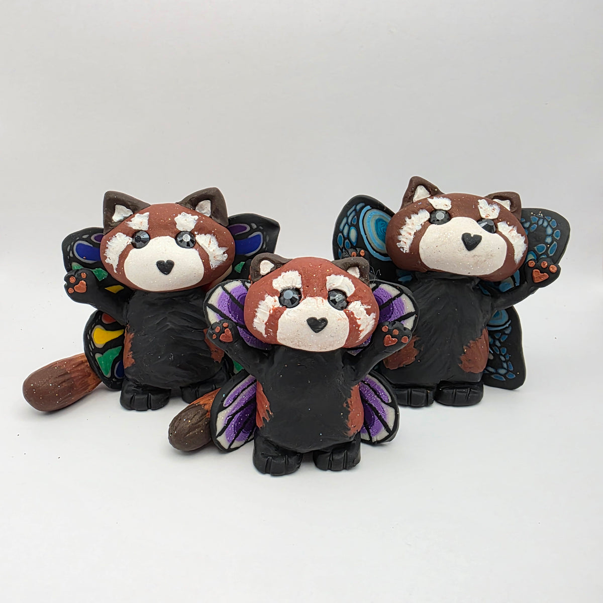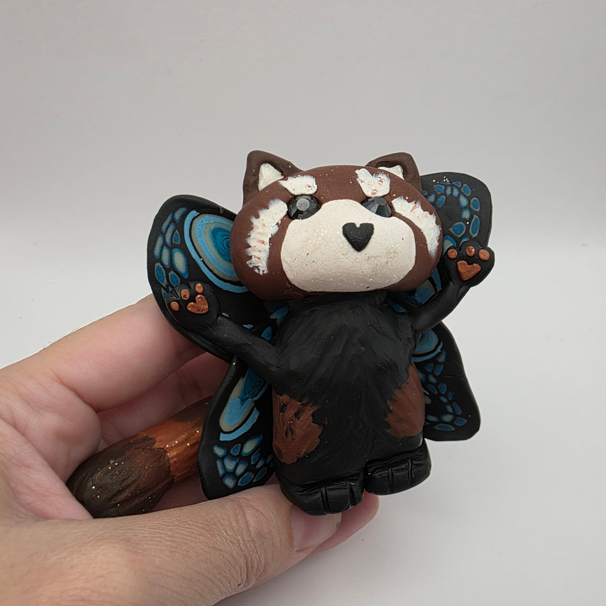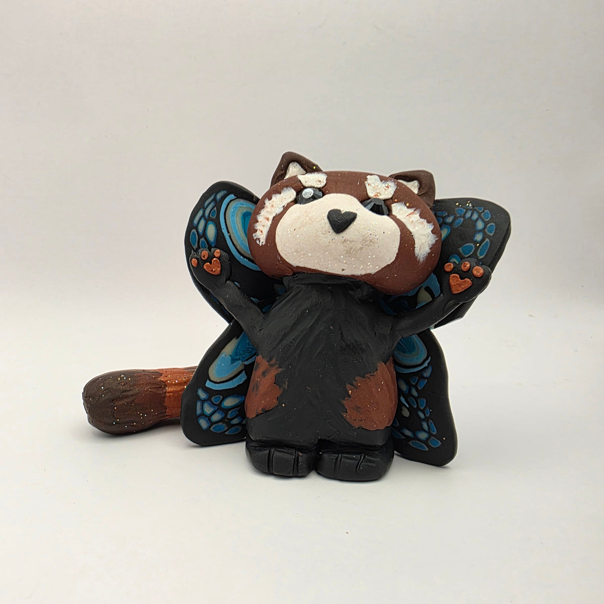 Meet Dizzy the red panda fairy! Dizzy has a heart shaped nose, sparkly eyes, and glowing butterfly-style wings. Their arms are held in the air showing off their heart paw pads, ready to come in for a hug, or perhaps an attack - no way to know which!