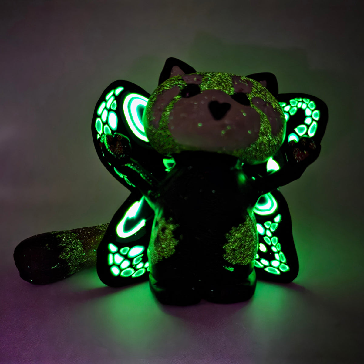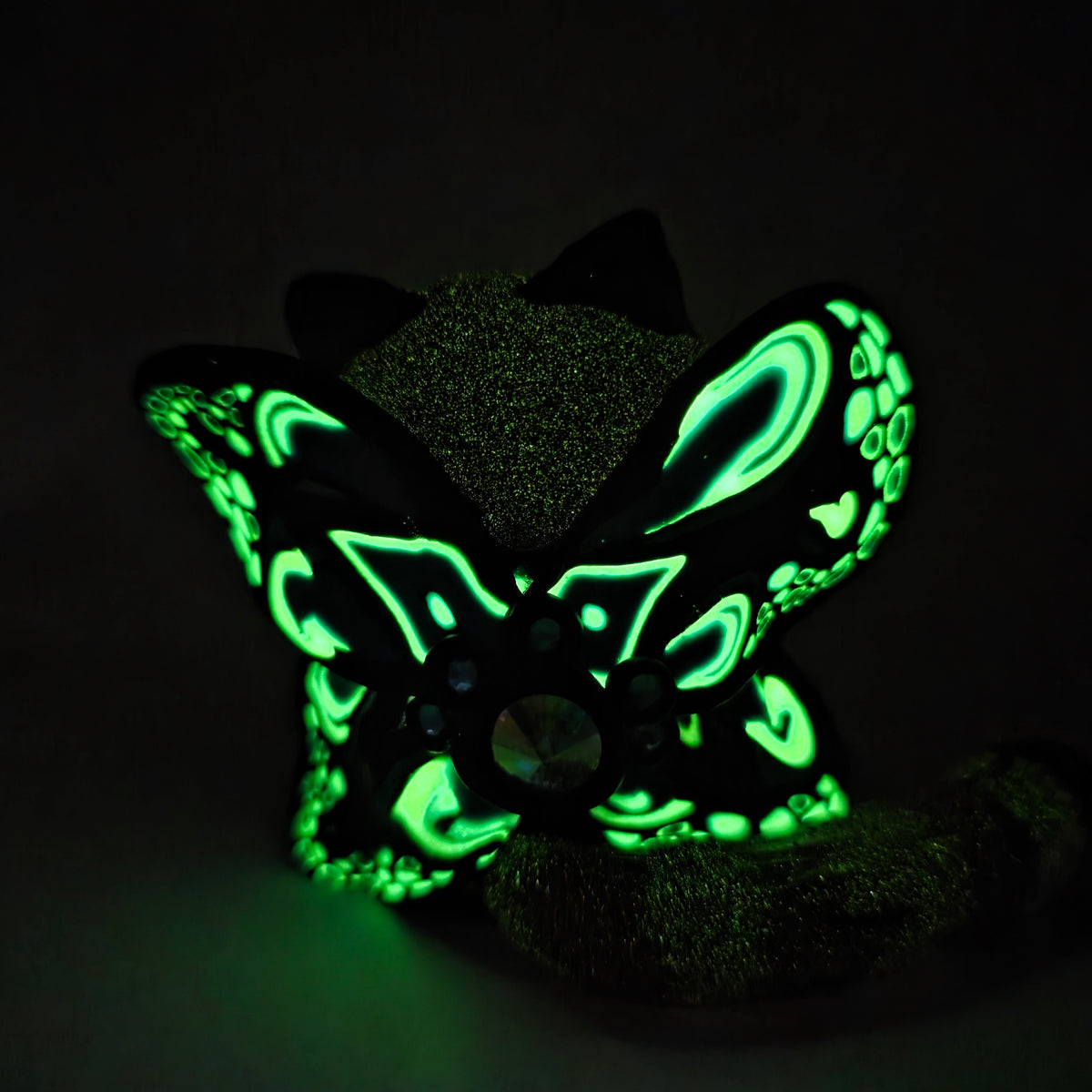Dizzy has wings with turquoise in two shades, white, and black. The white glows in the dark (glowing photos are taken after exposure to blacklight). The center of their wings are decorated with an aurora borealis Prestige crystal and turquoise rhinestones. Kip is bursting with extra glow and has delightfully chaotic wings.