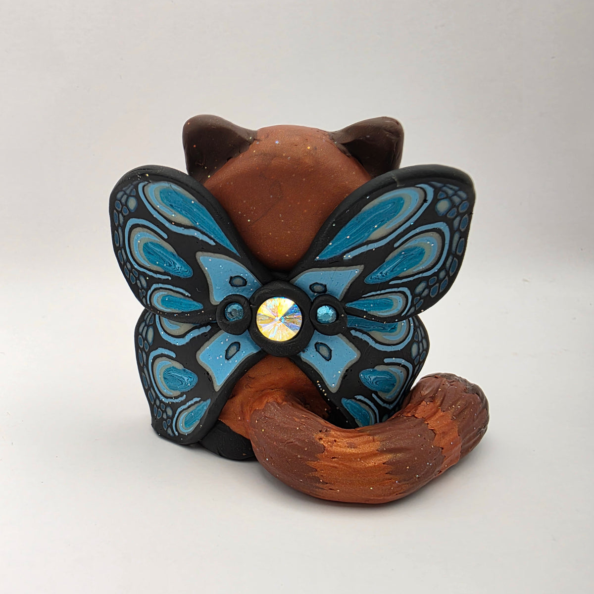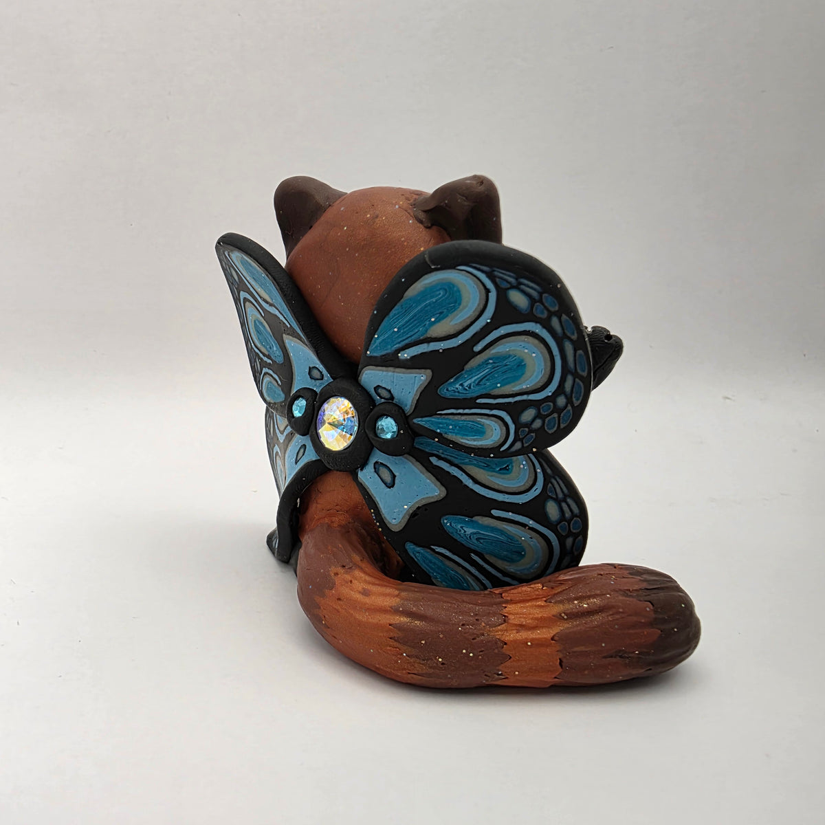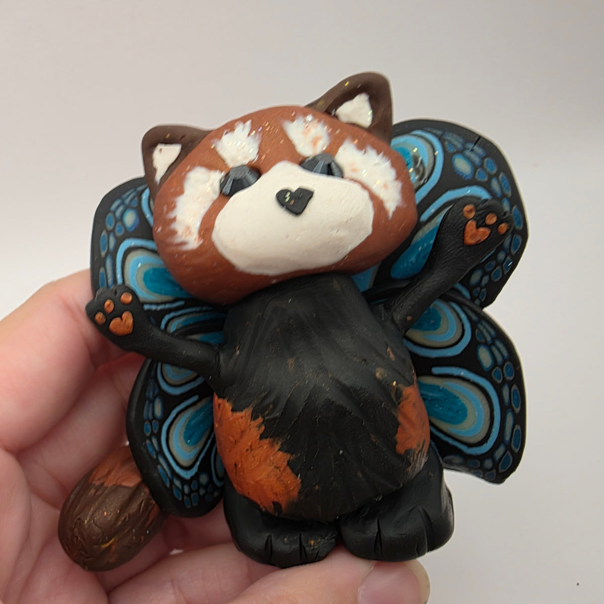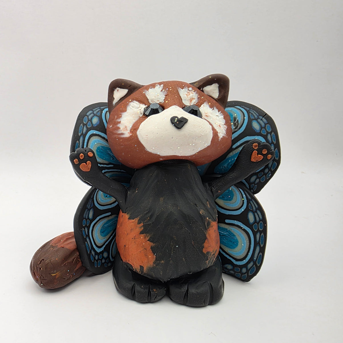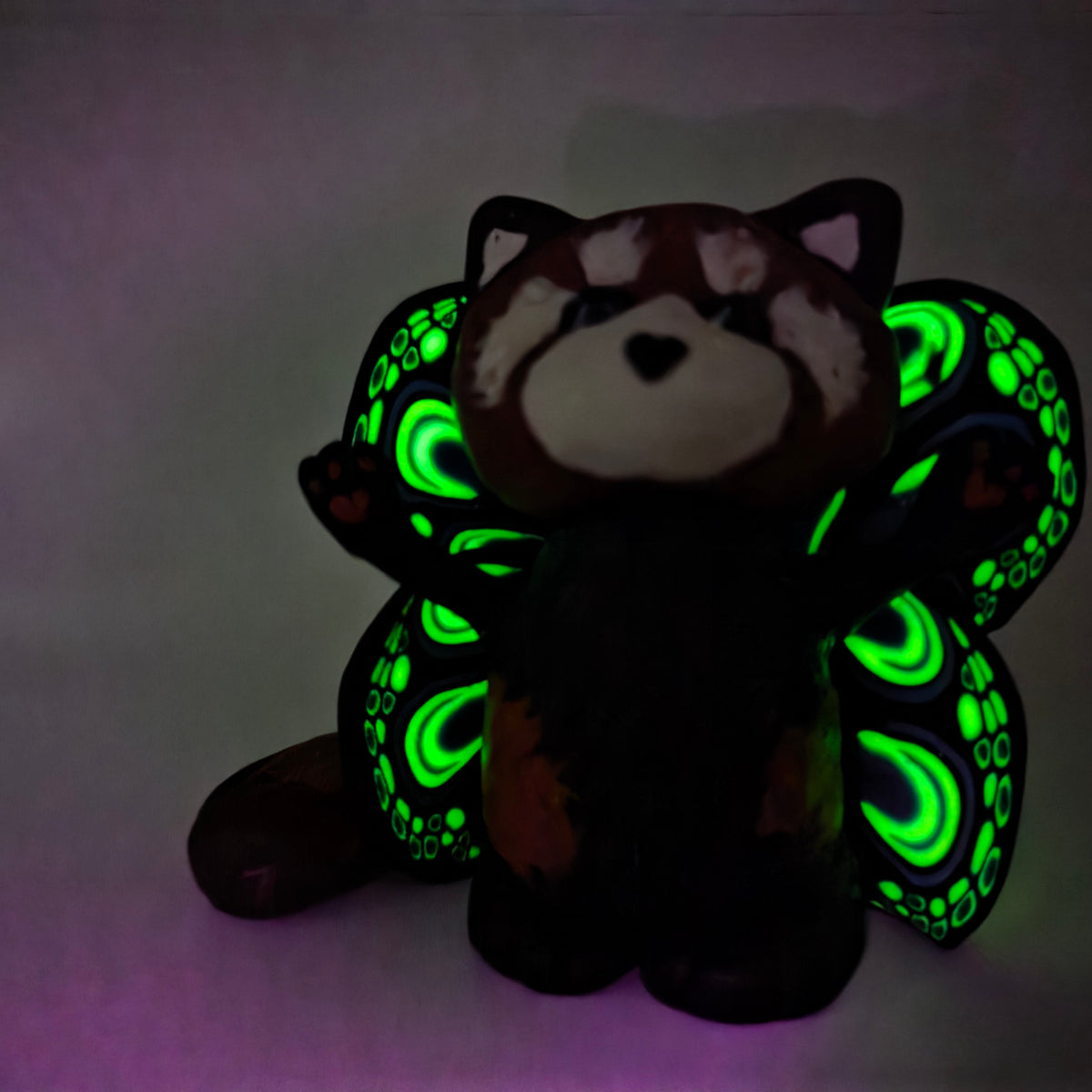 Meet Kip the red panda fairy! Kip has a heart shaped nose, sparkly eyes, and glowing butterfly-style wings.  Their arms are held in the air showing off their heart paw pads, ready to come in for a hug, or perhaps an attack - no way to know which!