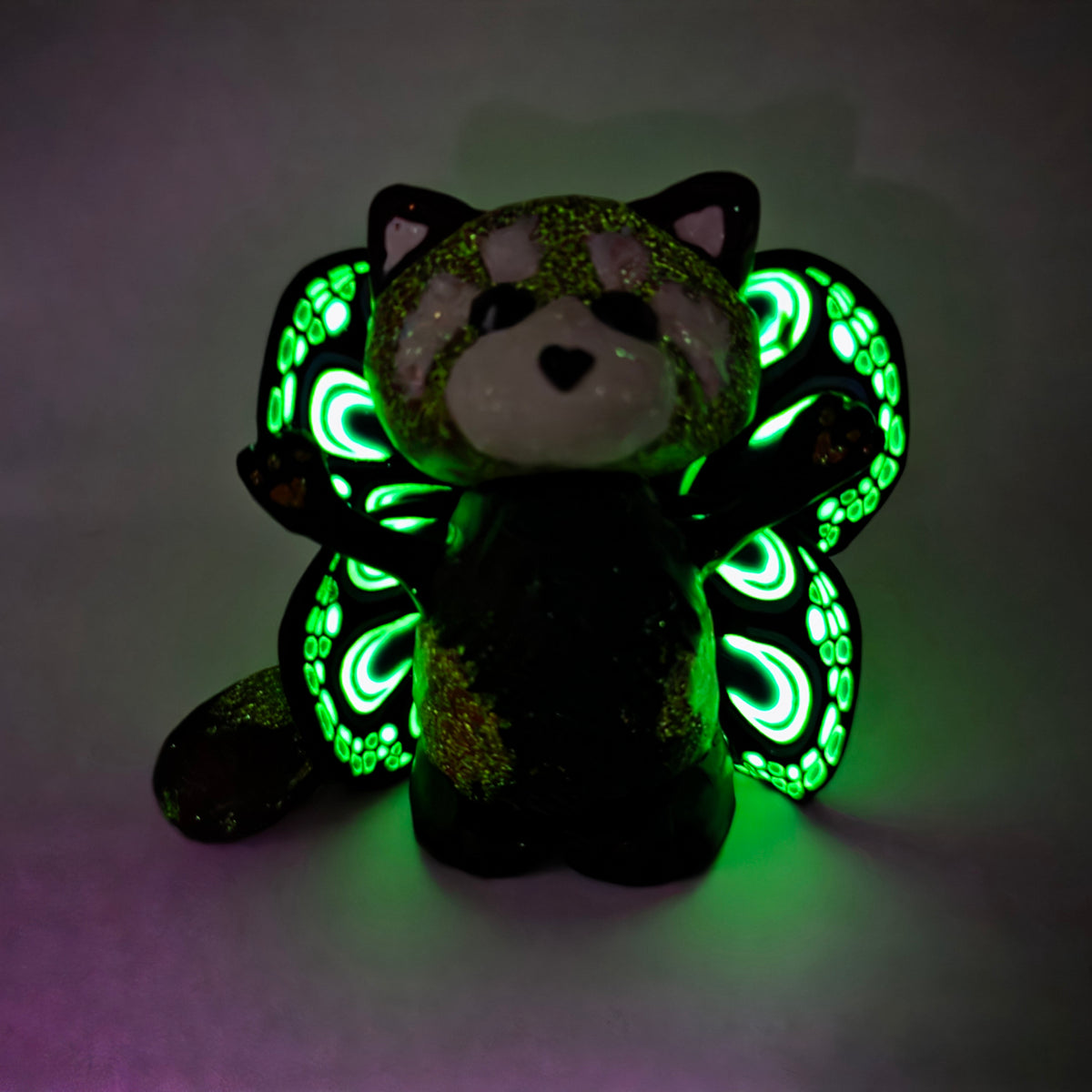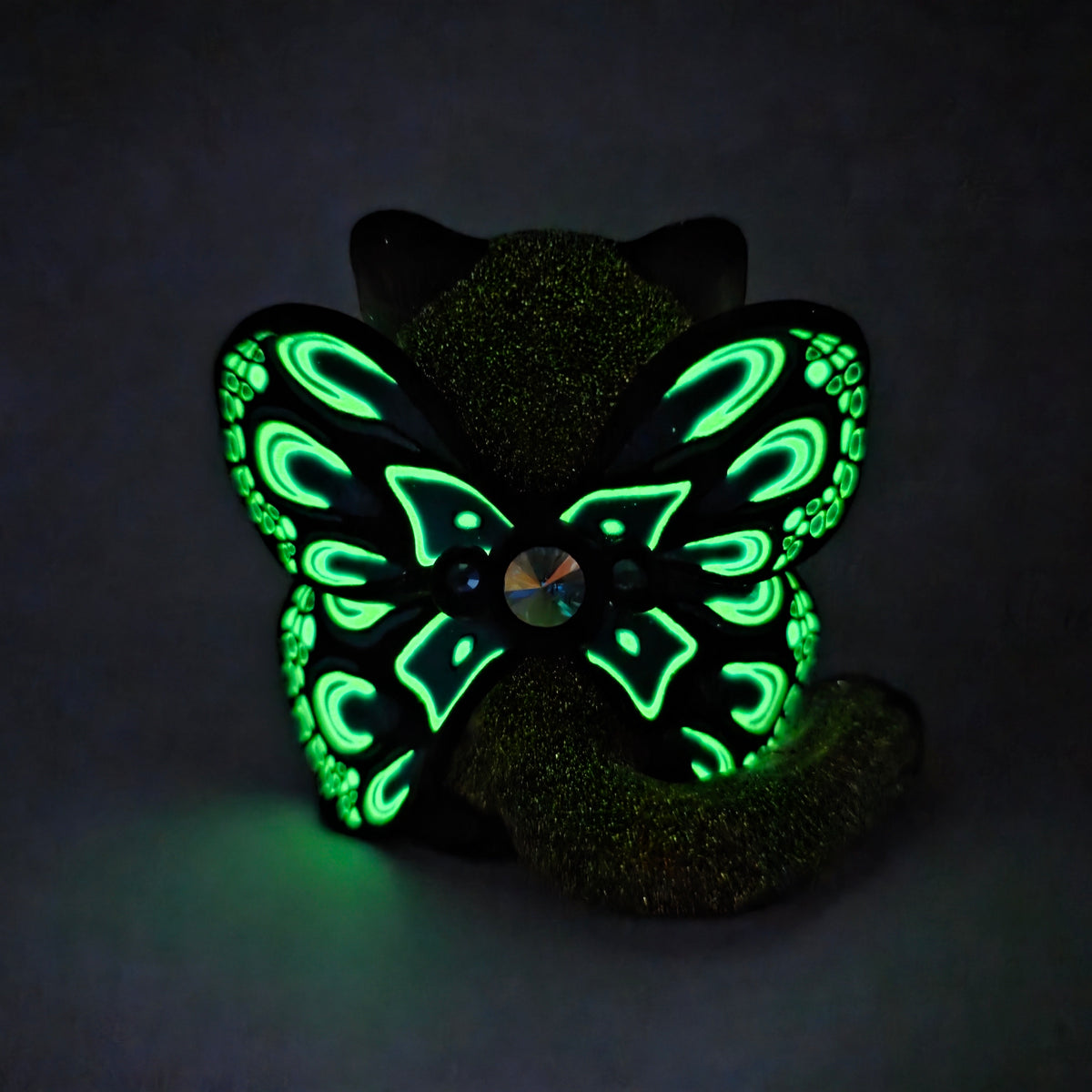 Kip has wings with turquoise in two shades, white, and black. The white glows in the dark (glowing photos are taken after exposure to blacklight). The center of their wings are decorated with an aurora borealis Prestige crystal and turquoise rhinestones.  Kip has a bit of extra magic, with parts of their face and body having glowing speckles as well!