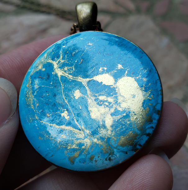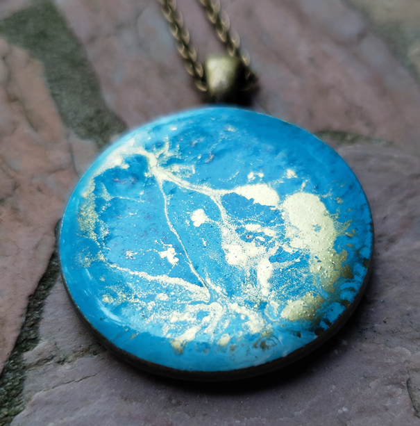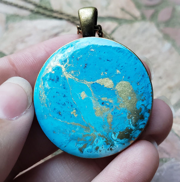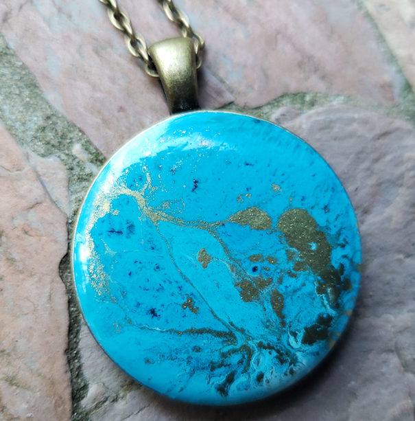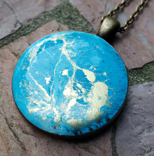 A resin pendant colored with alcohol ink. Turquoise and gold ink mix on this pendant to make a truly unique design that shines in the light. Set in a antique gold plated bezel, giving it a nice weight. Comes on a matching 18 inch chain.