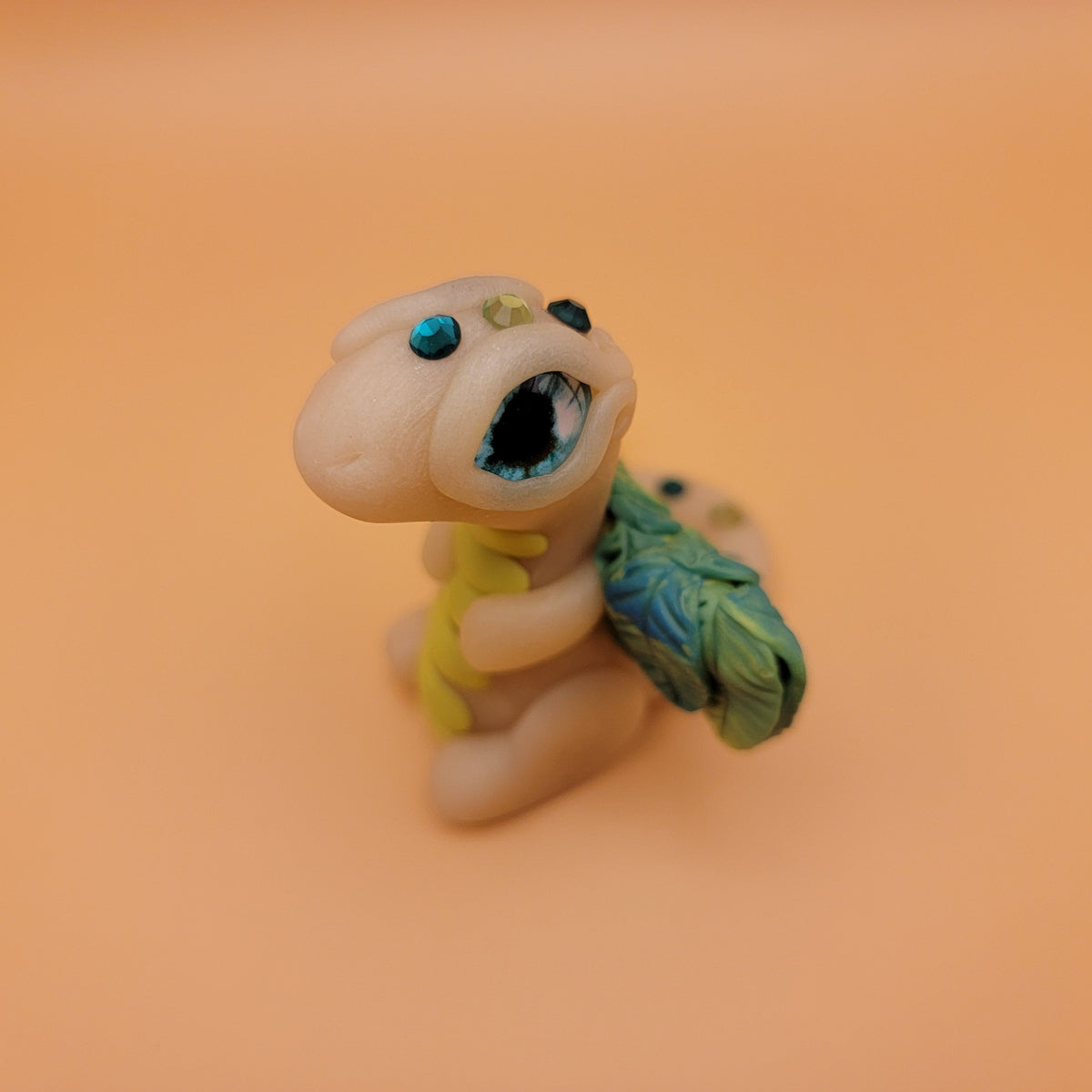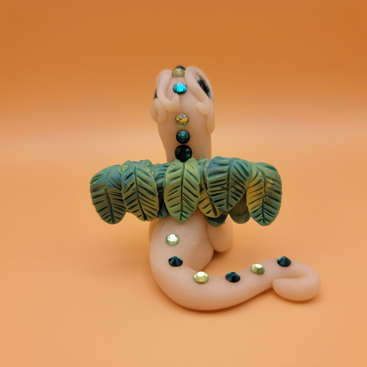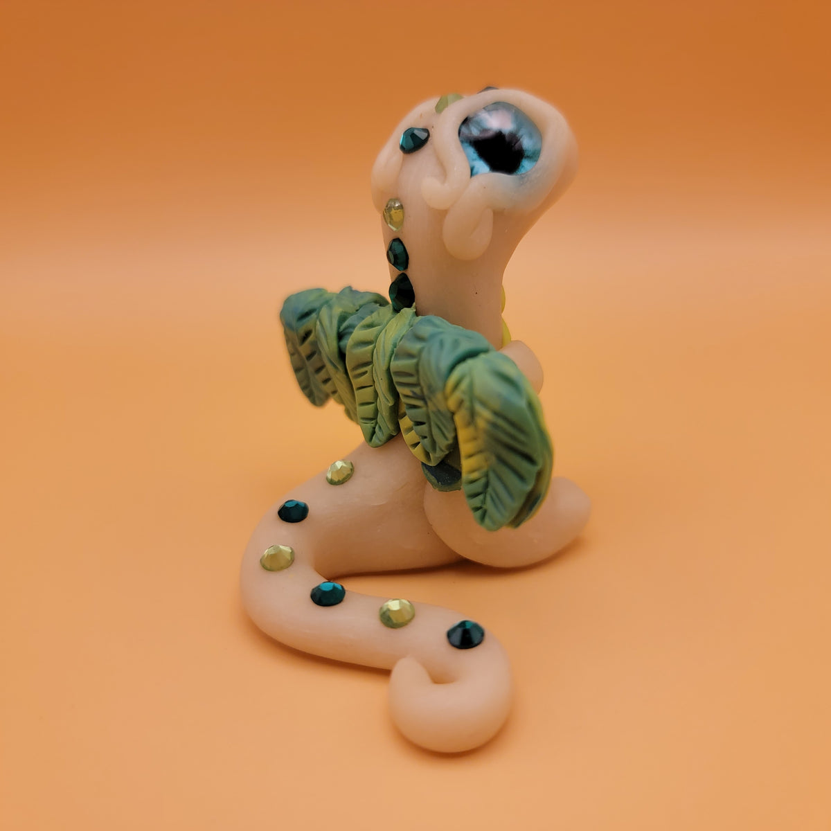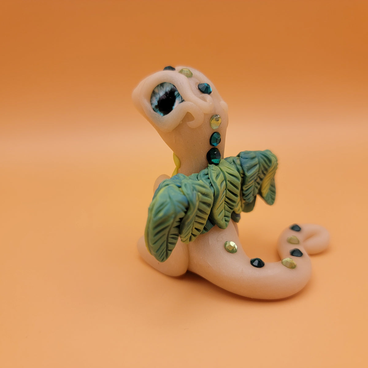 A glowing little dragon with colorful green wings, glass eyes, and rhinestones trailing down its back and tail. The only one of its kind!