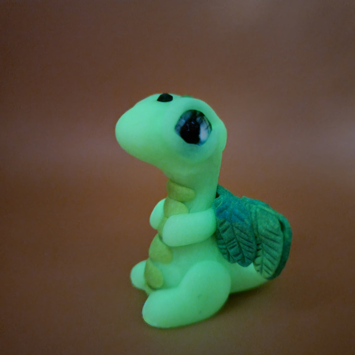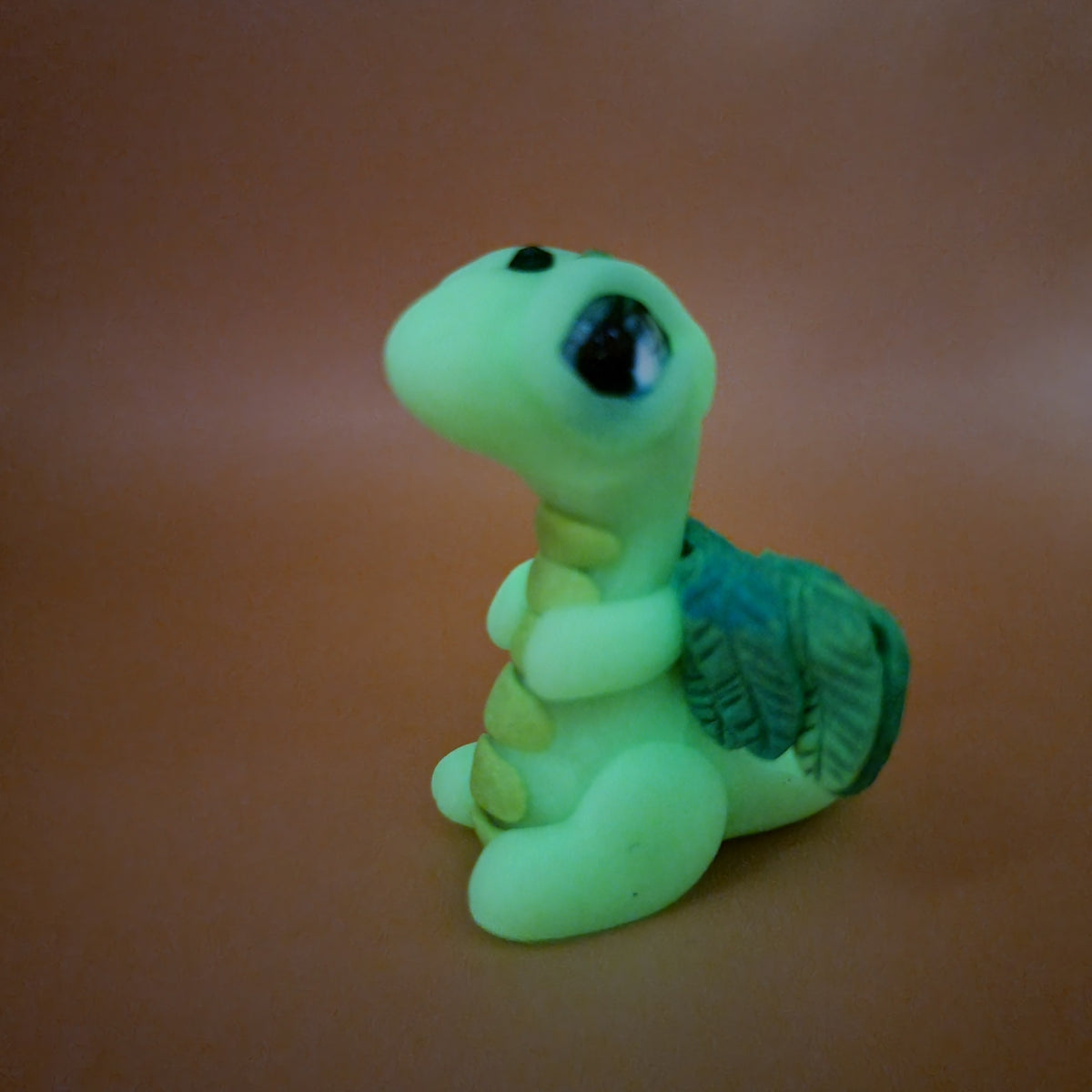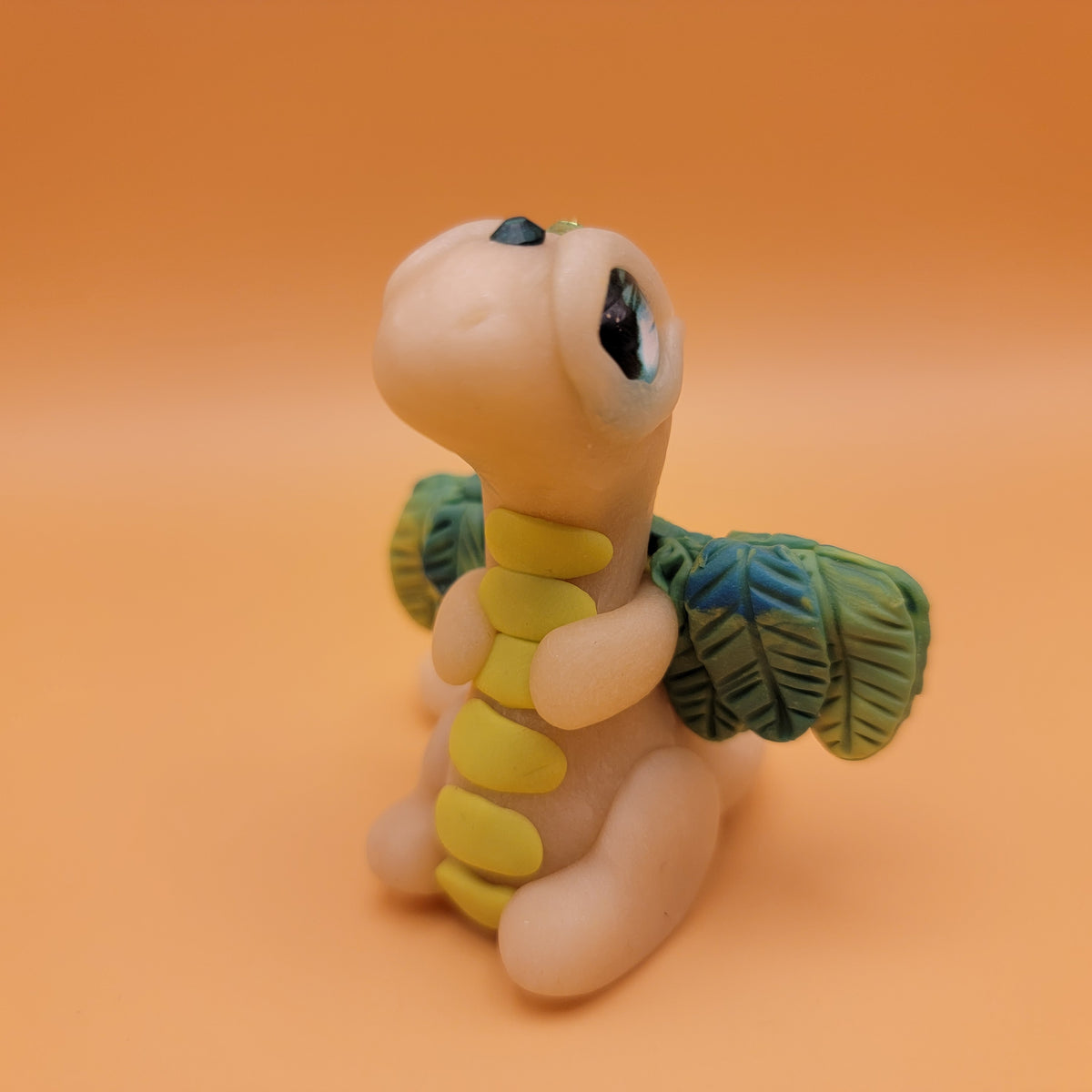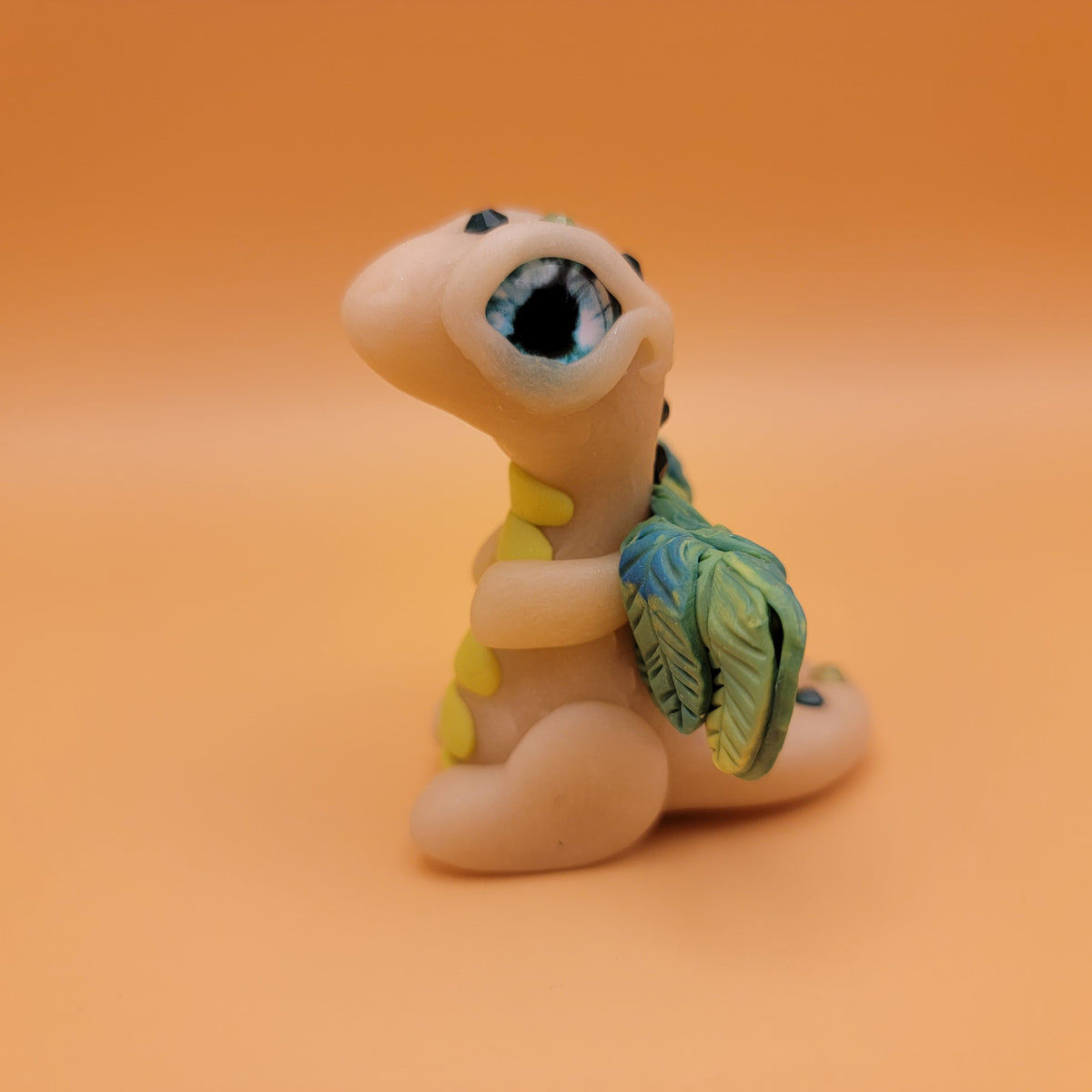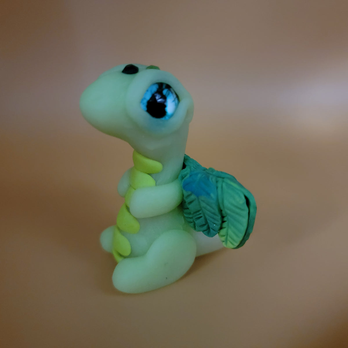 A glowing little dragon with colorful green wings, glass eyes, and rhinestones trailing down its back and tail. The only one of its kind!