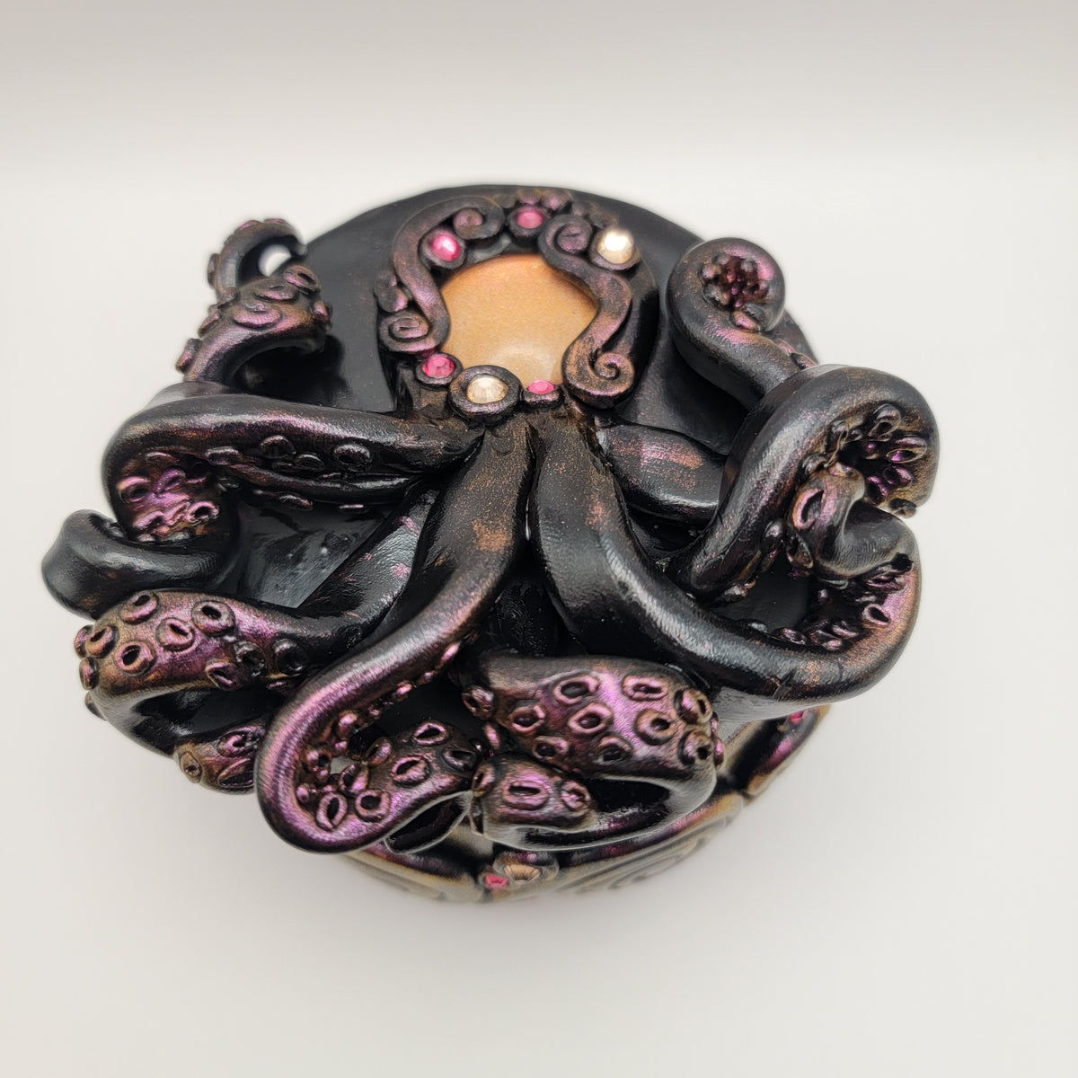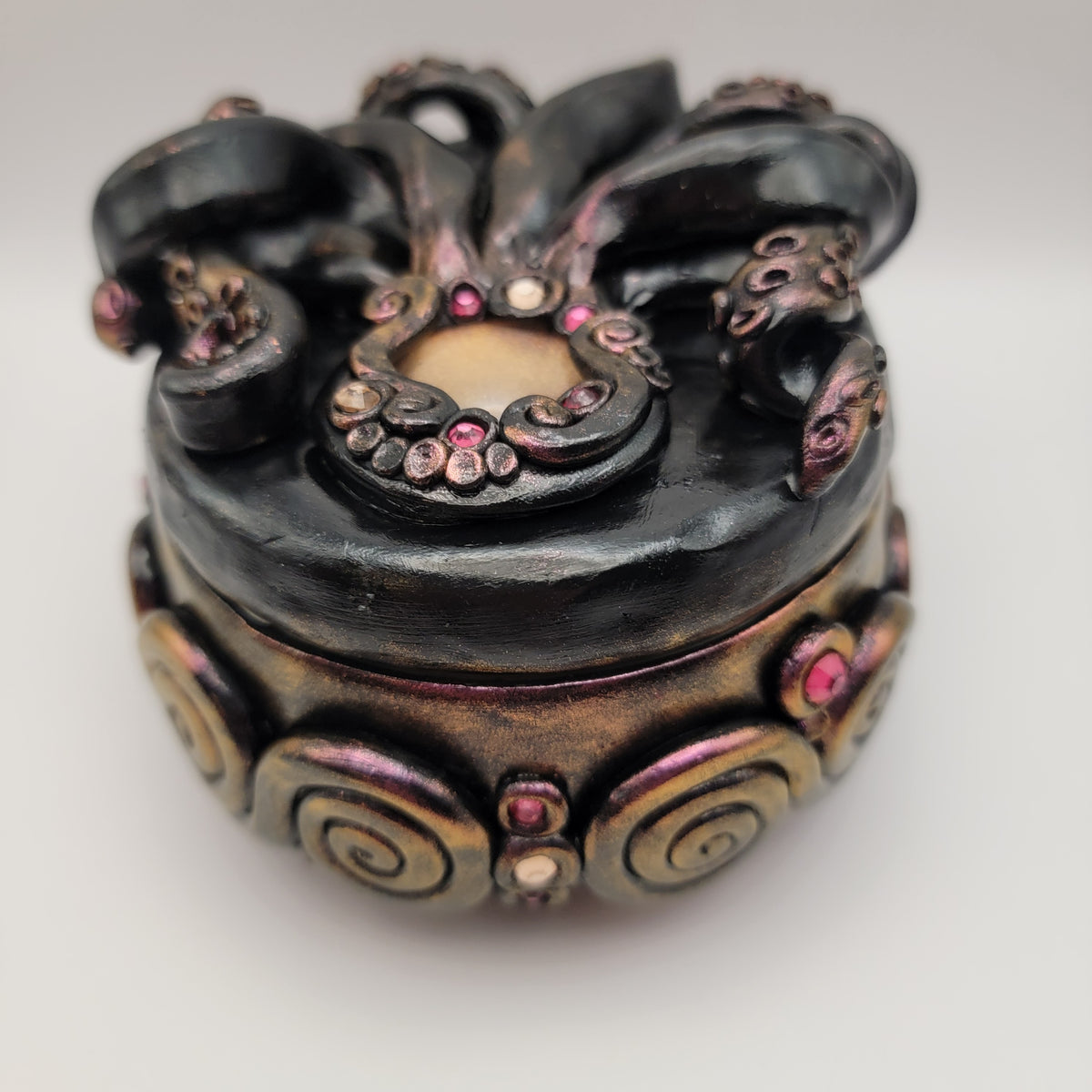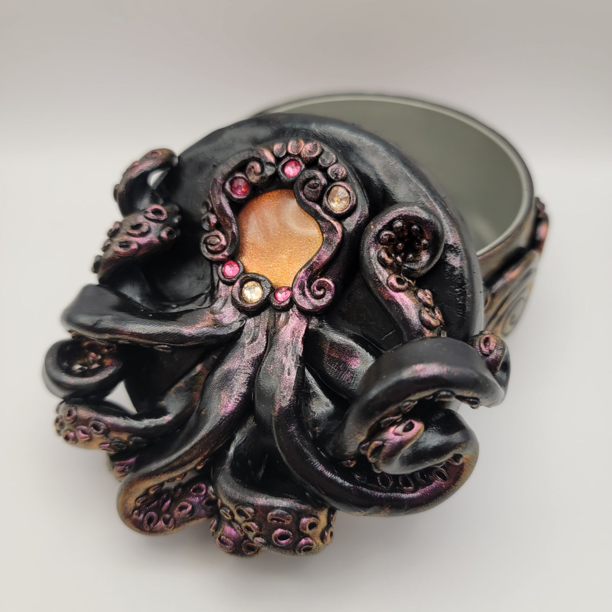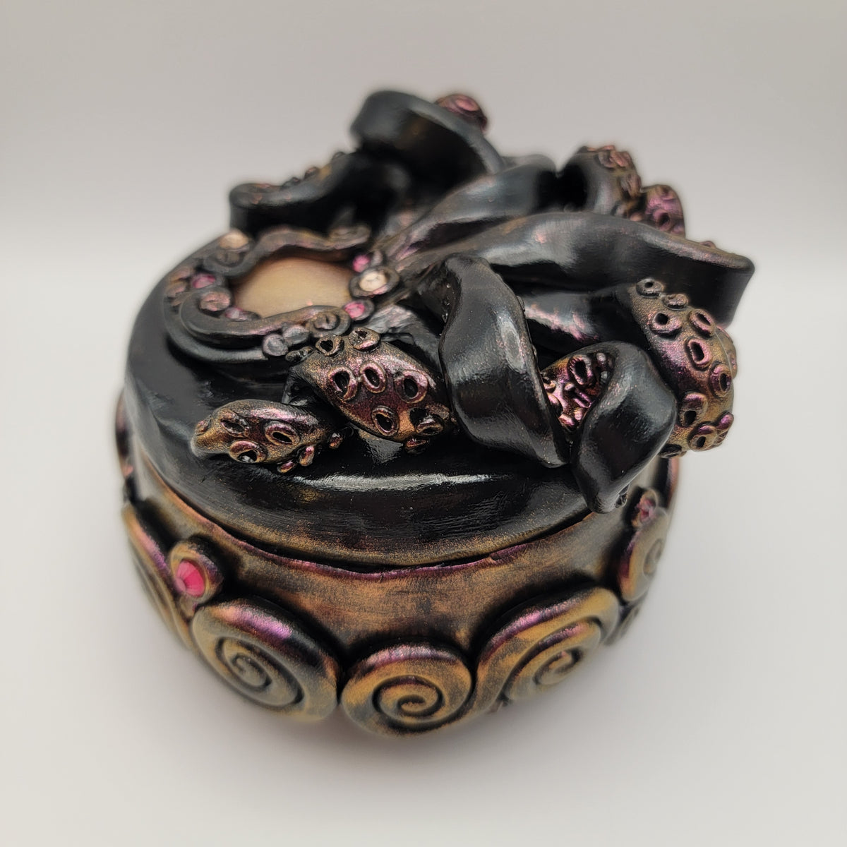 A unique polymer clay trinket box featuring an octopus. Made with black clay and accented with chameleon powder and rhinestones, it has winding tentacles and a head built around a painted glass cabochon that takes on a rainbow shimmer depending on the light.