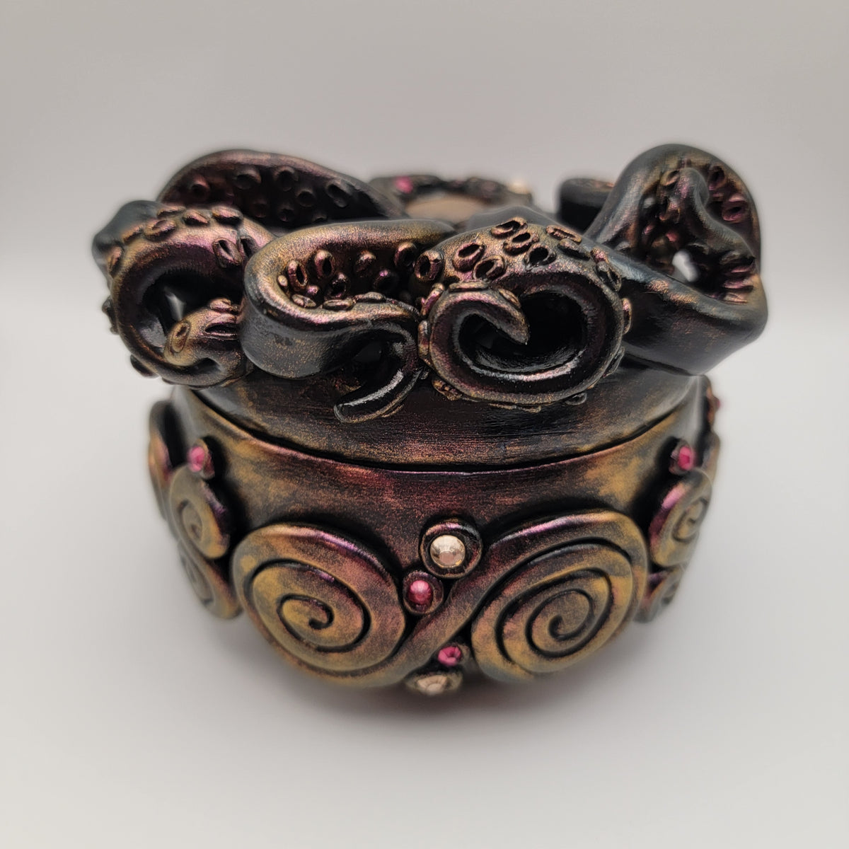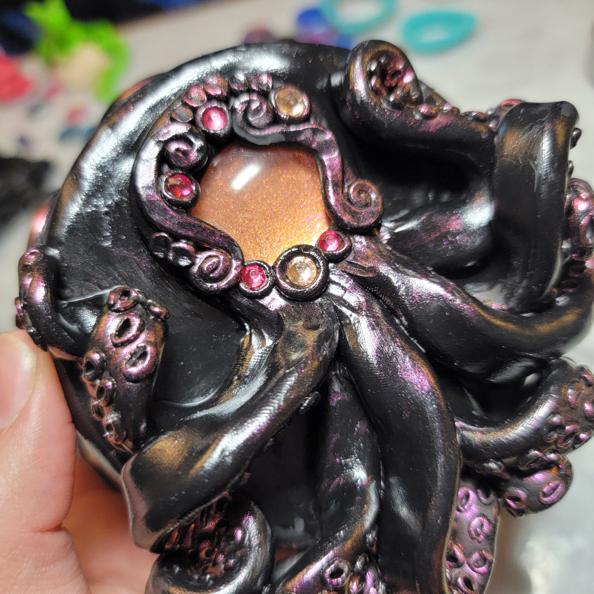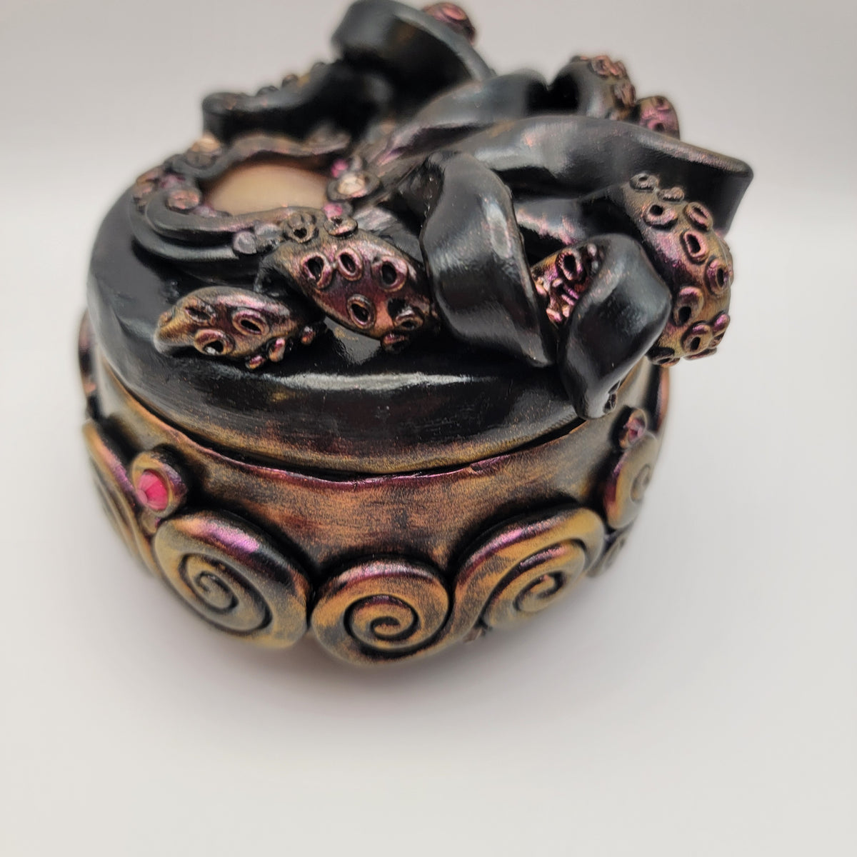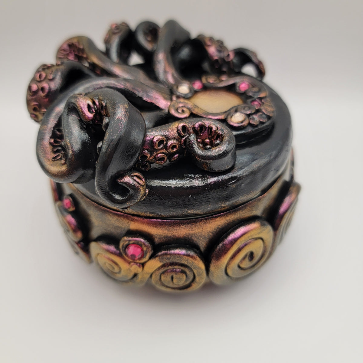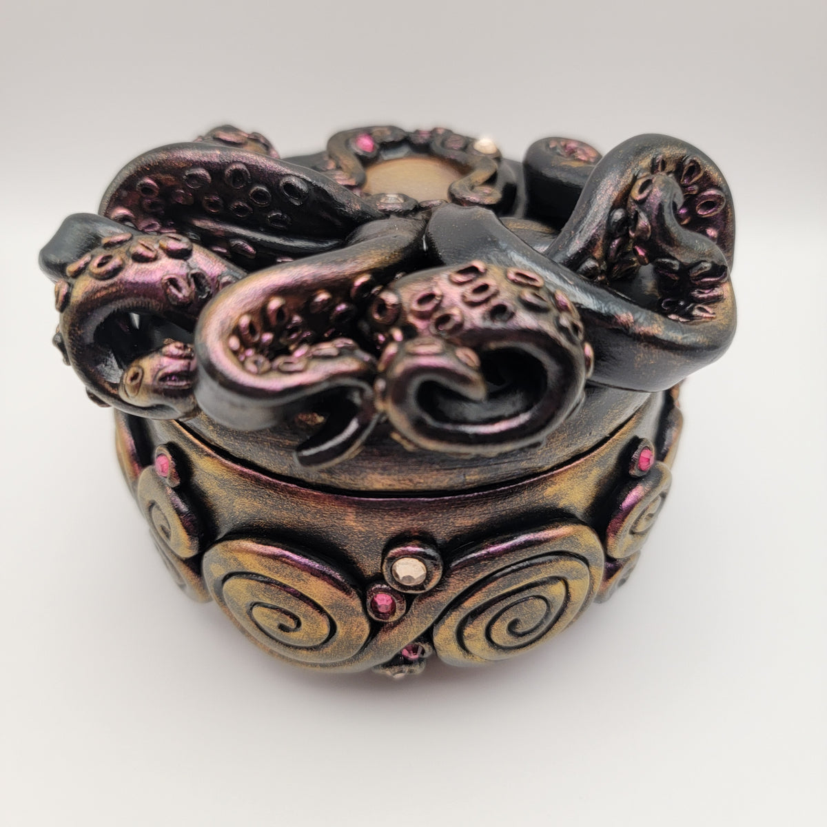 A unique polymer clay trinket box featuring an octopus. Made with black clay and accented with chameleon powder and rhinestones, it has winding tentacles and a head built around a painted glass cabochon that takes on a rainbow shimmer depending on the light.