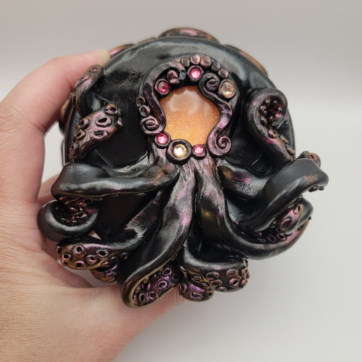 It has been brushed with a shimmering pink chameleon powder that shows off the suckers on the tentacles. The base of the box features swirls and rhinestones in various shades of pink, along with a delightful shimmer. Coated with gloss glaze for extra shine.