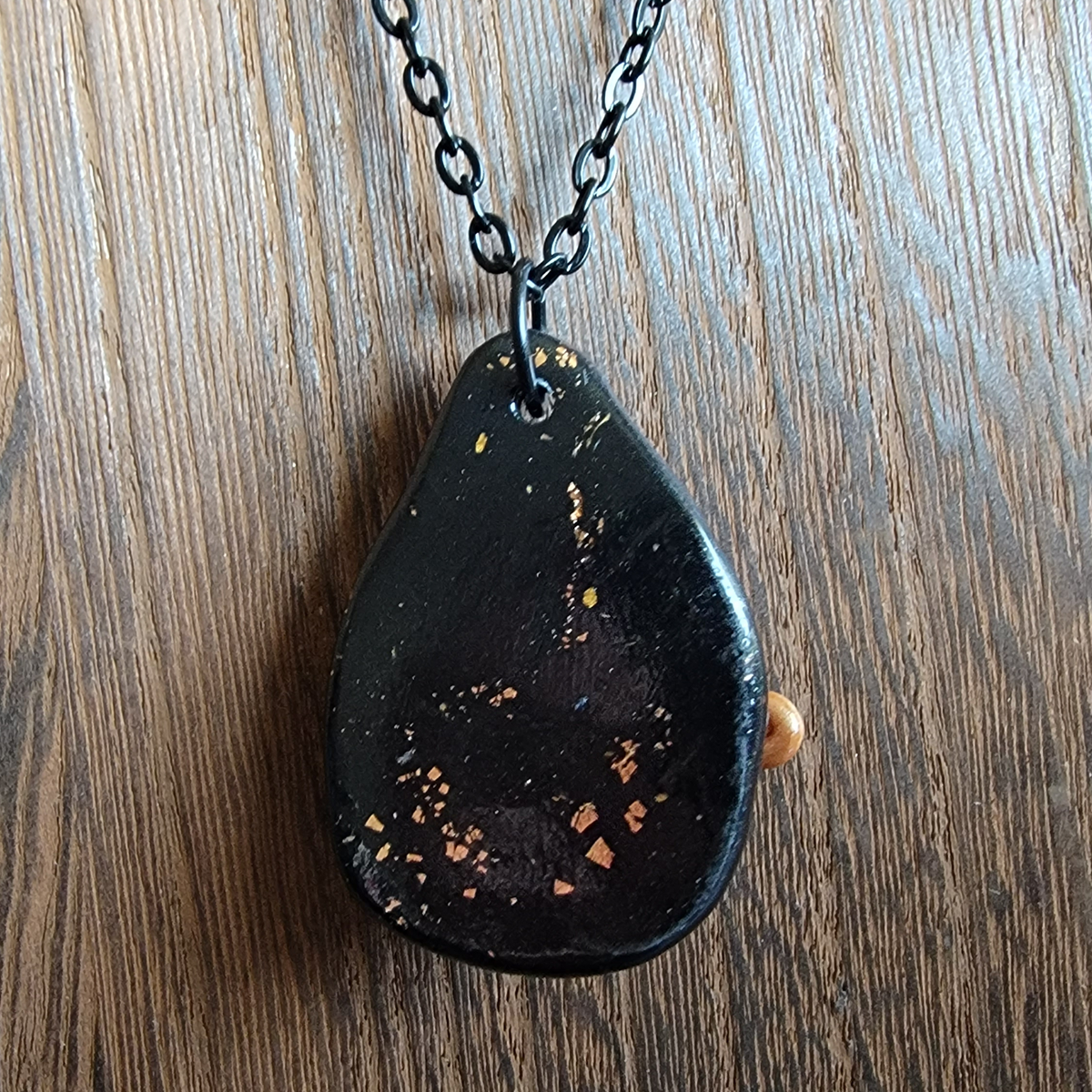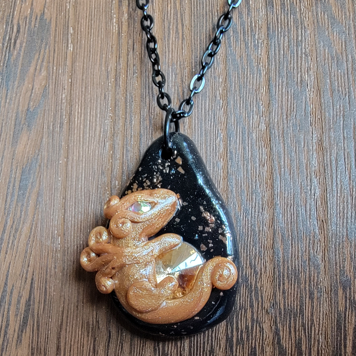 The this little shimmery rose gold dragon is hand sculpted and has a Preciosa rhinestone eye. The background is black with imitation rose gold foil flakes. The pendant has been sealed with a glaze for extra shine and protection.