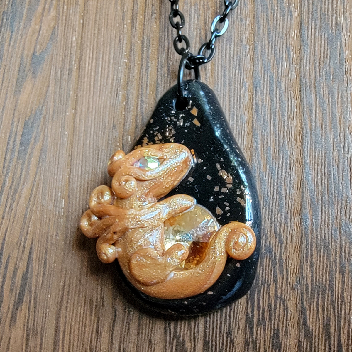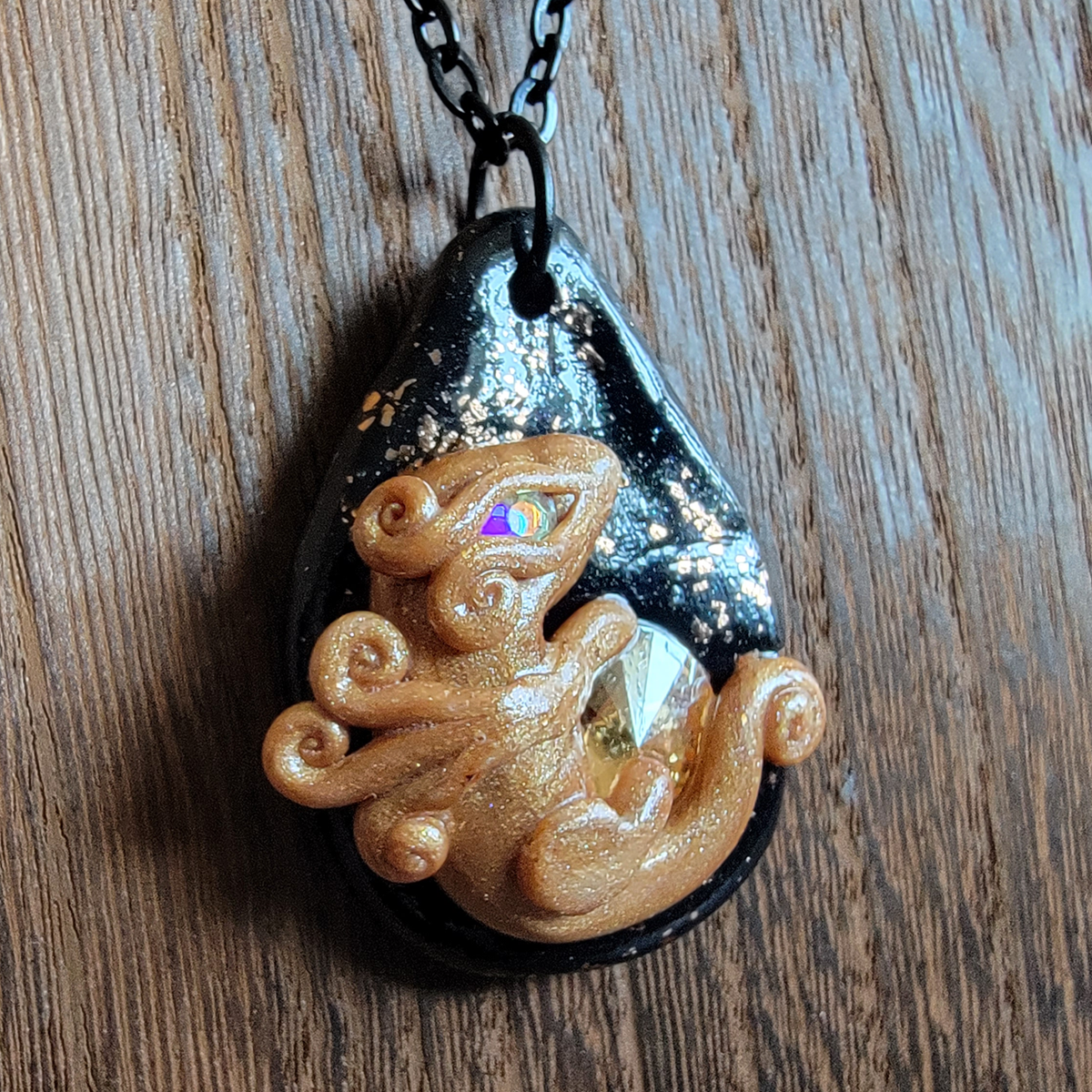 A polymer clay dragon pendant wrapped up around it's Swarovski crystal treasure, a rivoli crystal.