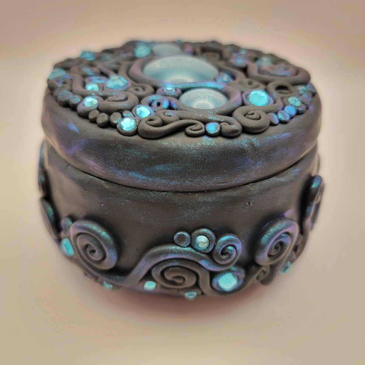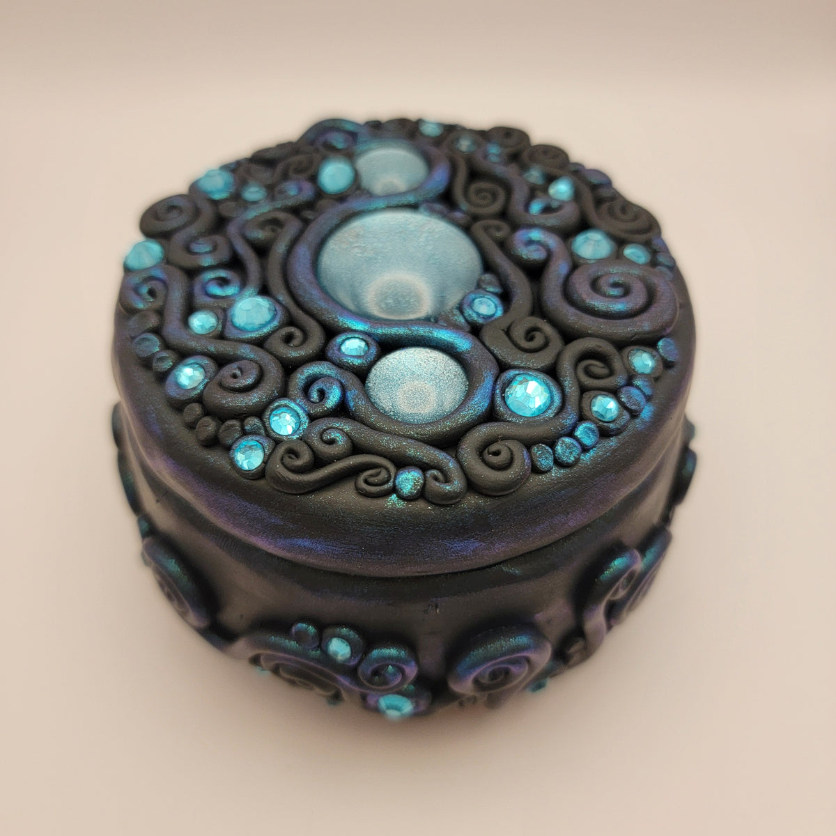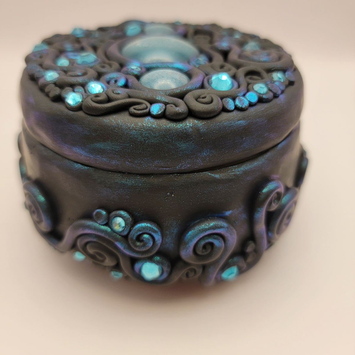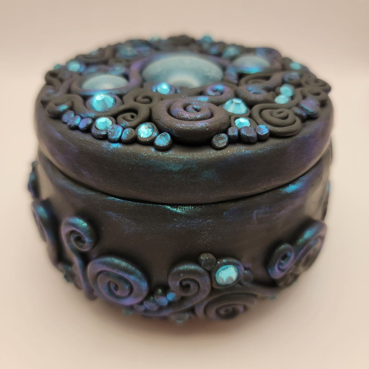 A shimmering trinket box with turquoise against black clay. It features three painted glass cabochons on its lid, and has rhinestones spread across the top. Selected swirls are brushed with chameleon powder, accenting the swirls for extra shimmer.
