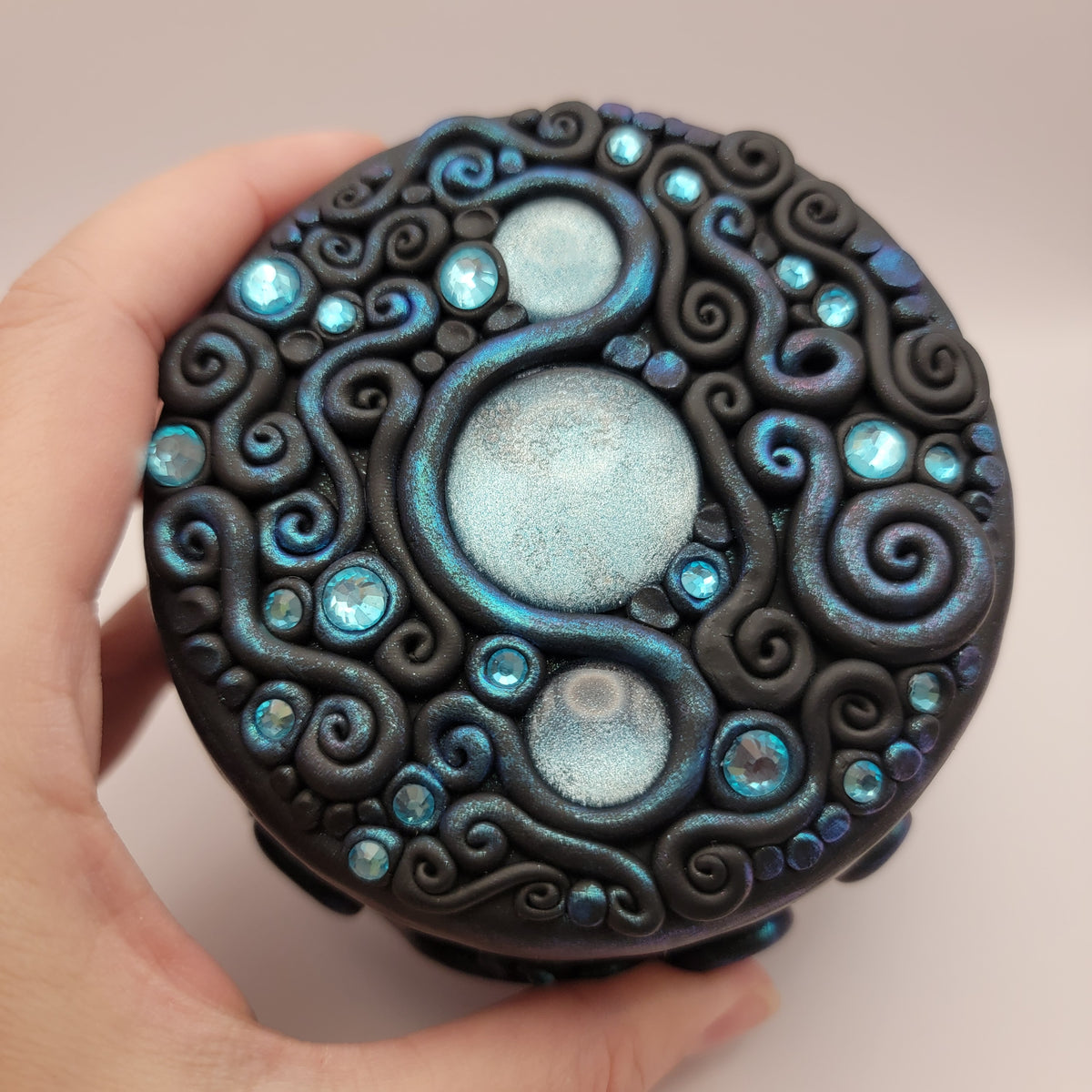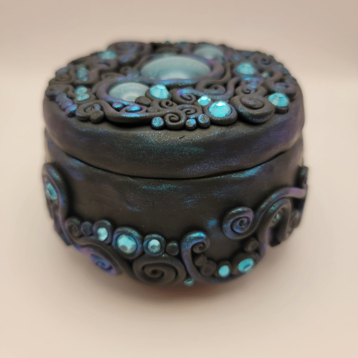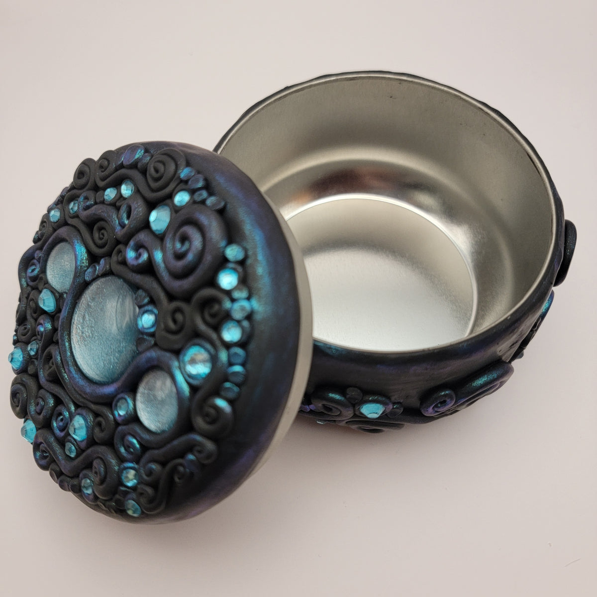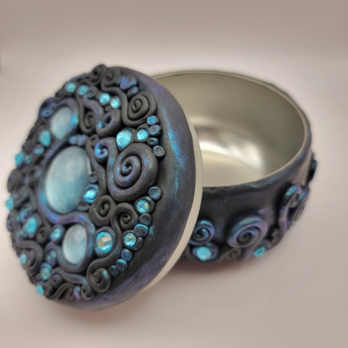 A shimmering trinket box with turquoise against black clay. It features three painted glass cabochons on its lid, and has rhinestones spread across the top. Selected swirls are brushed with chameleon powder, accenting the swirls for extra shimmer.