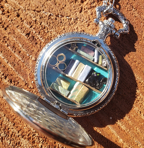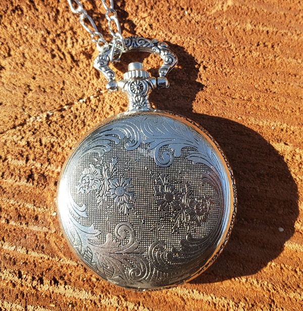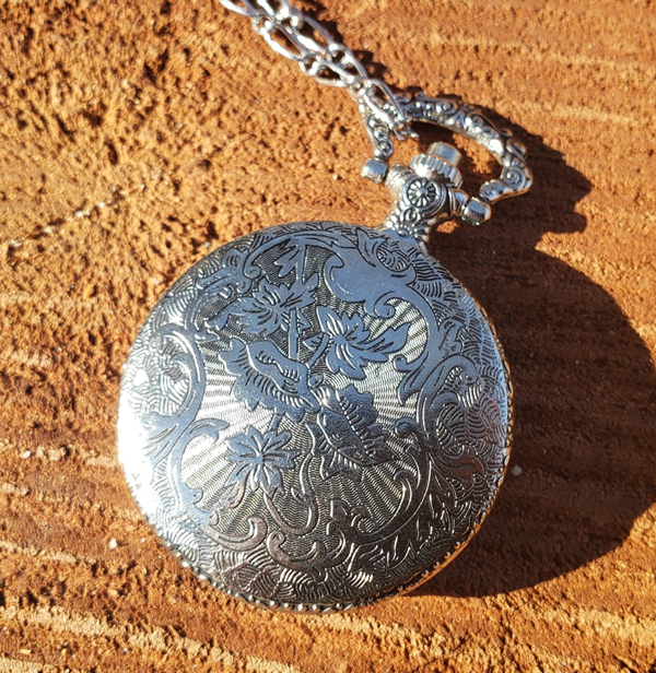 All elements are glued in place and sealed with acrylic varnish. All elements are glued in place and sealed with acrylic varnish. Pocket watch cases have a diameter of 45mm. Comes on matching 24 inch chain with a 3 inch extender.