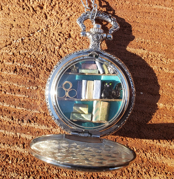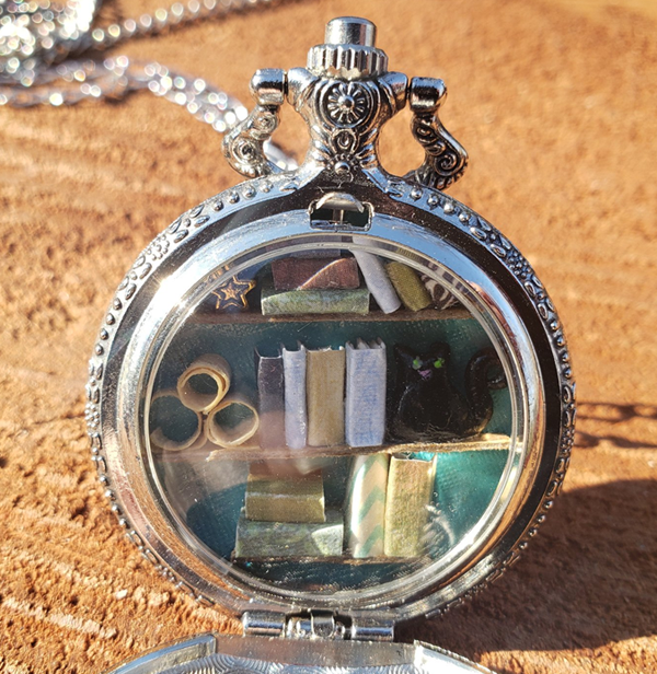 A mysterious little library hidden away inside of a pocket watch case. This magical library has a black cat with green eyes sitting on a shelf, keeping watch over the books and scrolls. There's also a little star sitting on the top shelf.