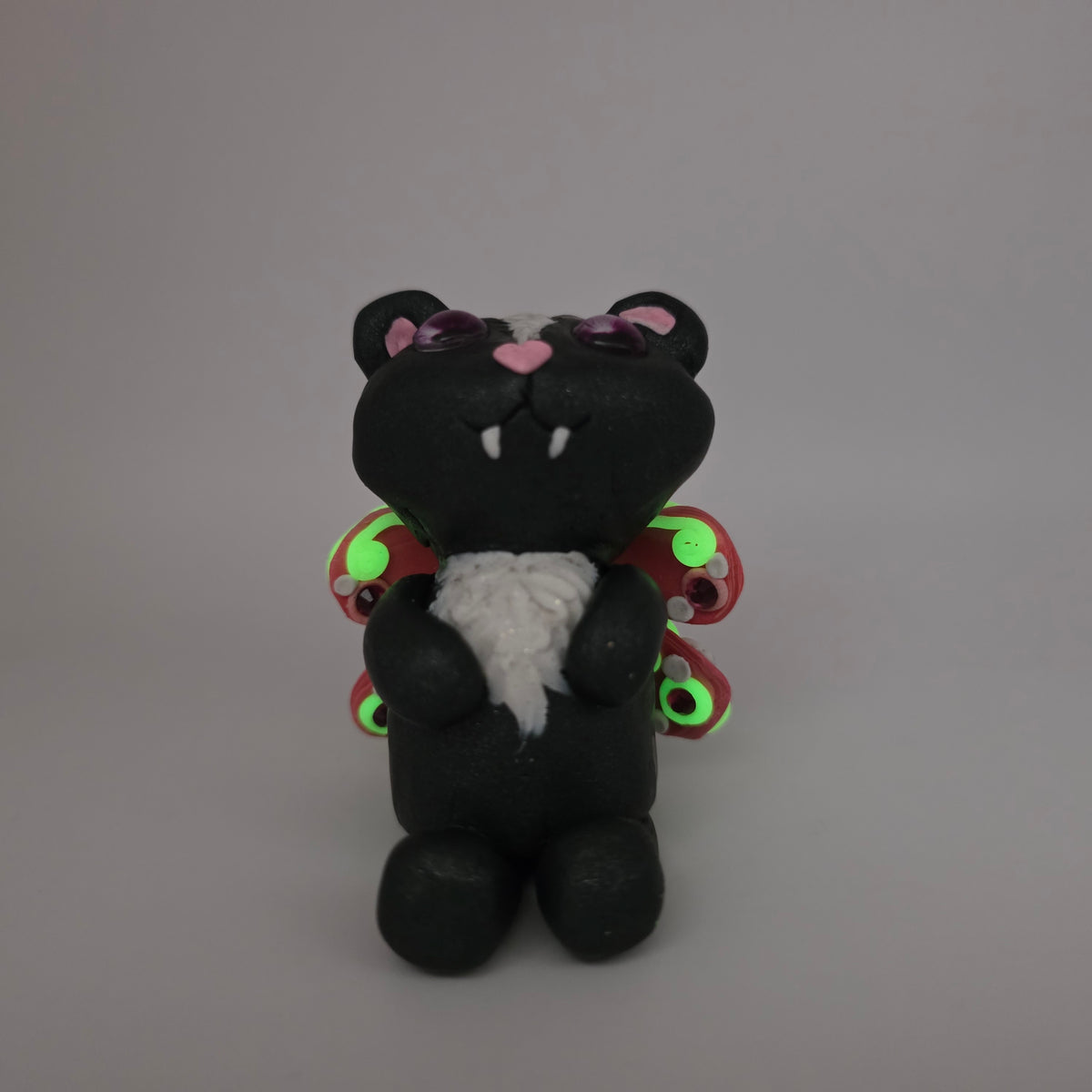 At just over 2 inches tall, Zinnia is handmade and entirely one of a kind. Glowing photos taken after exposure to blacklight.